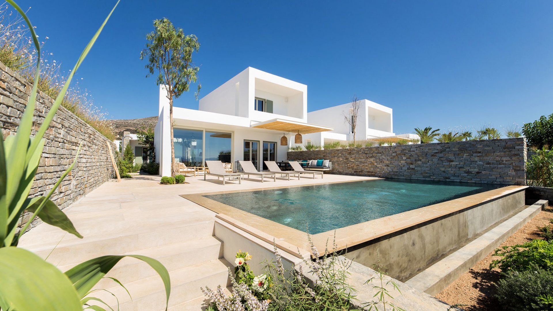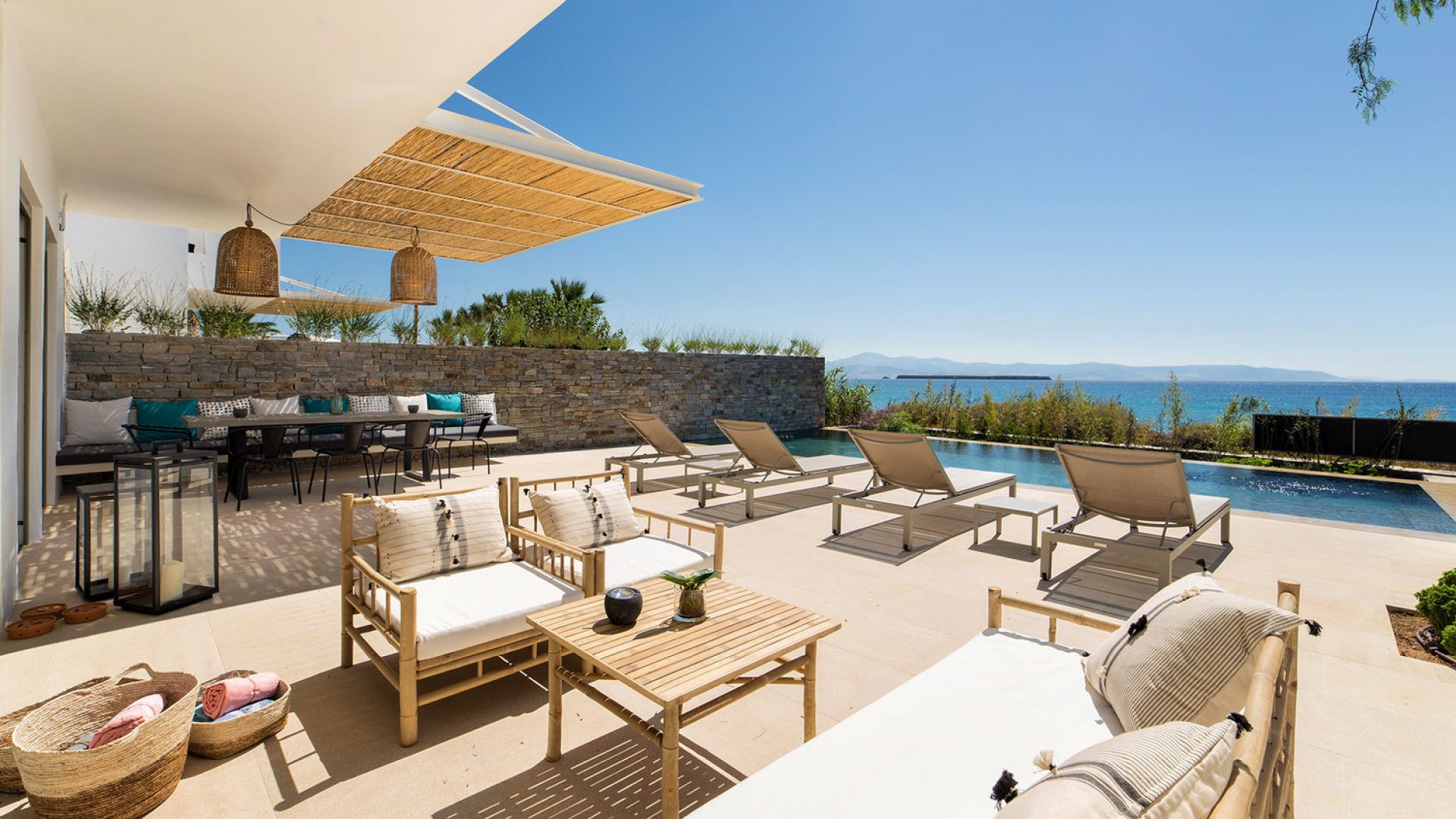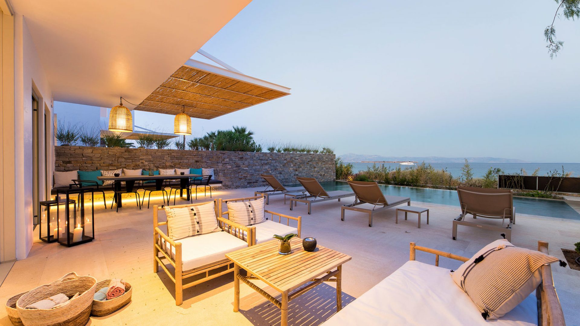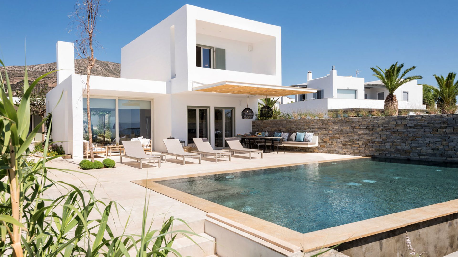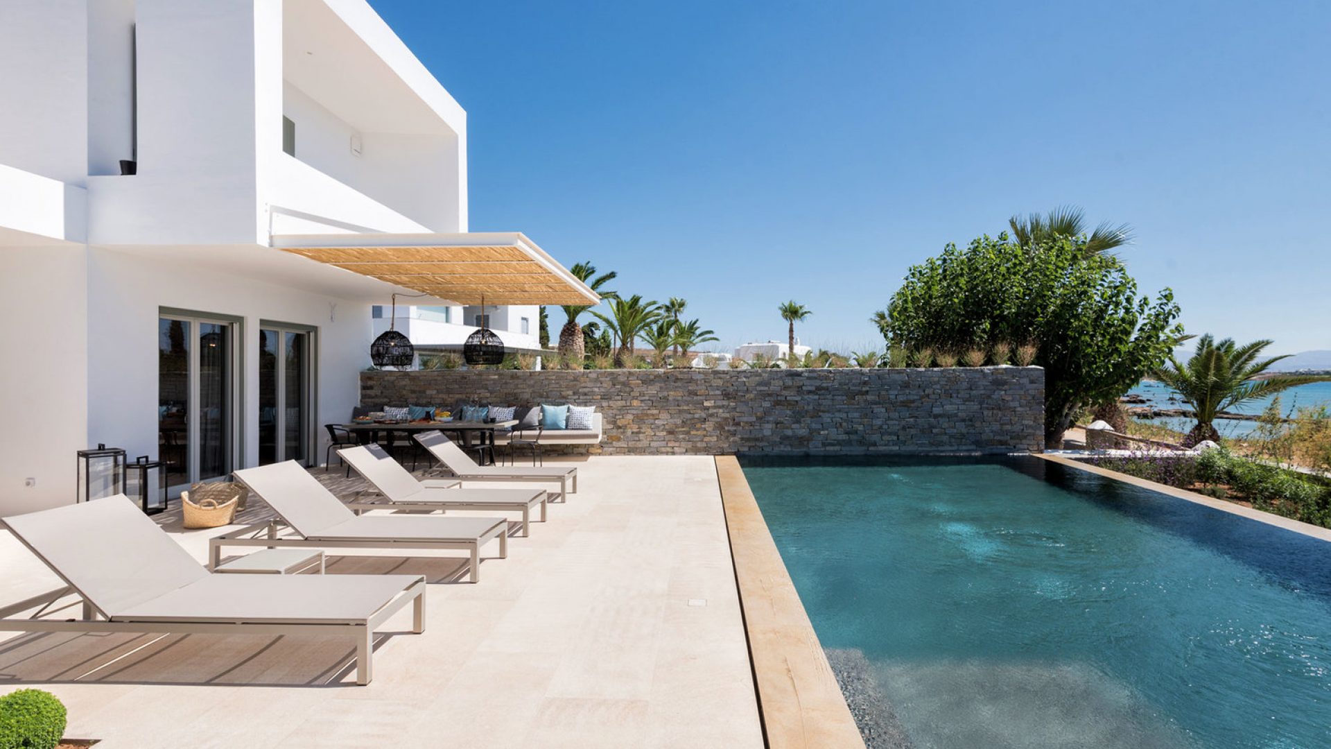 Aeria Estate in Drios, Paros is a combination of two top luxury seafront villas. This holiday rental can accommodate up to 16 guests offering stunning views and luxurious amenities.