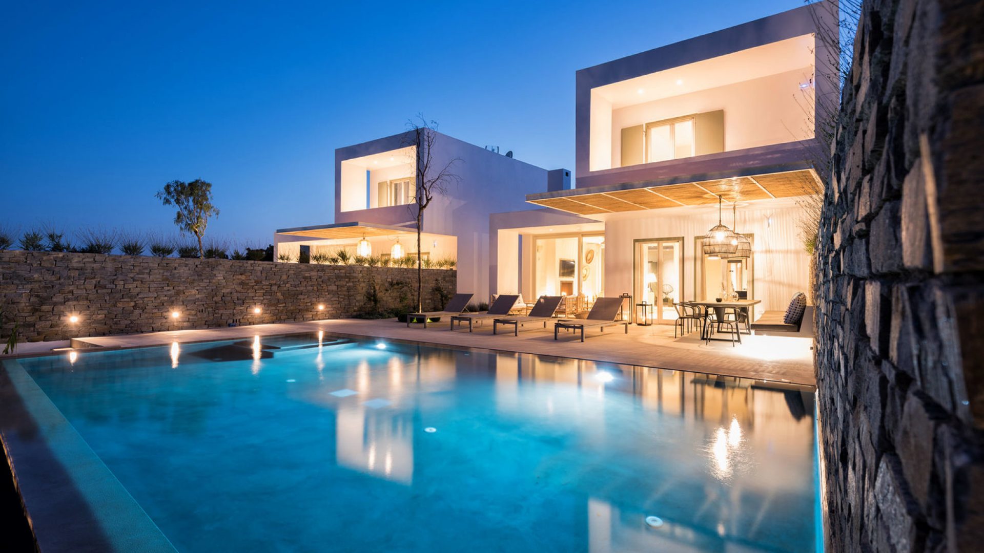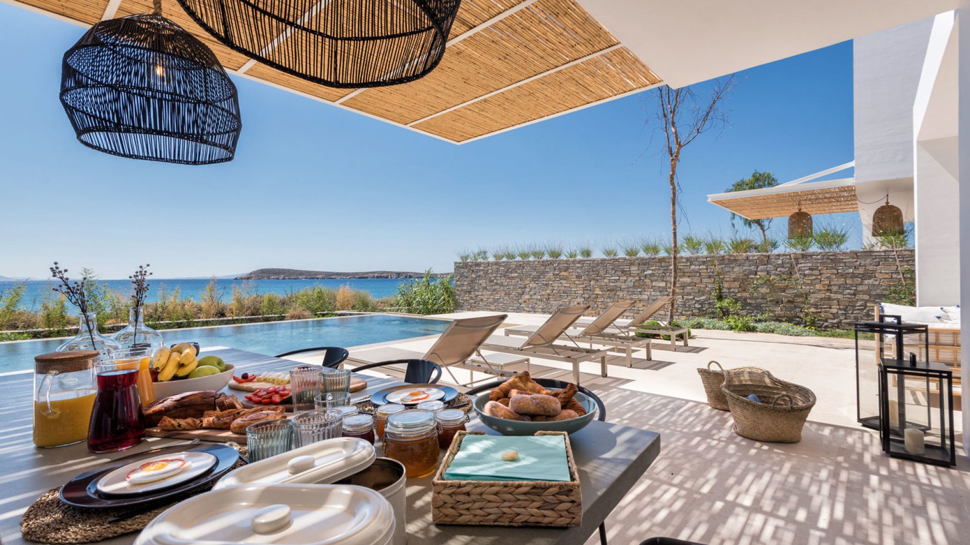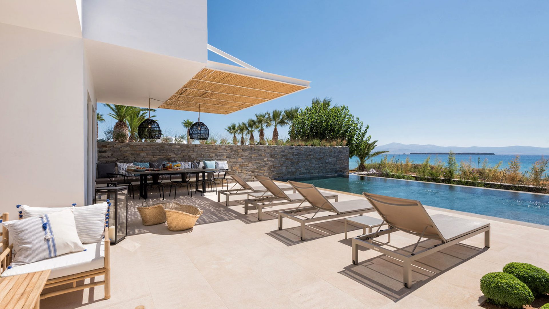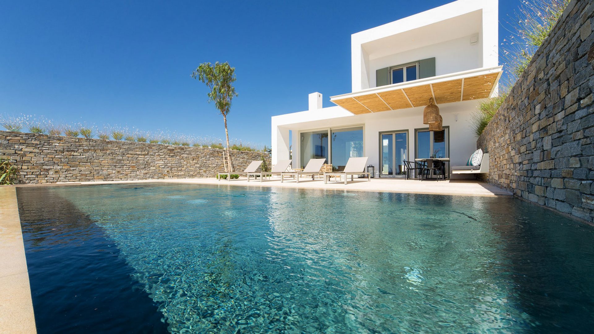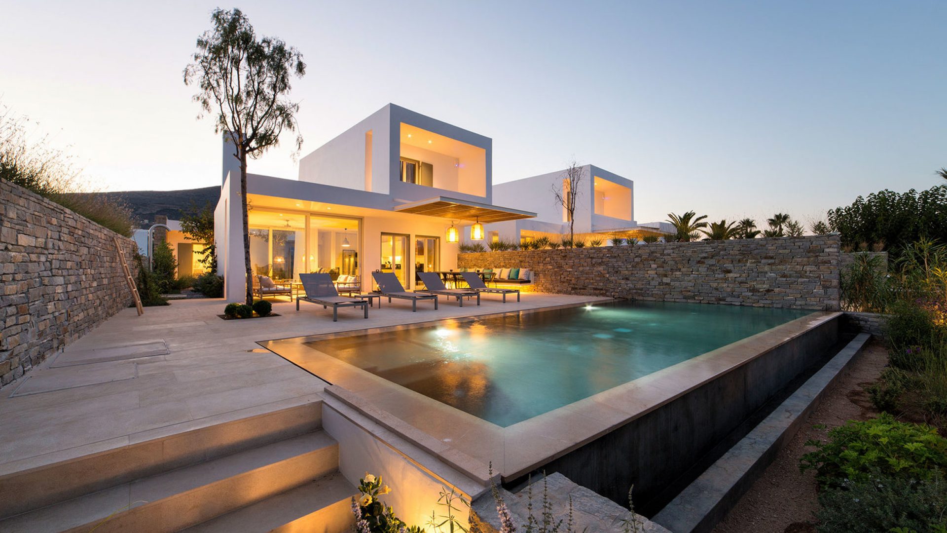 Aeria Estate in Drios, Paros is a combination of two top luxury seafront villas. This holiday rental can accommodate up to 16 guests offering stunning views and luxurious amenities.