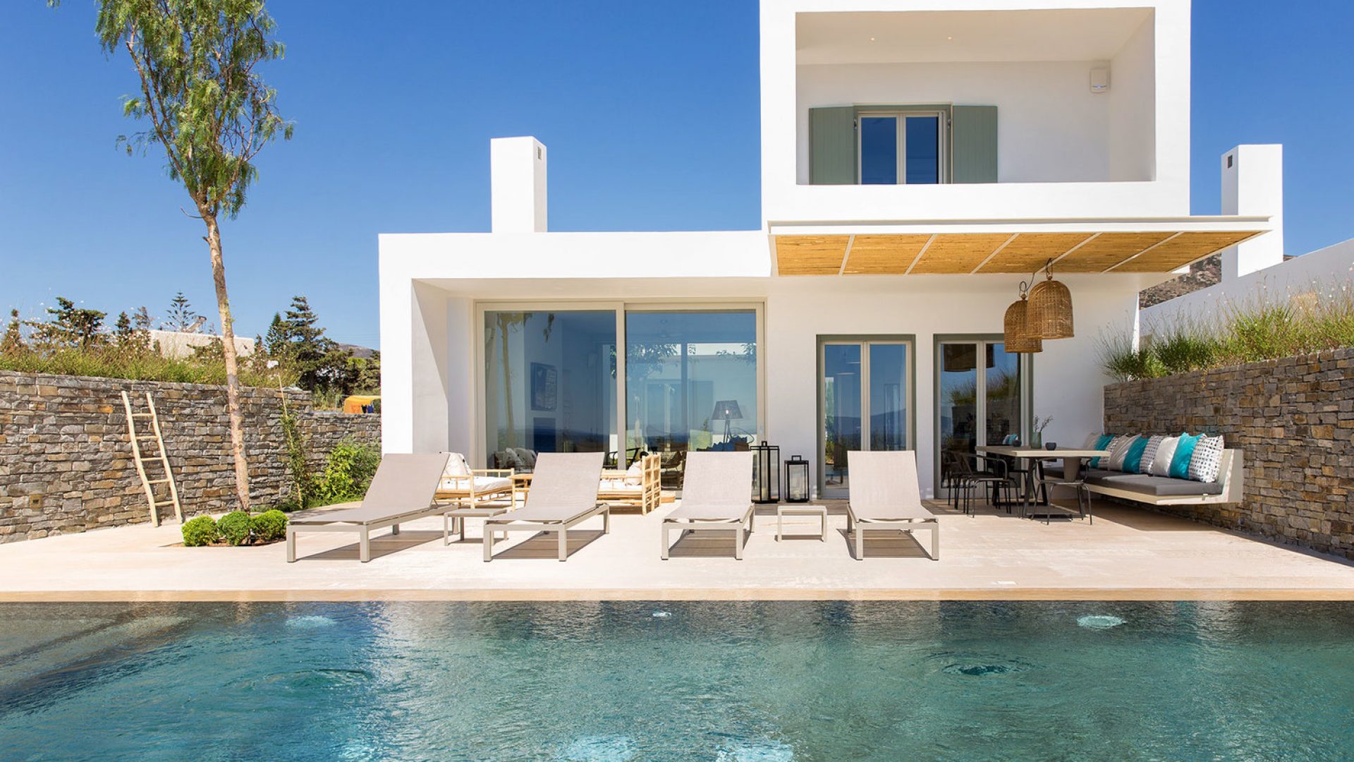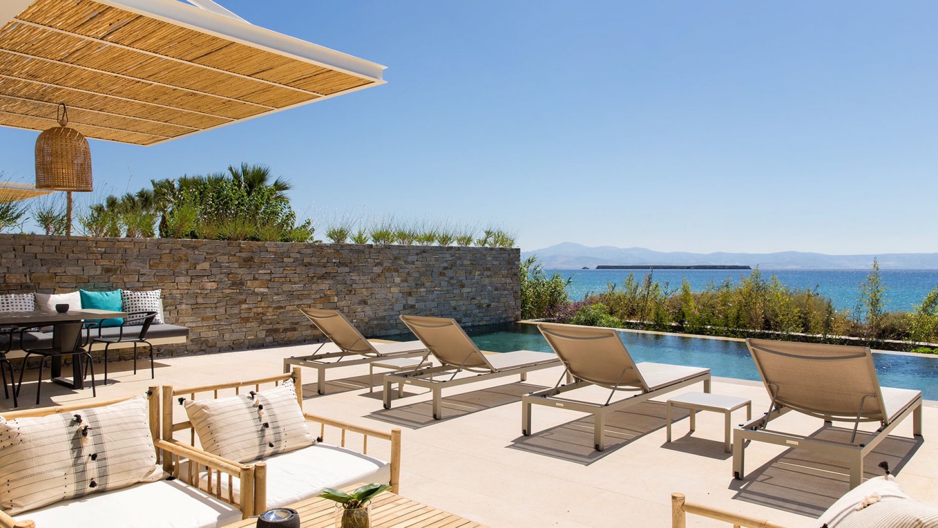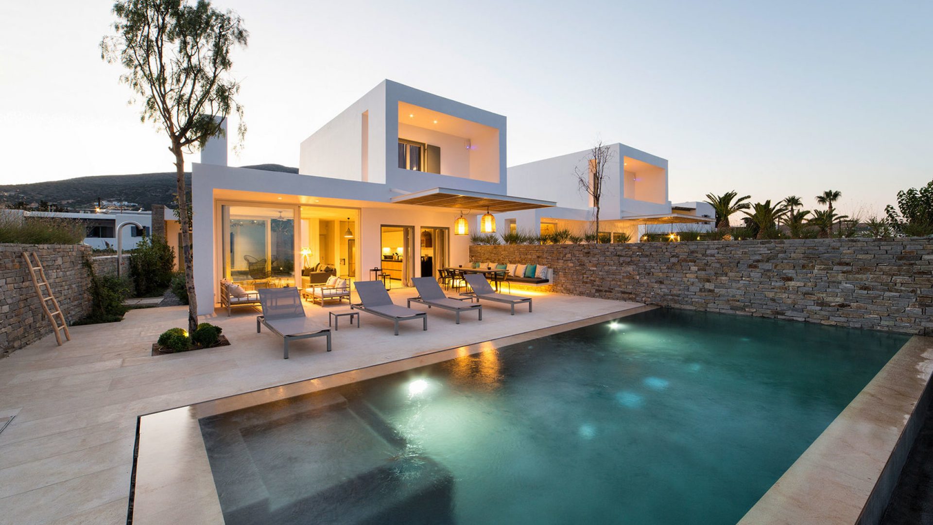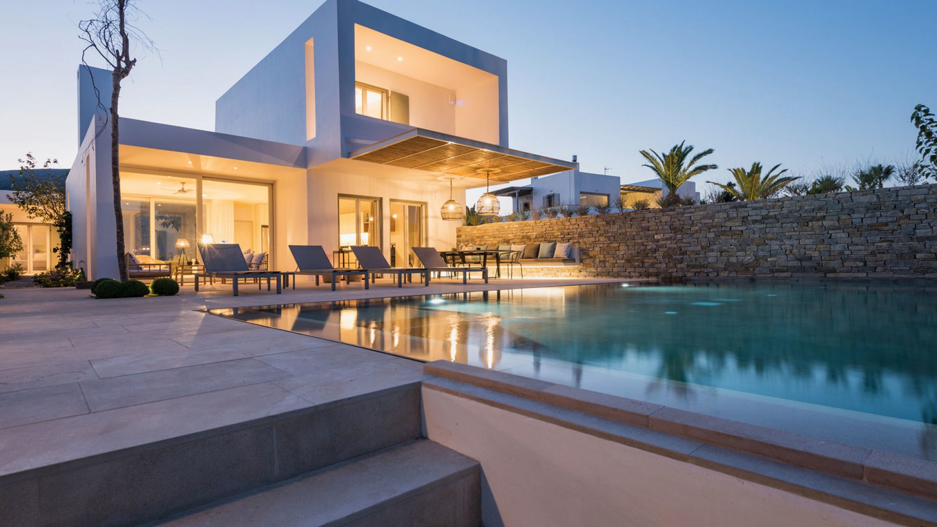 Aeria Estate in Drios, Paros is a combination of two top luxury seafront villas. This holiday rental can accommodate up to 16 guests offering stunning views and luxurious amenities.