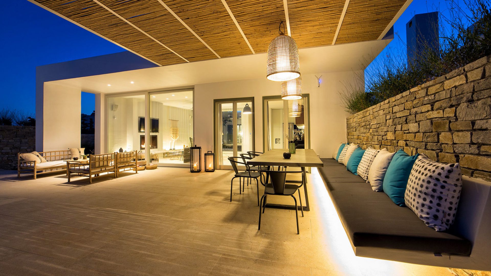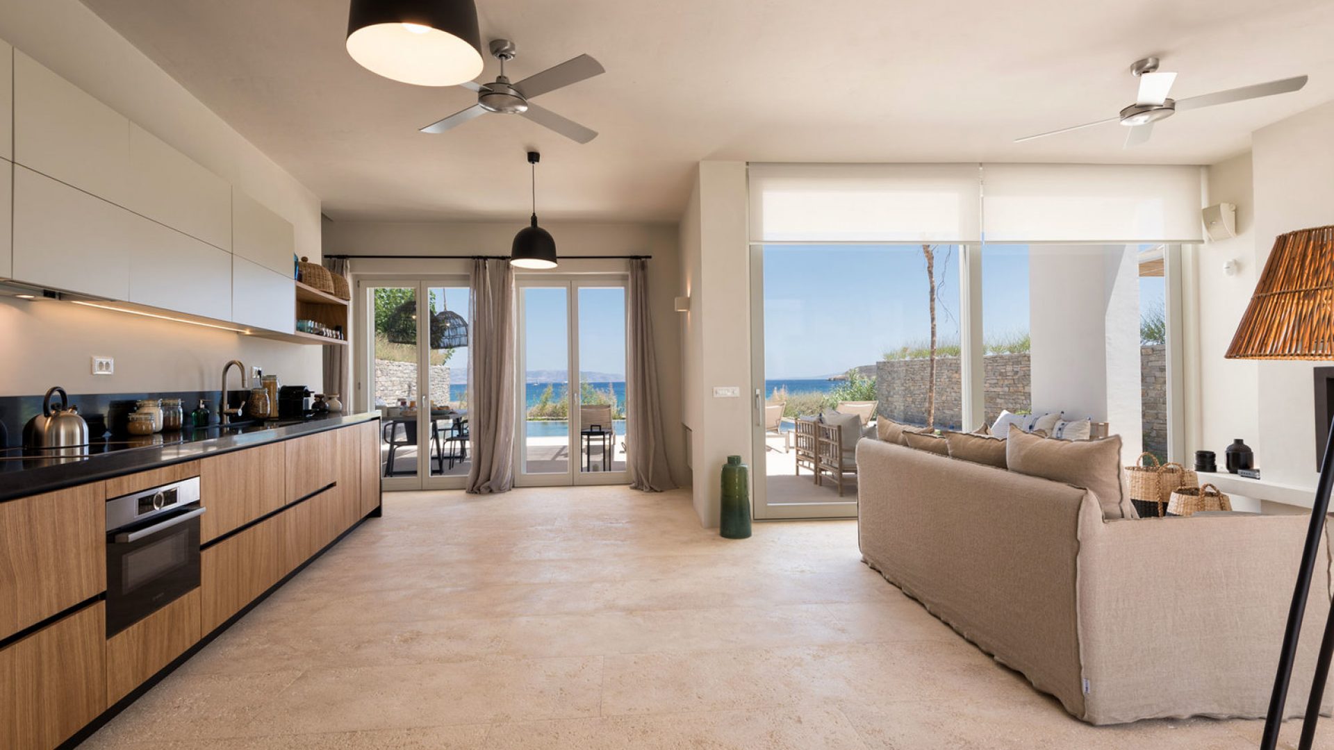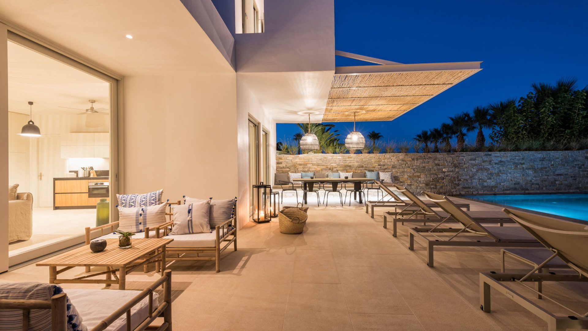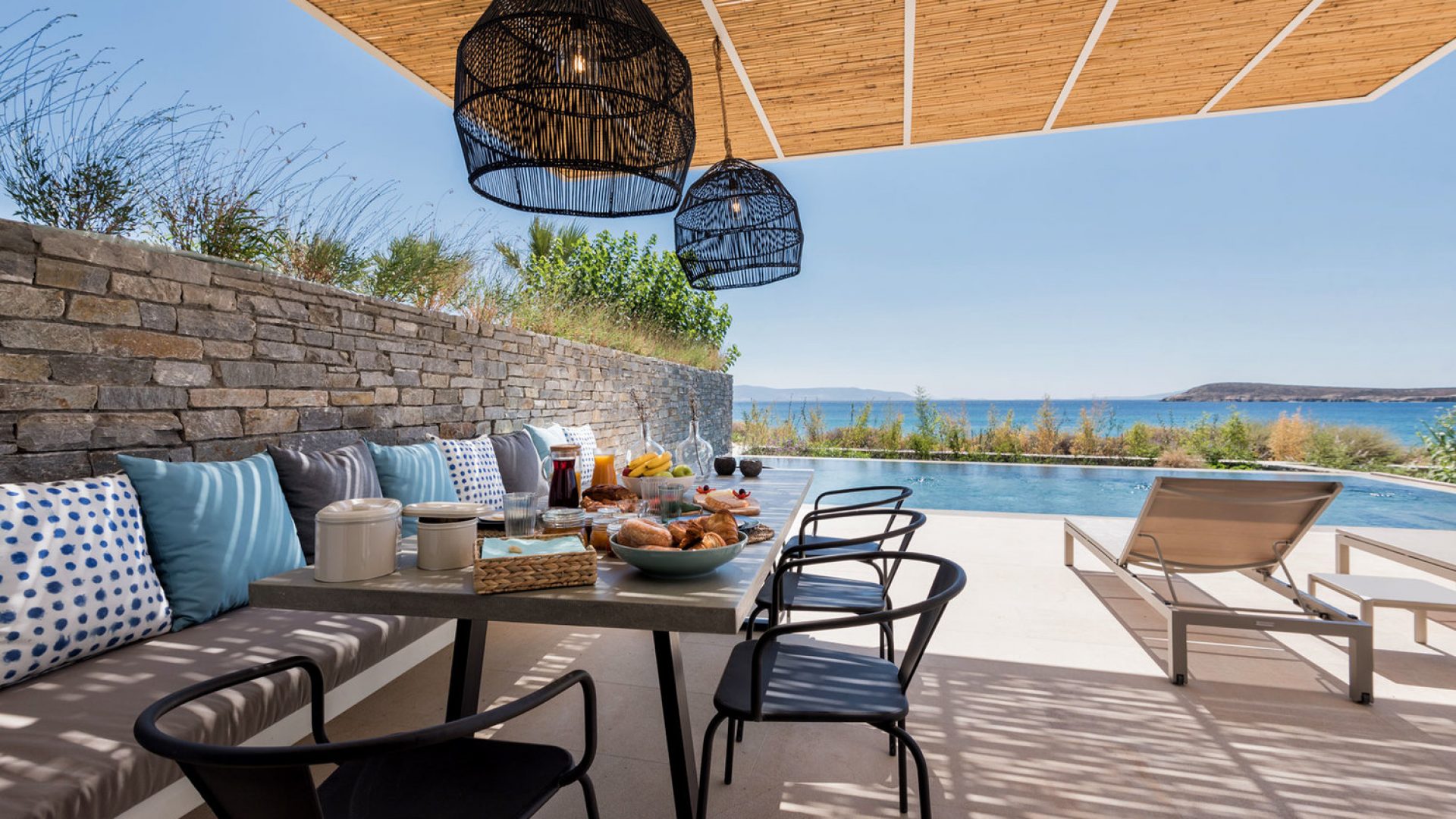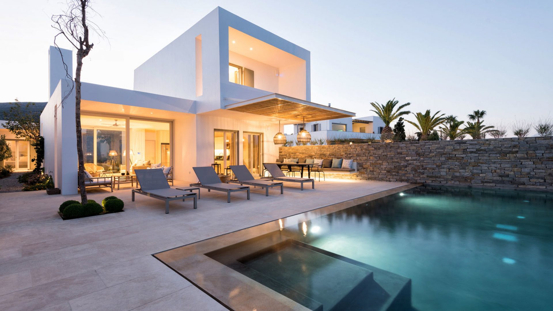 Aeria Estate in Drios, Paros is a combination of two top luxury seafront villas. This holiday rental can accommodate up to 16 guests offering stunning views and luxurious amenities.
