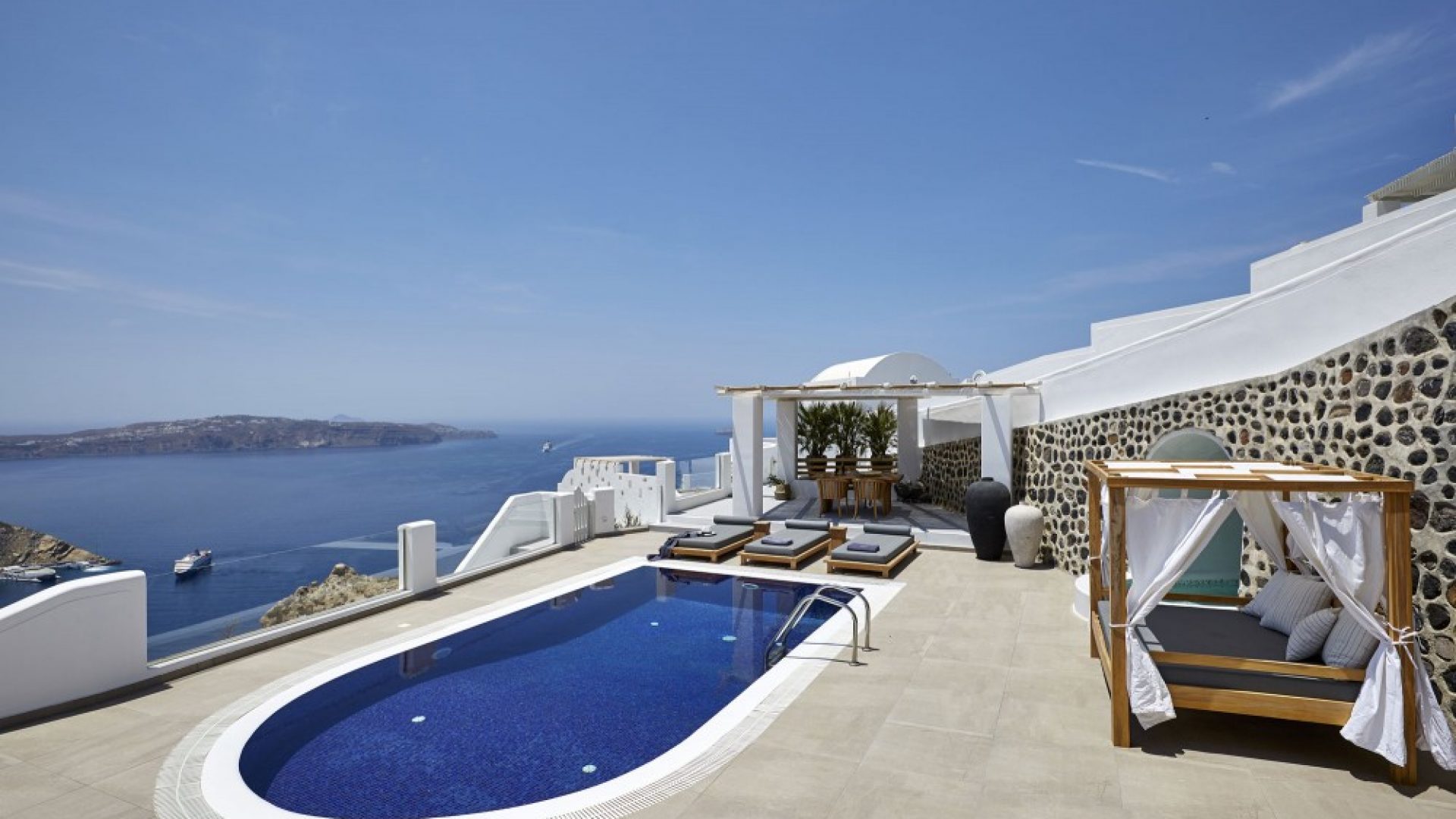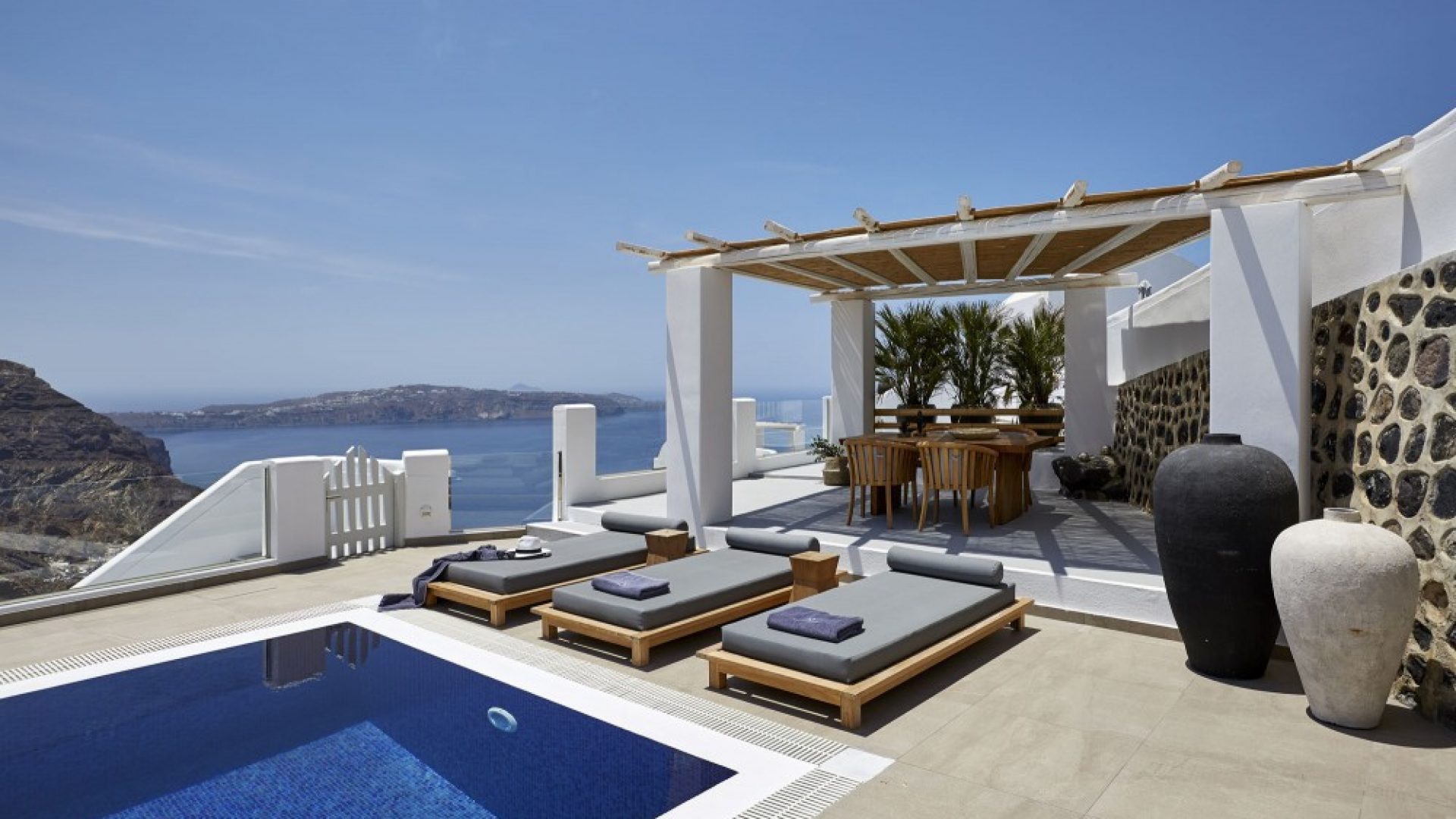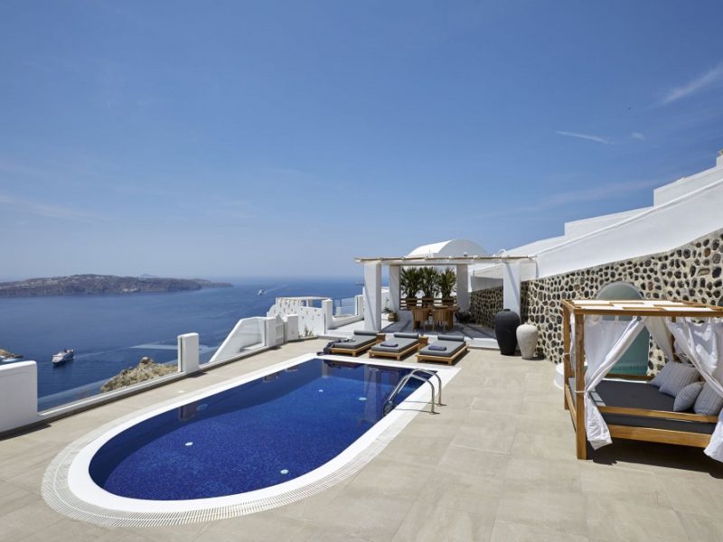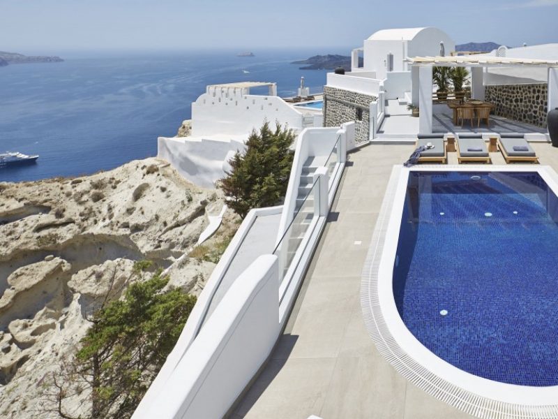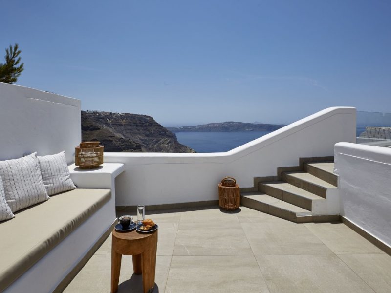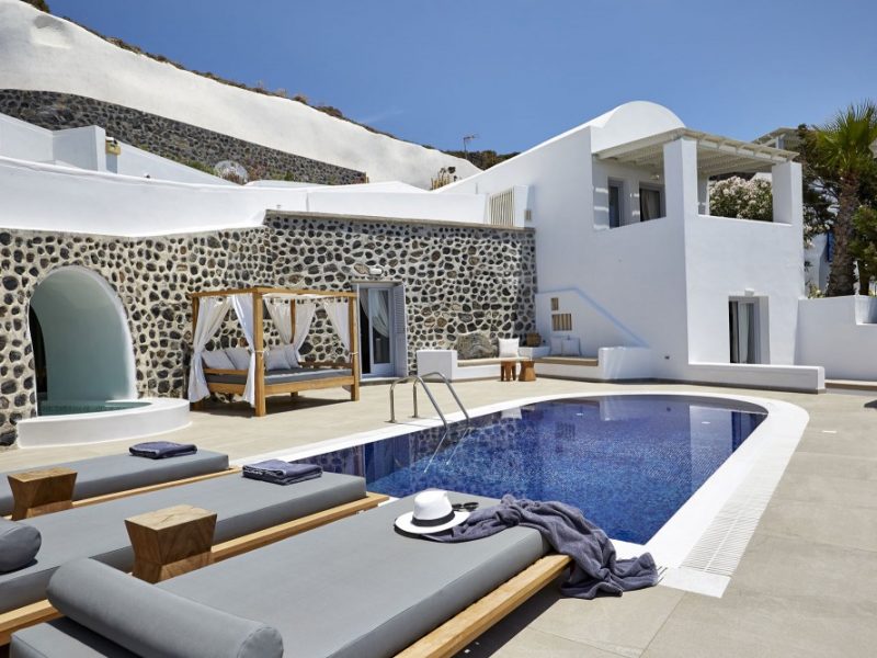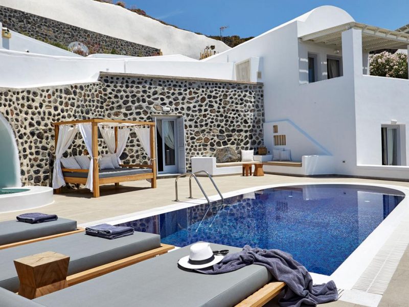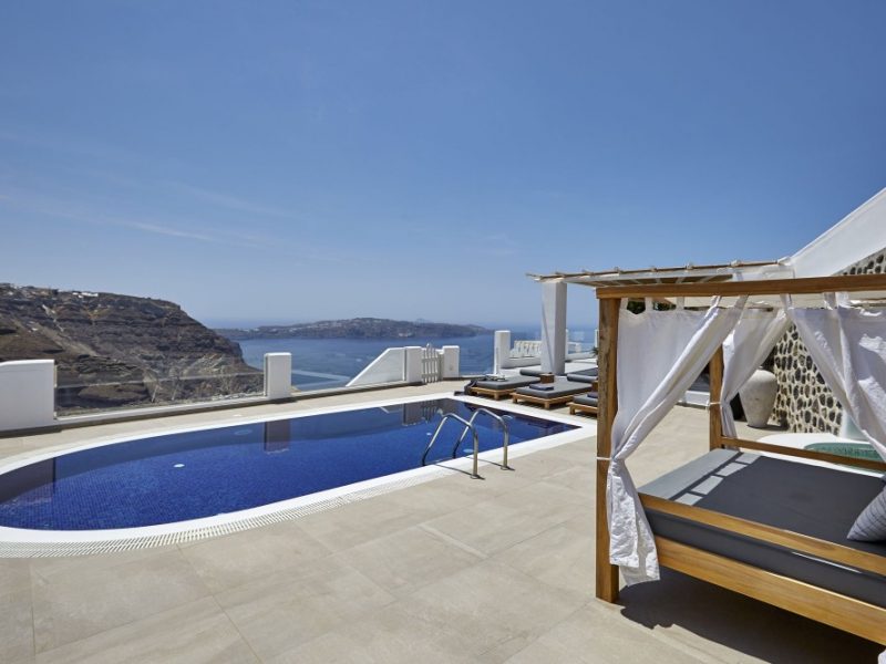 Dramatic views of the Aegean, the volcano, and the spectacular sunset are highlights of your stay in one of the villas.