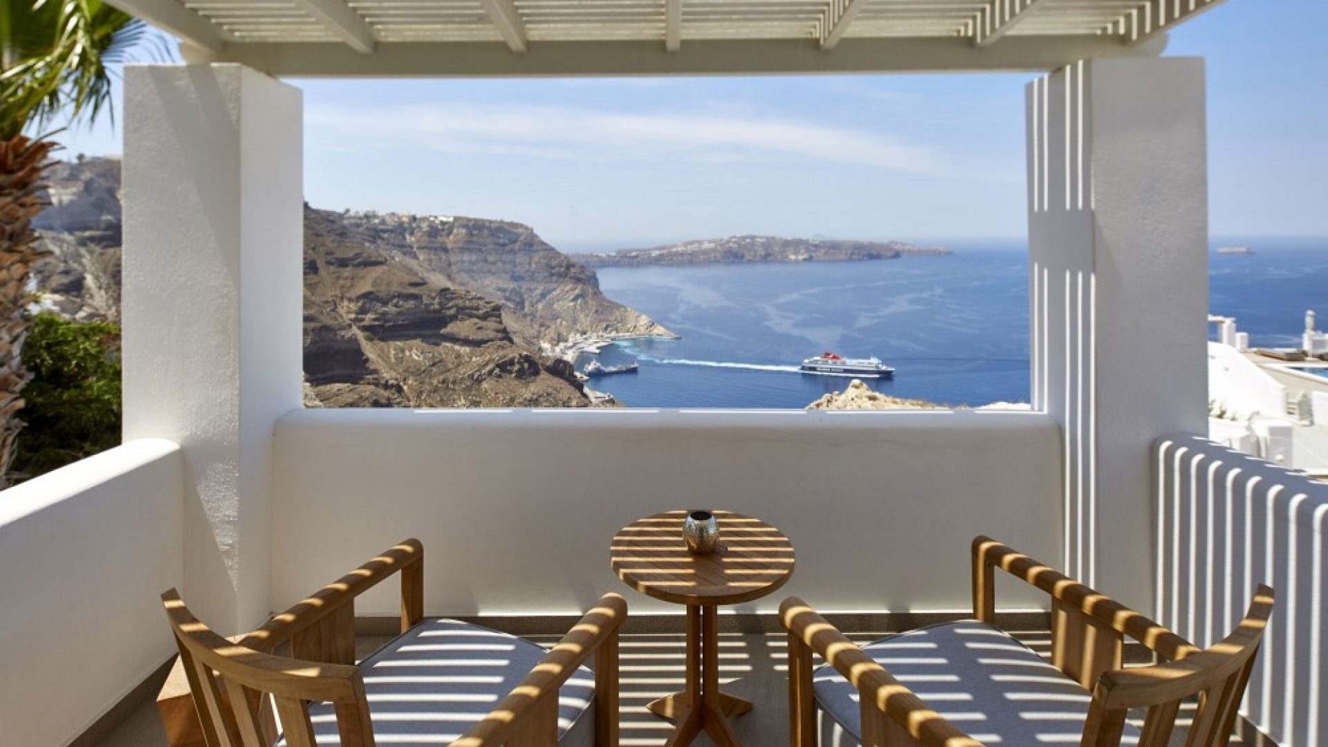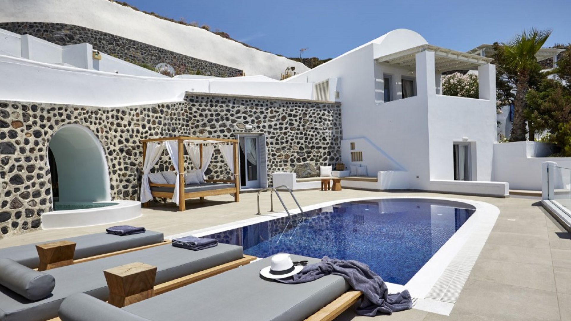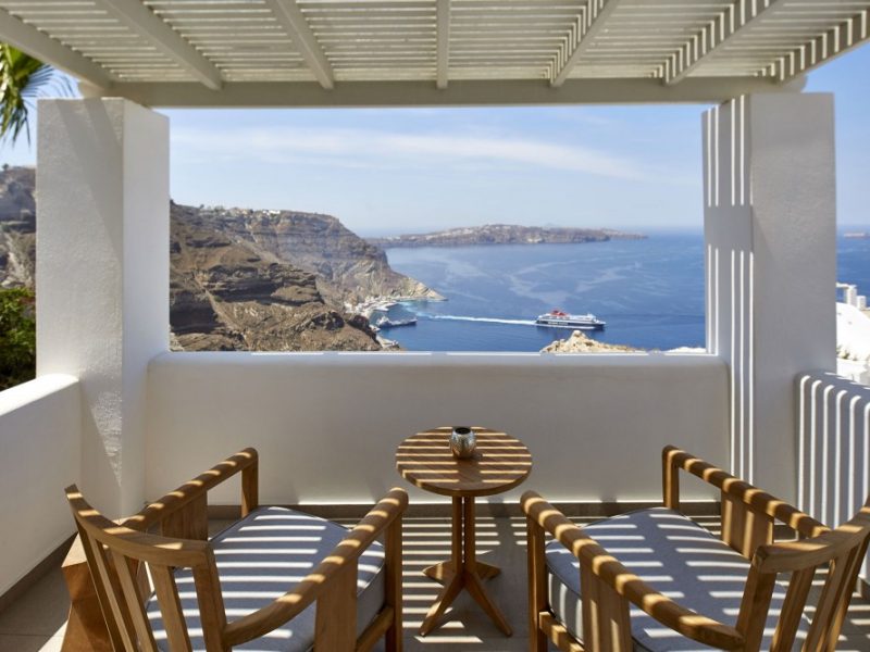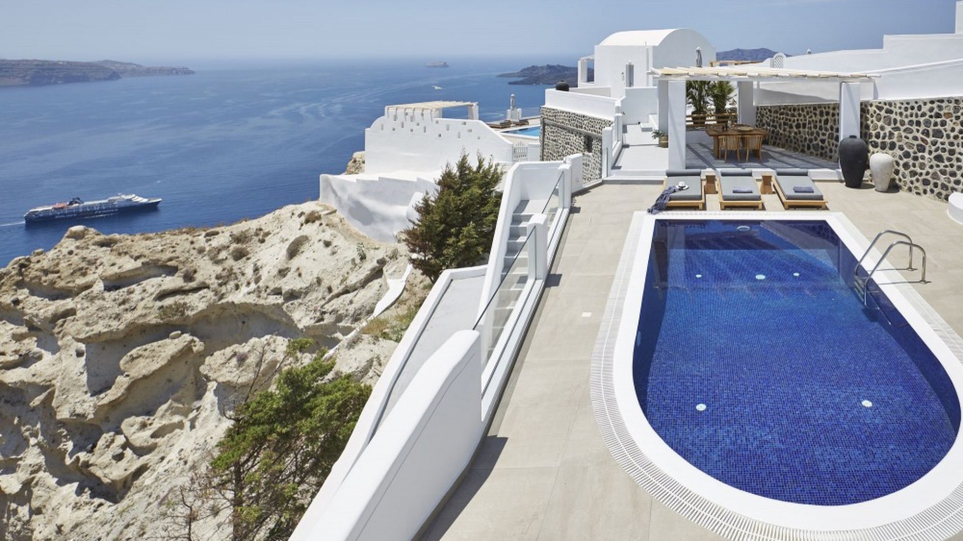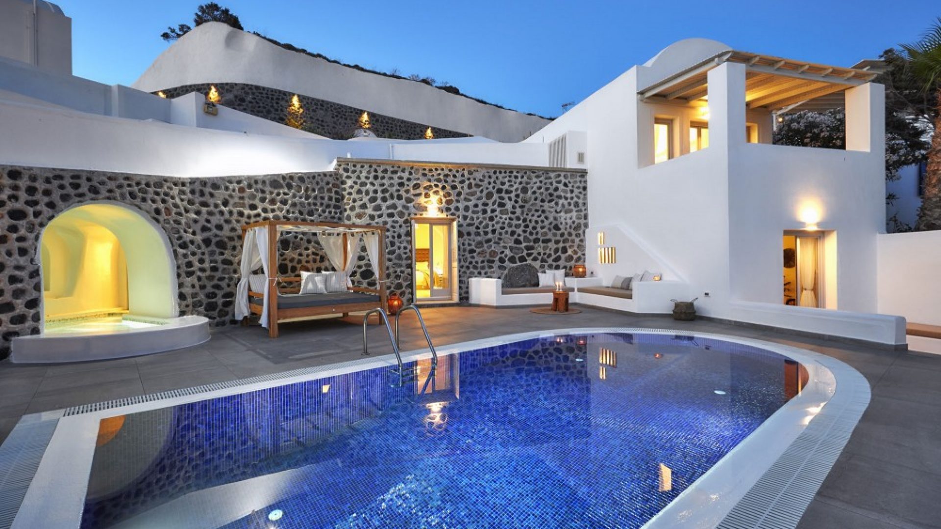Dramatic views of the Aegean, the volcano, and the spectacular sunset are highlights of your stay in one of the villas.