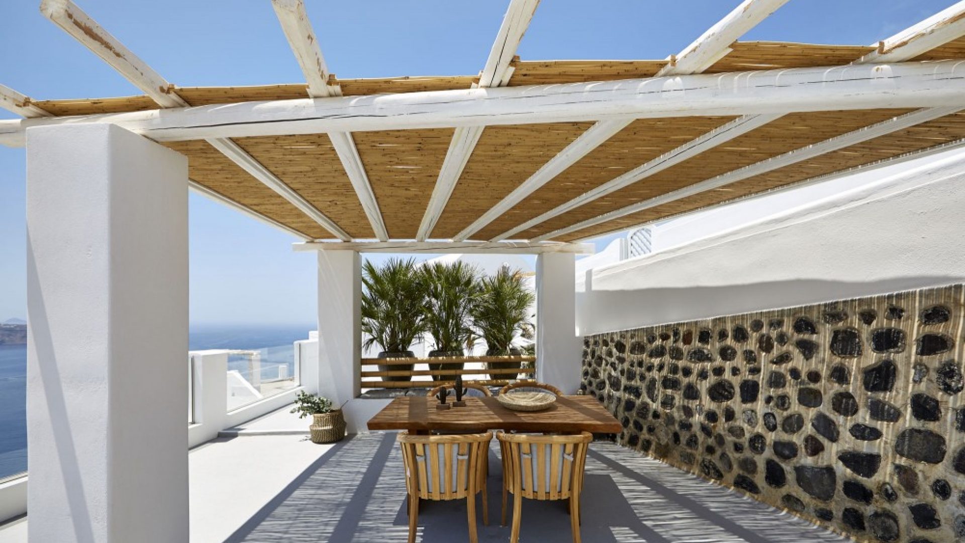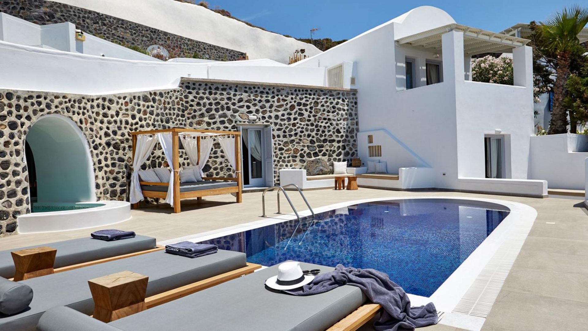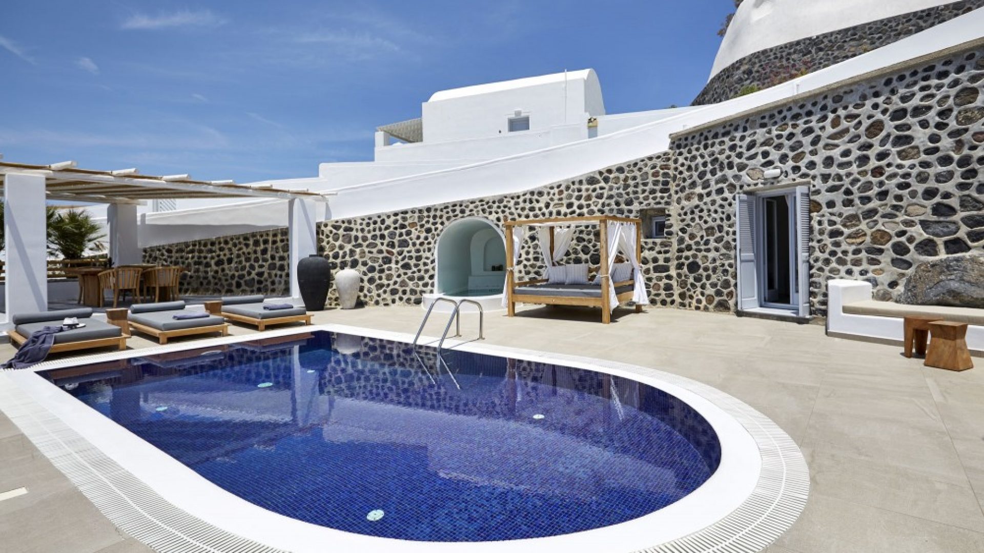 Overlooking the caldera and gazing at the endless beauty of blue laid before you, you may dip in the private swimming pool of the villa and enjoy the setting. Santorini Afrodite Villa boasts a marvelous, unique location that allows you to experience the special, singular character of Santorini in its absolute magnitude!