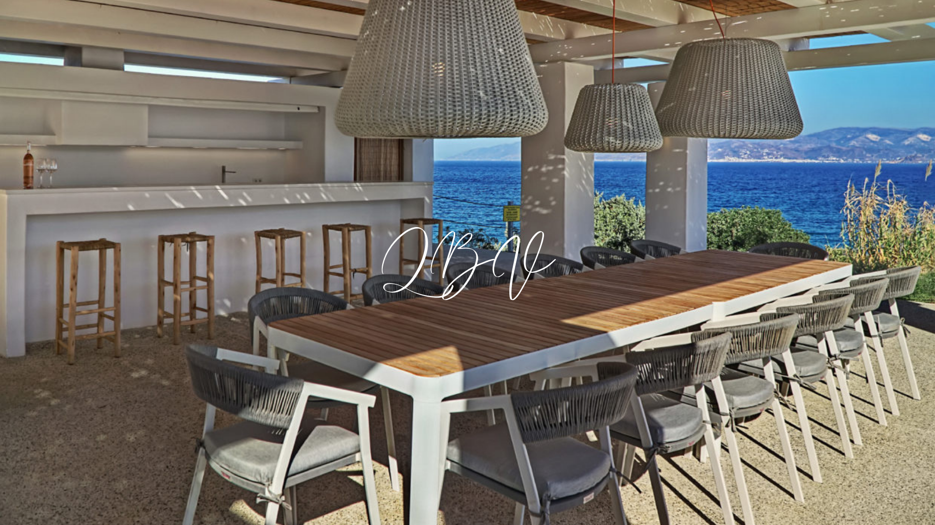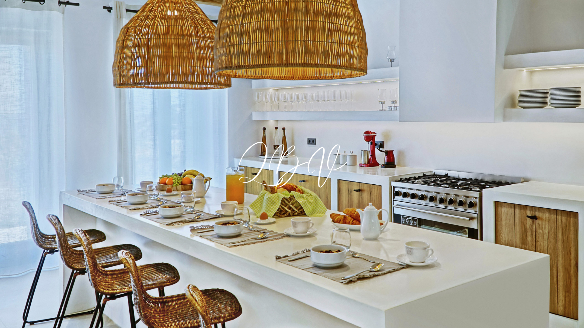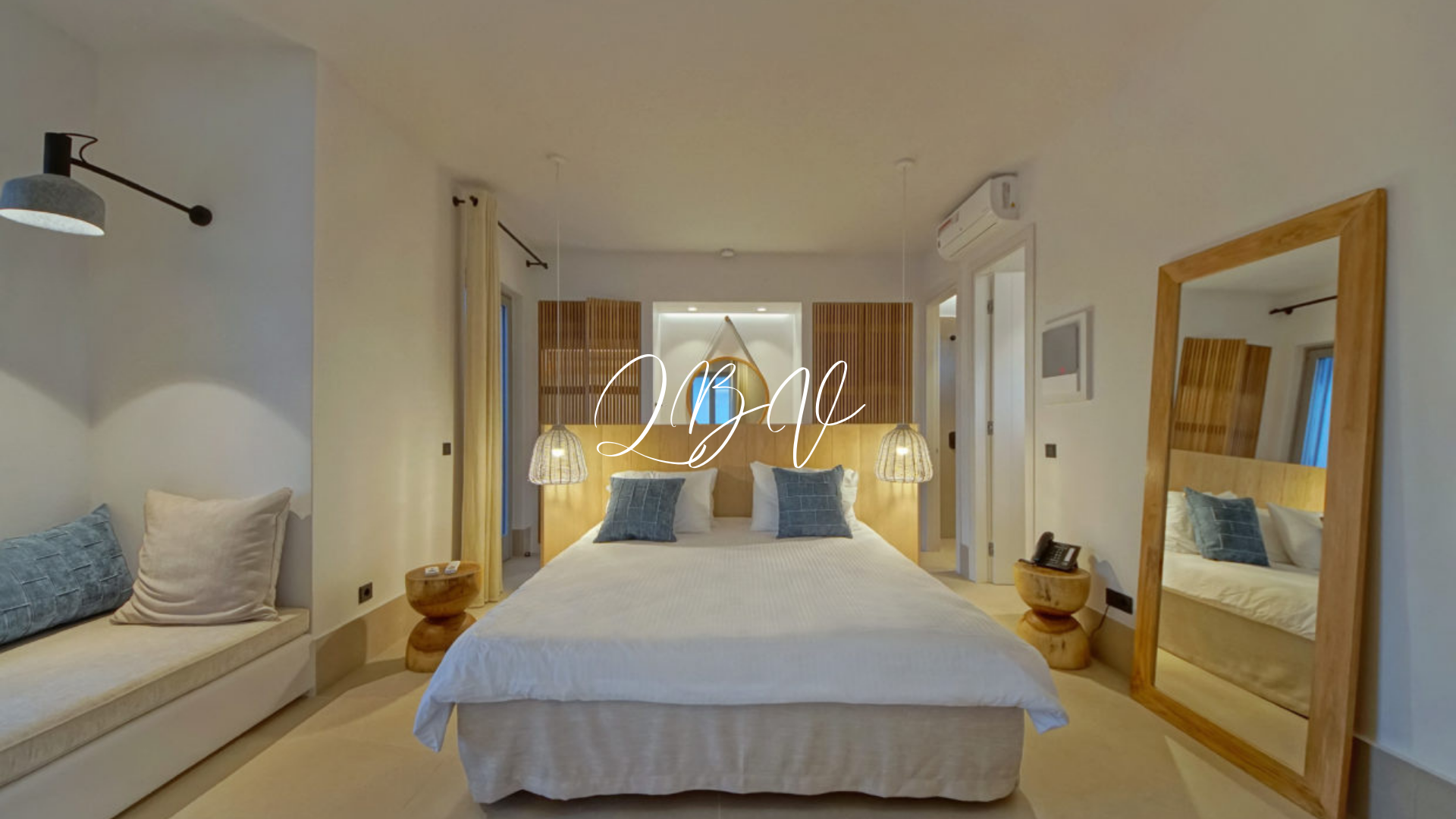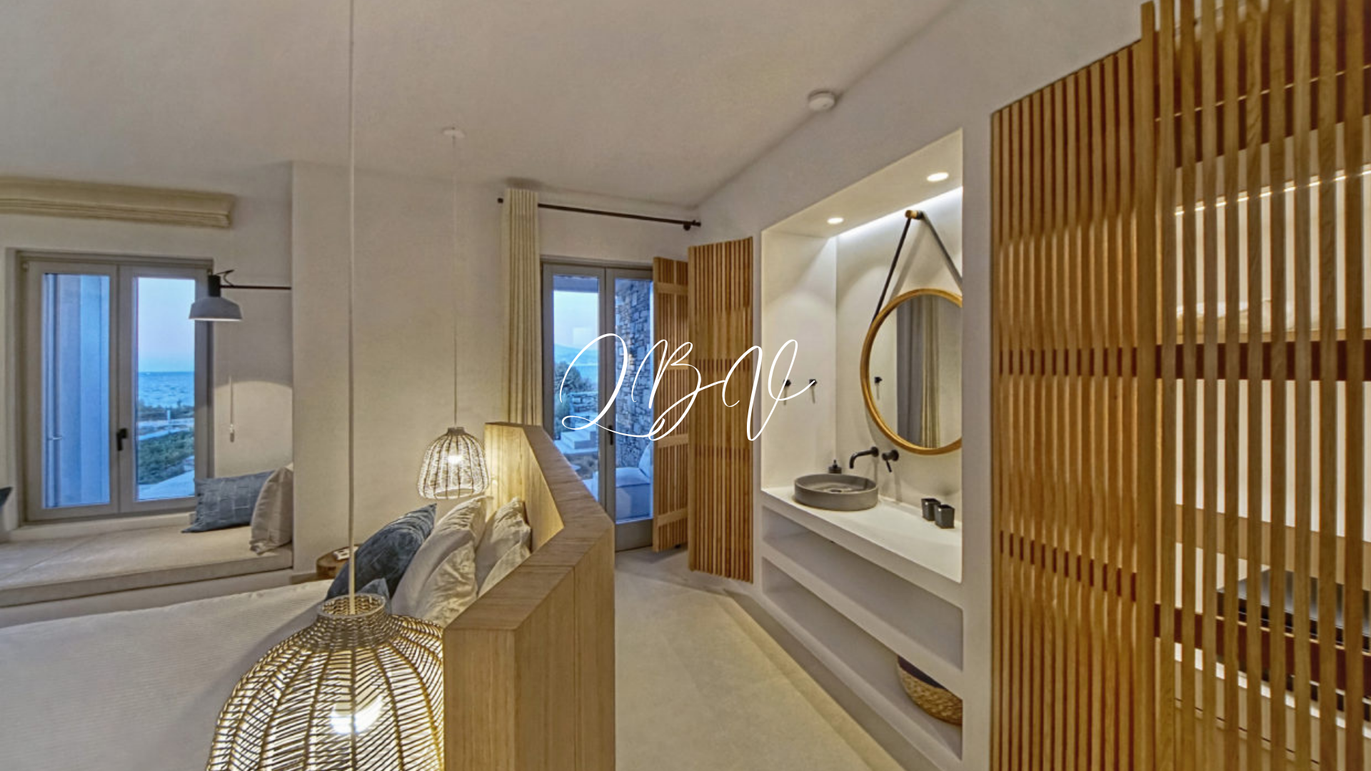 In the interior, dominated by white, the modern esthetics of the Aegean Sea creates the most suitable background for the wooden elements to stand out. The oak beams of the roof, the lighting fixtures, and the handcrafted decorative items all elevate the overall aesthetics of the building. Designer furniture and fine cotton or linen fabrics come together in a harmonious blend with the bright natural light and the clean surfaces, creating a clear, unpretentious space, interrupted only by the blue color of the sea.