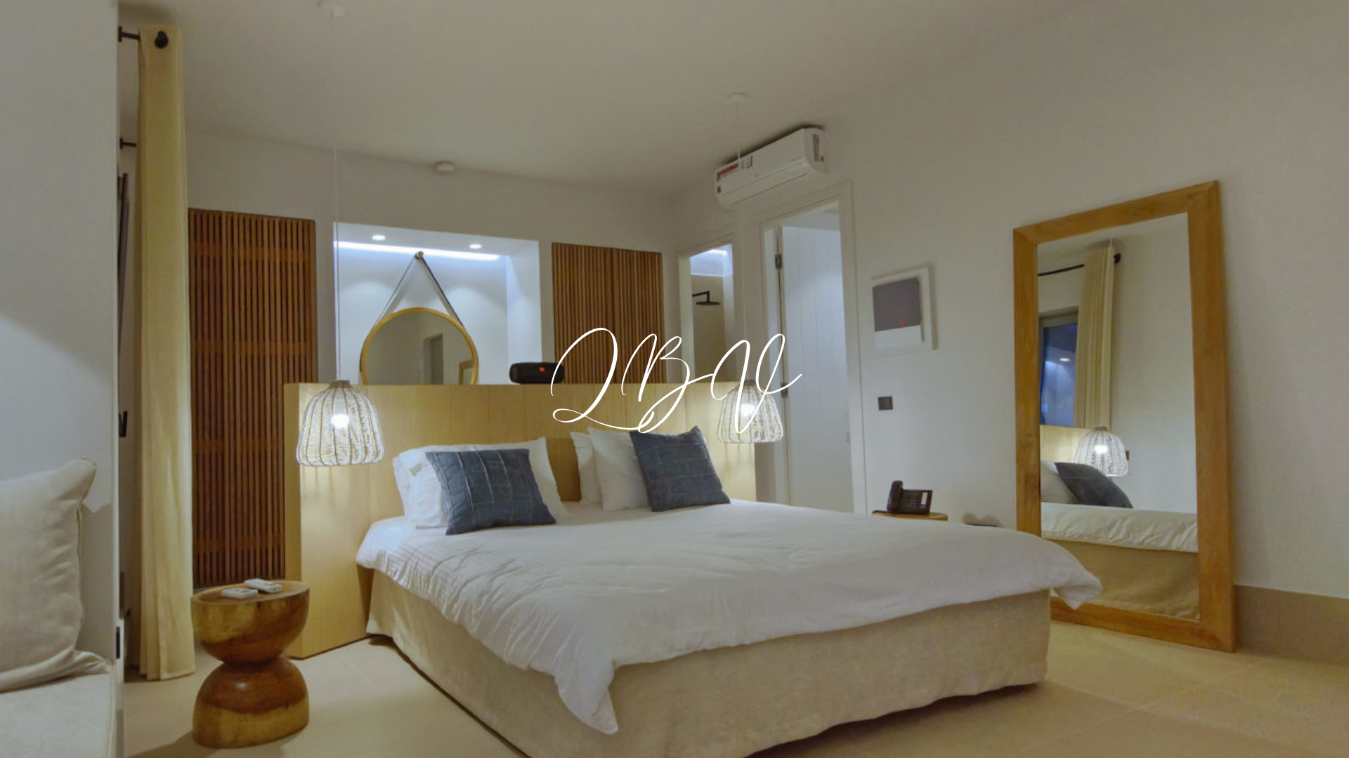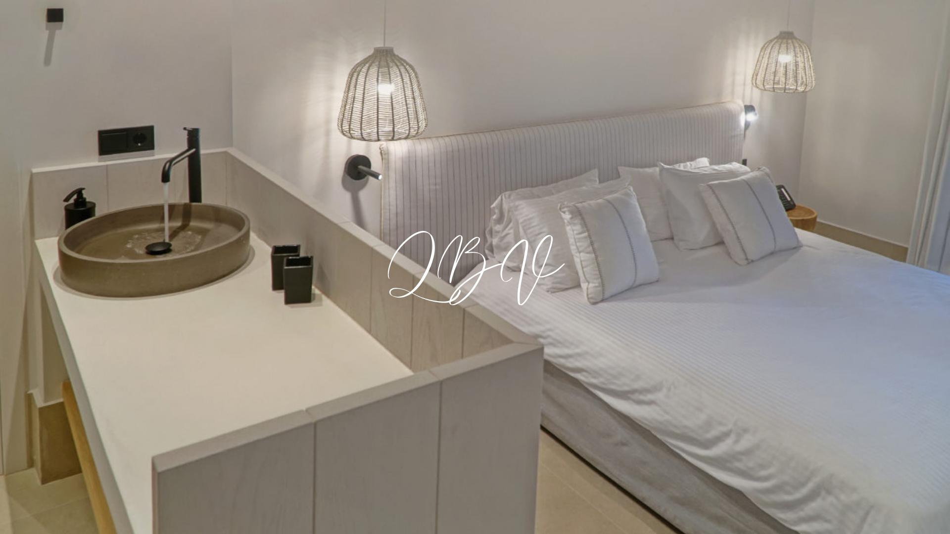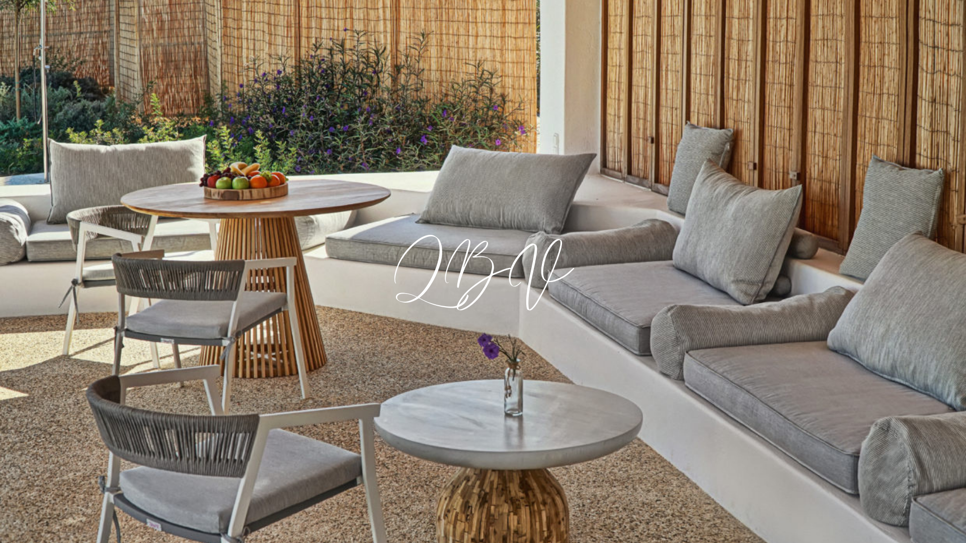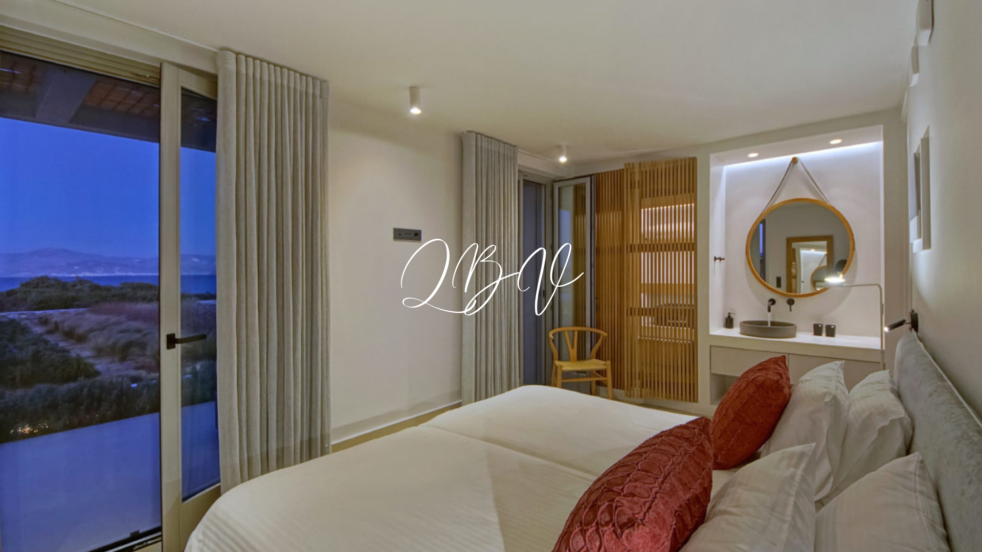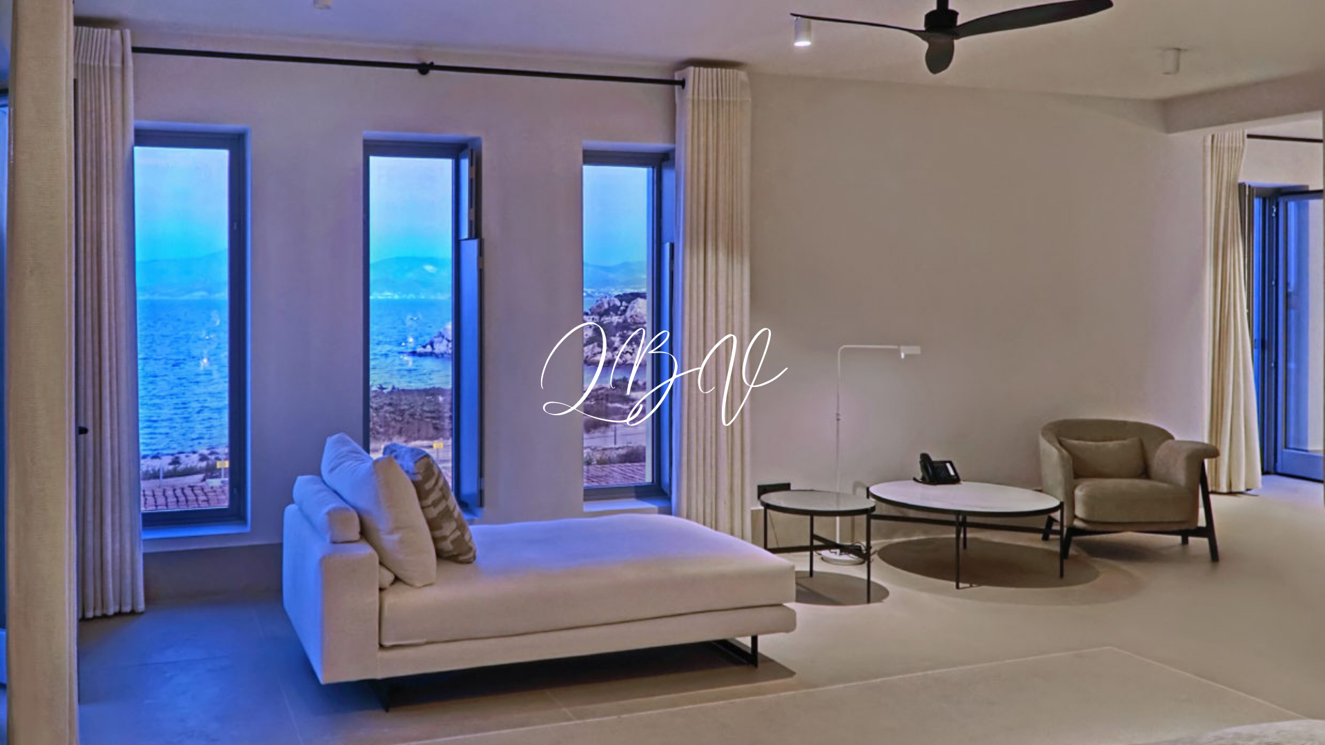In the interior, dominated by white, the modern esthetics of the Aegean Sea creates the most suitable background for the wooden elements to stand out. The oak beams of the roof, the lighting fixtures, and the handcrafted decorative items all elevate the overall aesthetics of the building. Designer furniture and fine cotton or linen fabrics come together in a harmonious blend with the bright natural light and the clean surfaces, creating a clear, unpretentious space, interrupted only by the blue color of the sea.