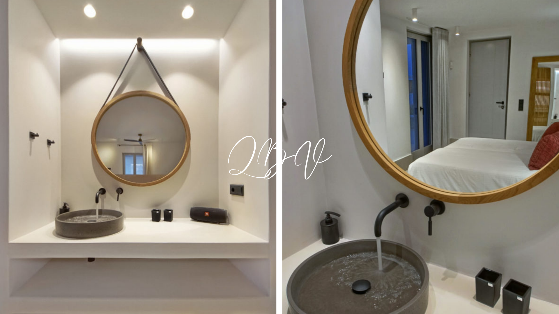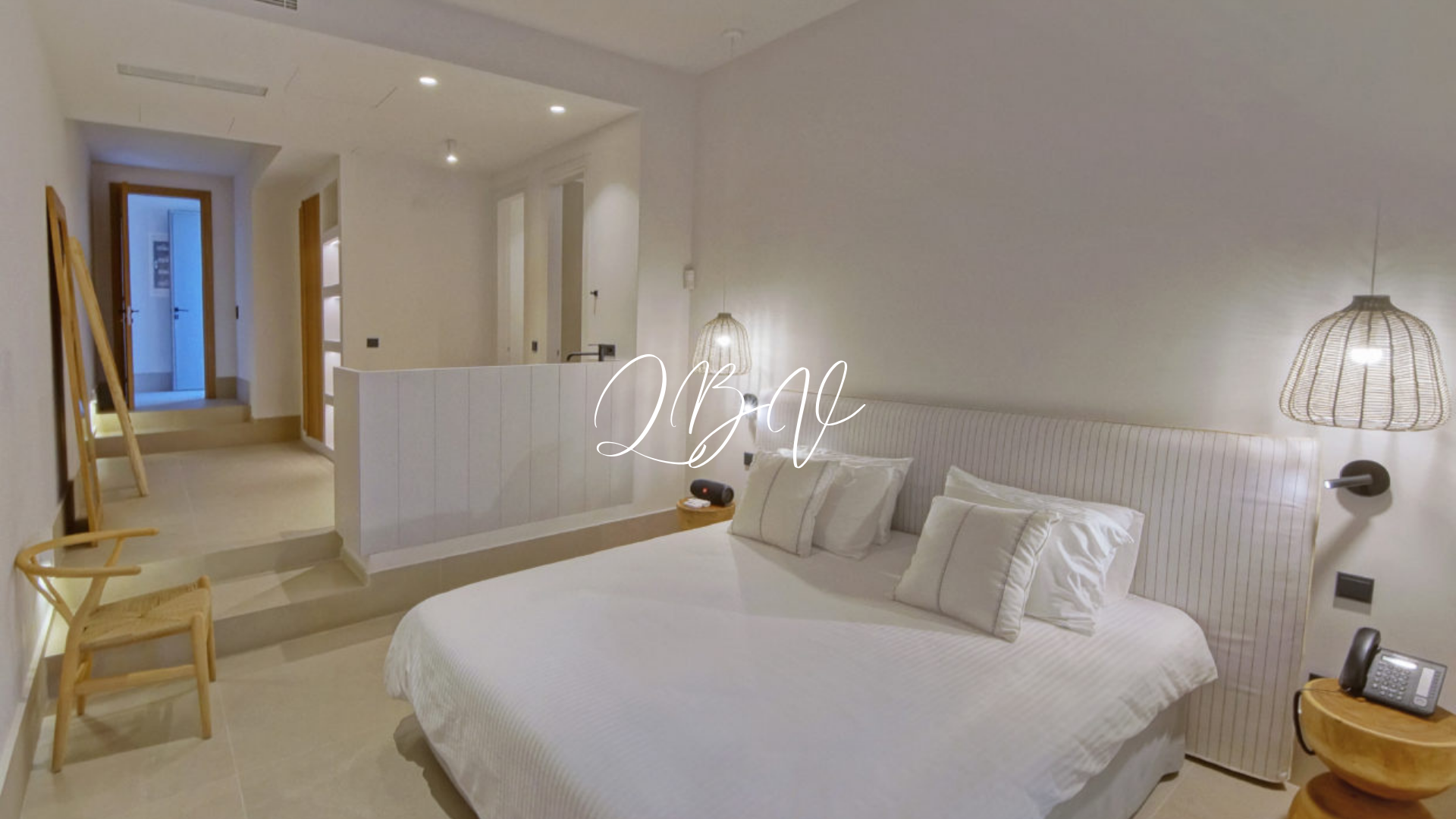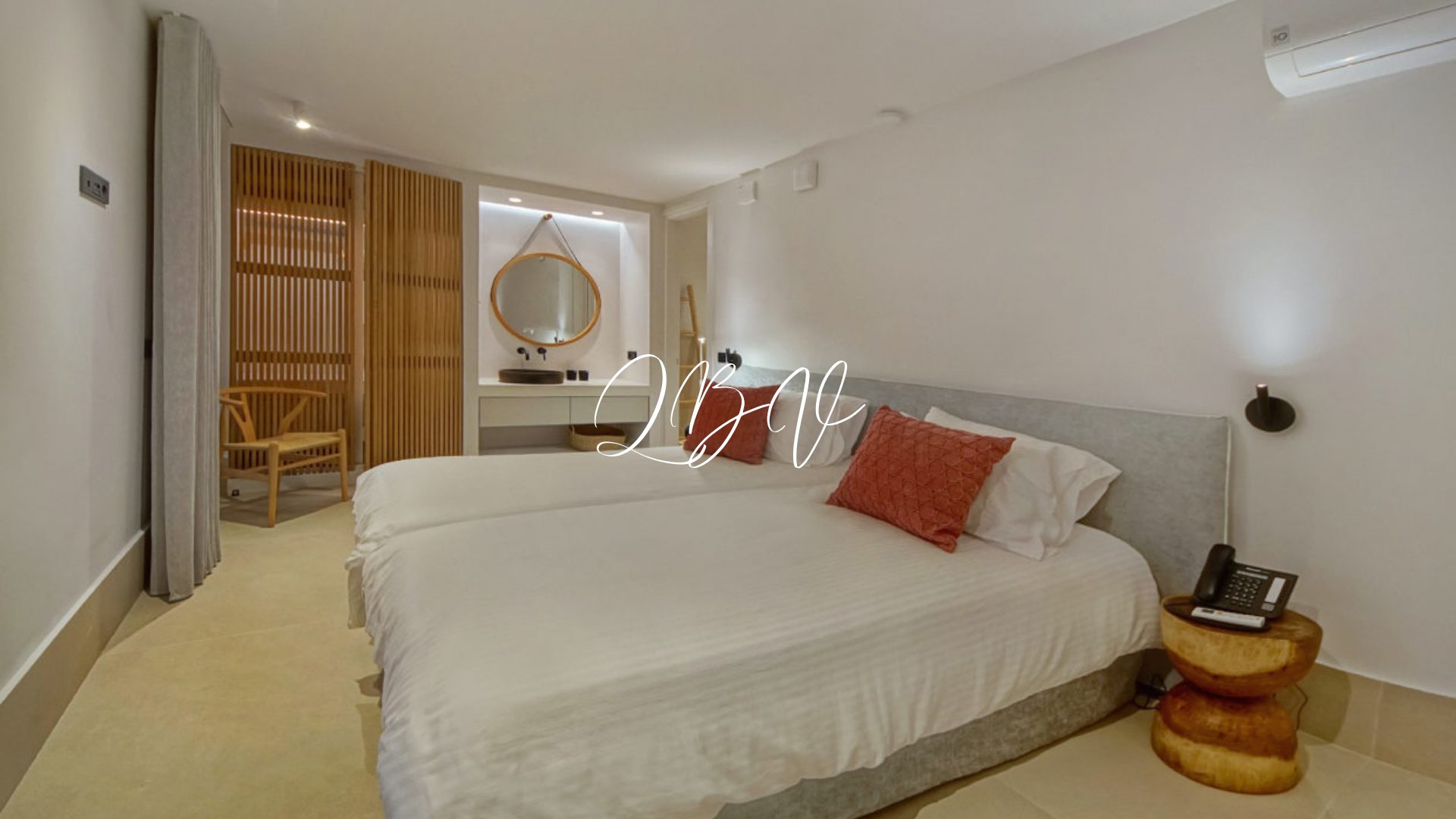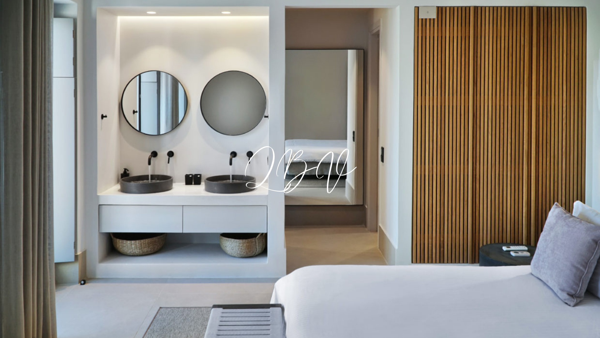 In the interior, dominated by white, the modern esthetics of the Aegean Sea creates the most suitable background for the wooden elements to stand out. The oak beams of the roof, the lighting fixtures, and the handcrafted decorative items all elevate the overall aesthetics of the building. Designer furniture and fine cotton or linen fabrics come together in a harmonious blend with the bright natural light and the clean surfaces, creating a clear, unpretentious space, interrupted only by the blue color of the sea.