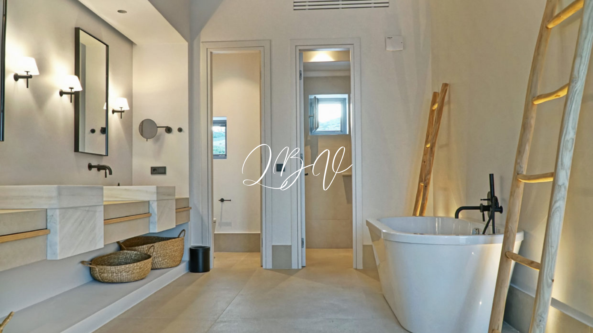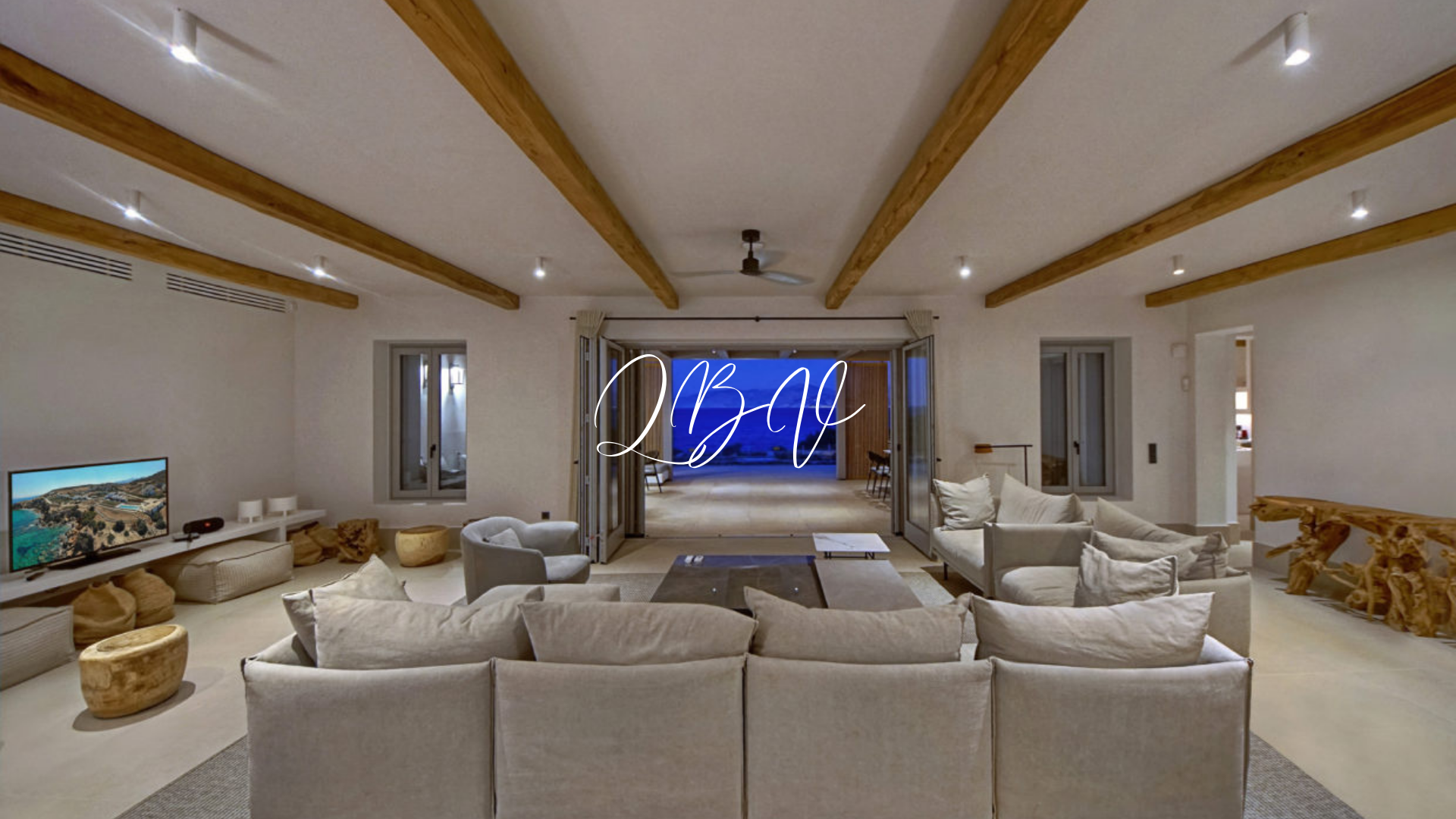The outdoor area provides an immersive sense of serenity, with main materials that complement perfectly the natural environment surrounding the villa. The impressive swimming pool covers an area of over 100 square meters and works as the natural continuation of the sea. The oversized open-air lounge overlooking the Aegean, together with the outdoor dining area, well-protected from the strong summer winds of the Mediterranean, as well as all other outdoor corners, are all created in a way to help your open-air gatherings and get-togethers with guests, at all hours.