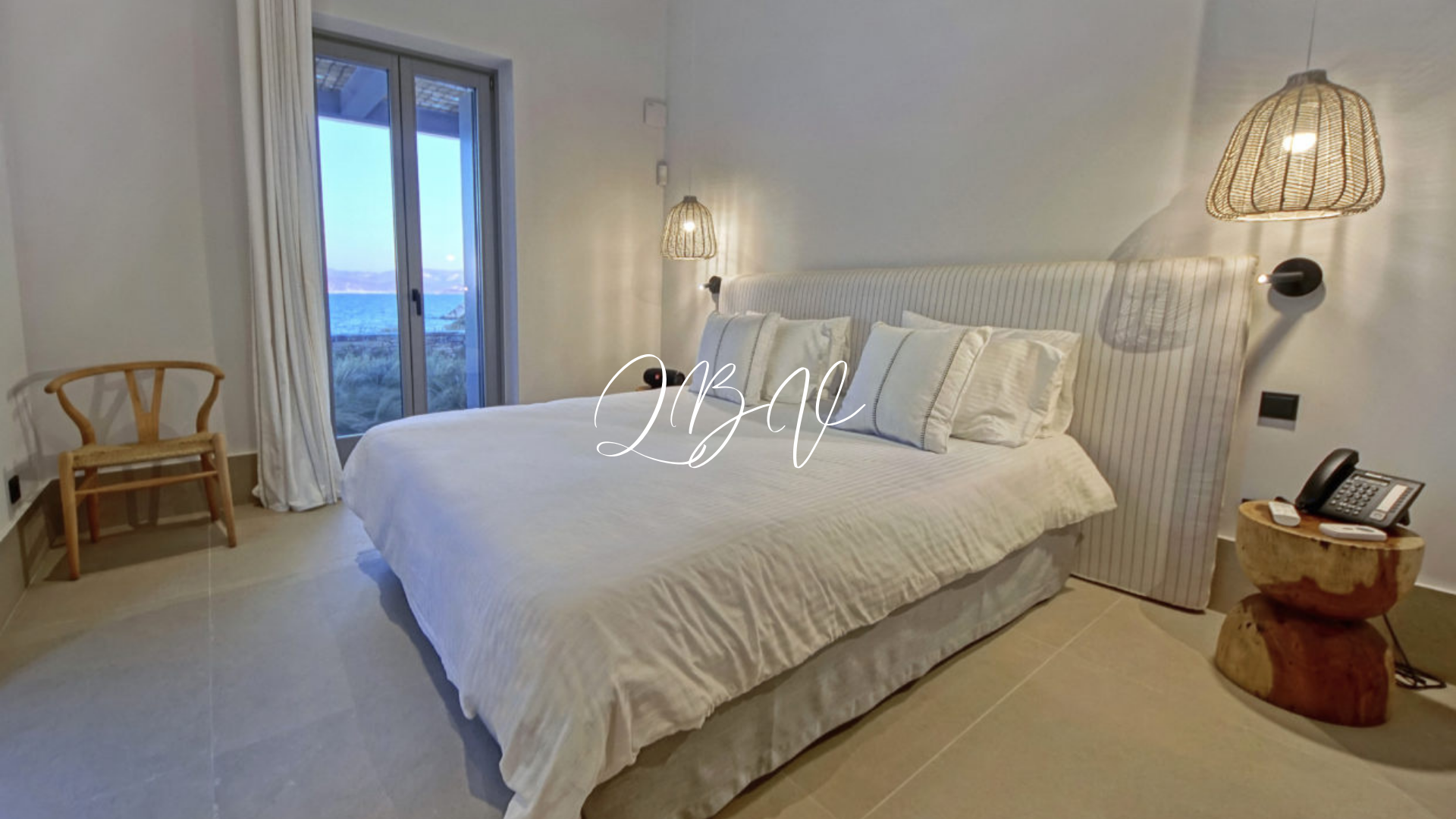 The impressive main building, unfolds on two levels, including a master suite with an en-suite bathroom on the first floor, and two more bedrooms on the ground level, one with its own independent entrance. The same building houses the main indoor lounge with its spectacular sea view and a fully equipped kitchen, as well as a professional catering area. Three more independent rooms with private balconies with views to the Aegean Sea can double as guest rooms. All areas have direct access to the outdoors and provide all guests with a unique living experience.