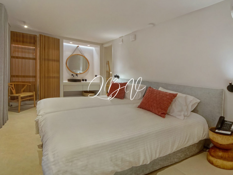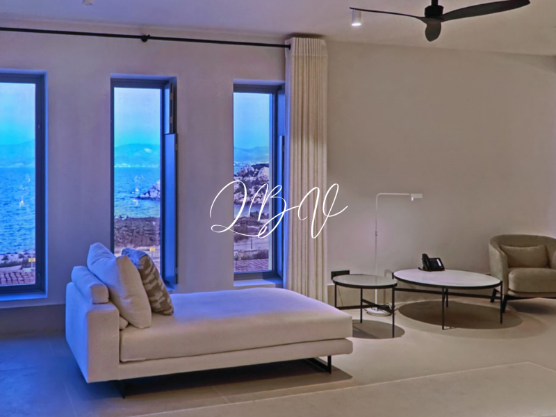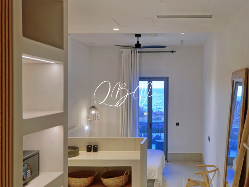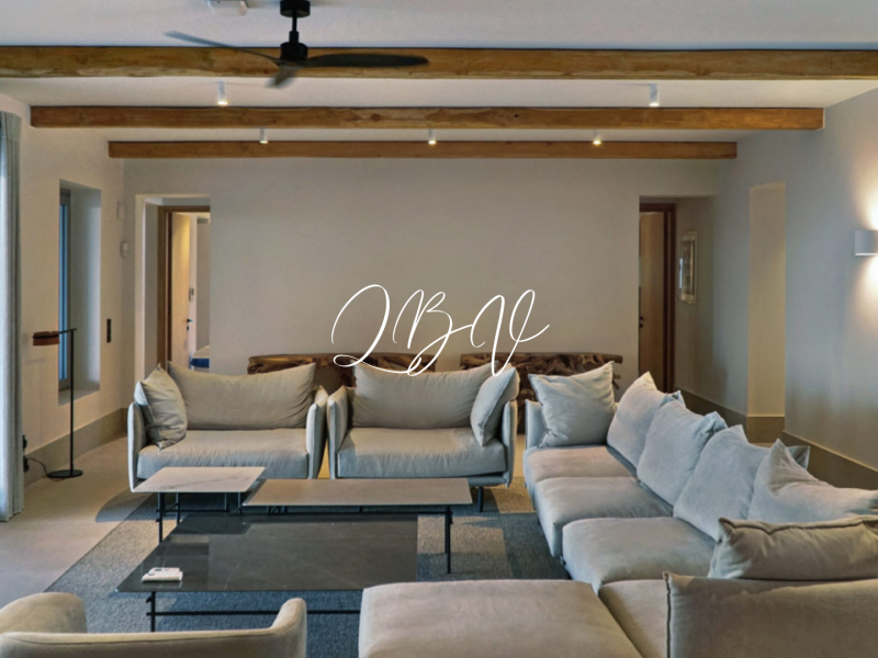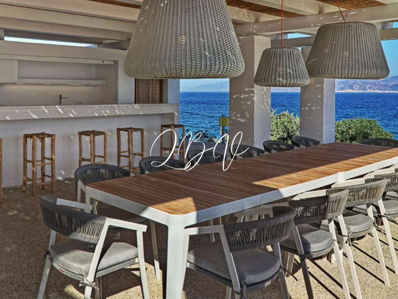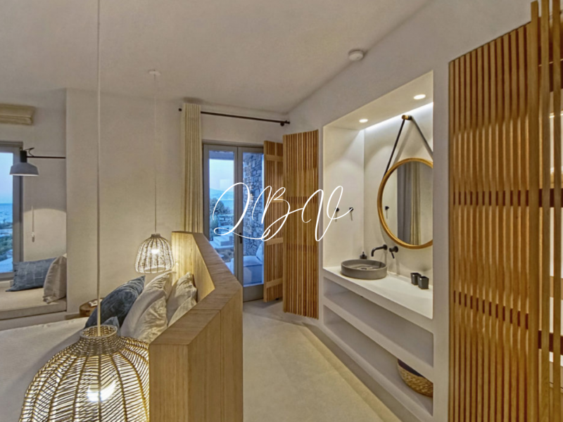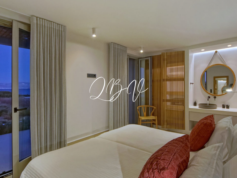 In the interior, dominated by white, the modern esthetics of the Aegean Sea creates the most suitable background for the wooden elements to stand out. The oak beams of the roof, the lighting fixtures, and the handcrafted decorative items all elevate the overall aesthetics of the building. Designer furniture and fine cotton or linen fabrics come together in a harmonious blend with the bright natural light and the clean surfaces, creating a clear, unpretentious space, interrupted only by the blue color of the sea.