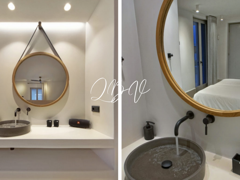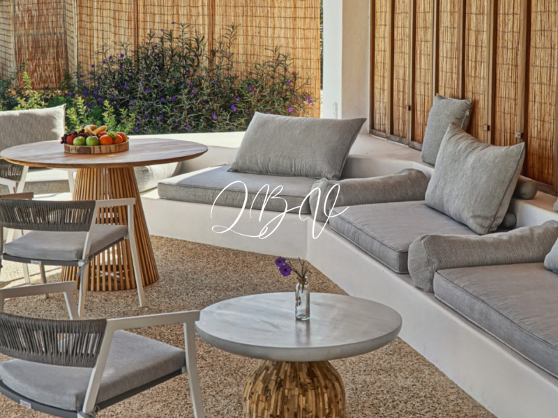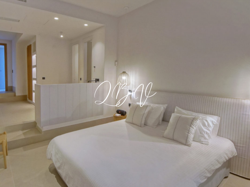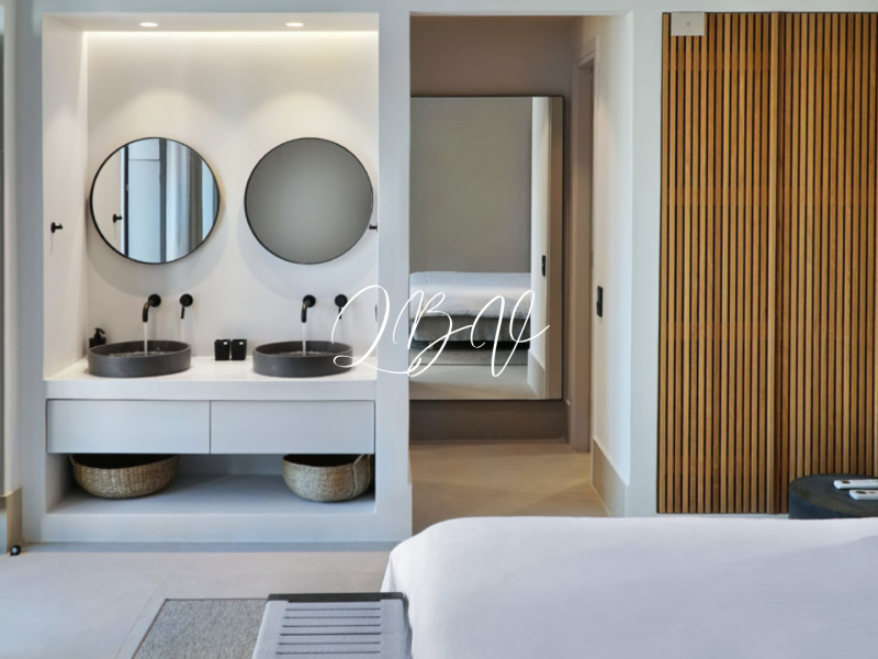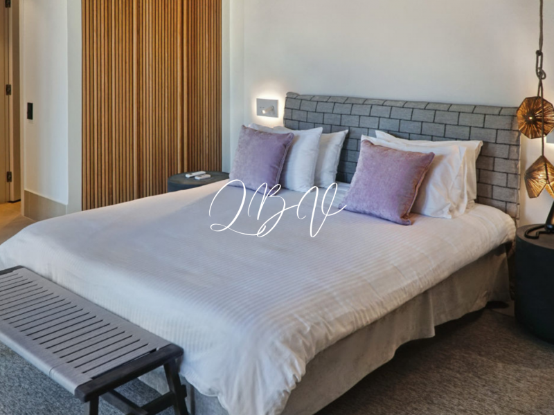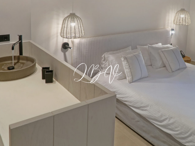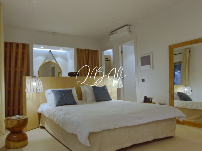 In the interior, dominated by white, the modern esthetics of the Aegean Sea creates the most suitable background for the wooden elements to stand out. The oak beams of the roof, the lighting fixtures, and the handcrafted decorative items all elevate the overall aesthetics of the building. Designer furniture and fine cotton or linen fabrics come together in a harmonious blend with the bright natural light and the clean surfaces, creating a clear, unpretentious space, interrupted only by the blue color of the sea.