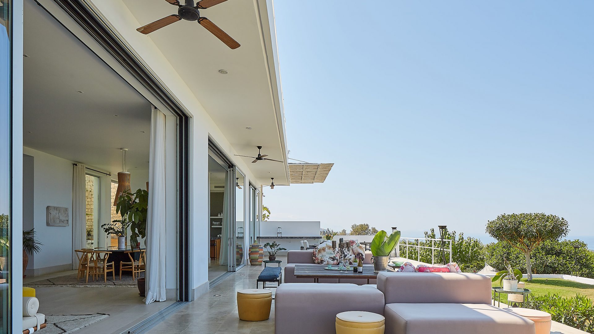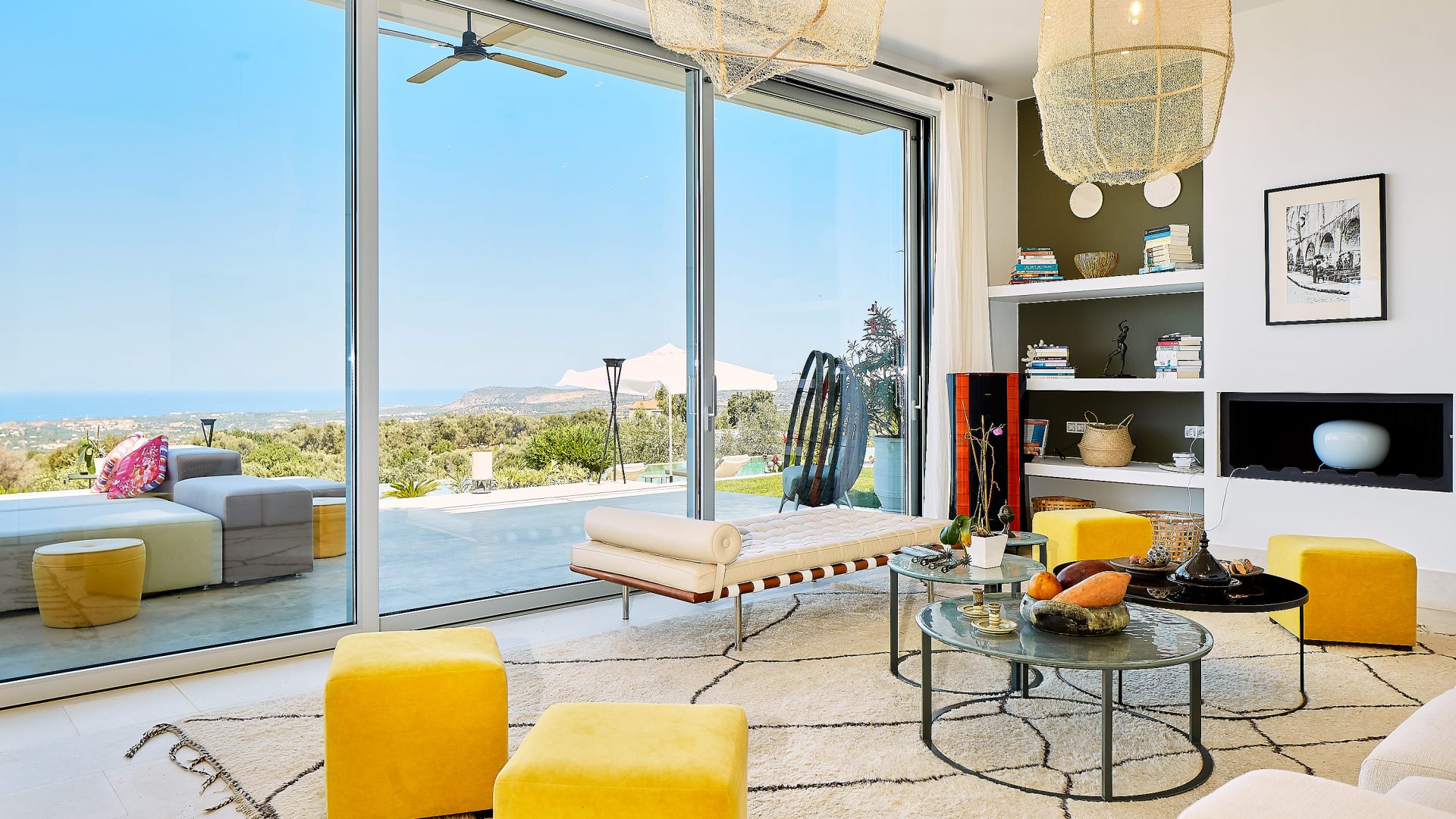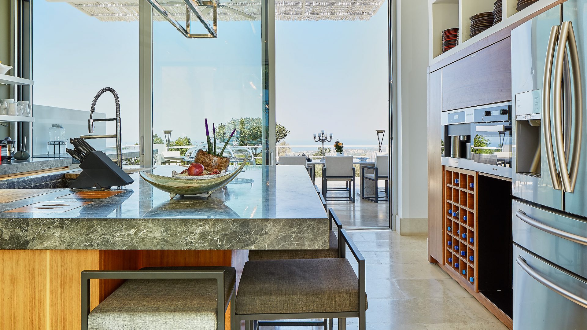 Entering the villa on the ground floor there is a spacious open plan area consisting of the living room, dining area and kitchen which are strategically placed to take advantage of the splendid view.