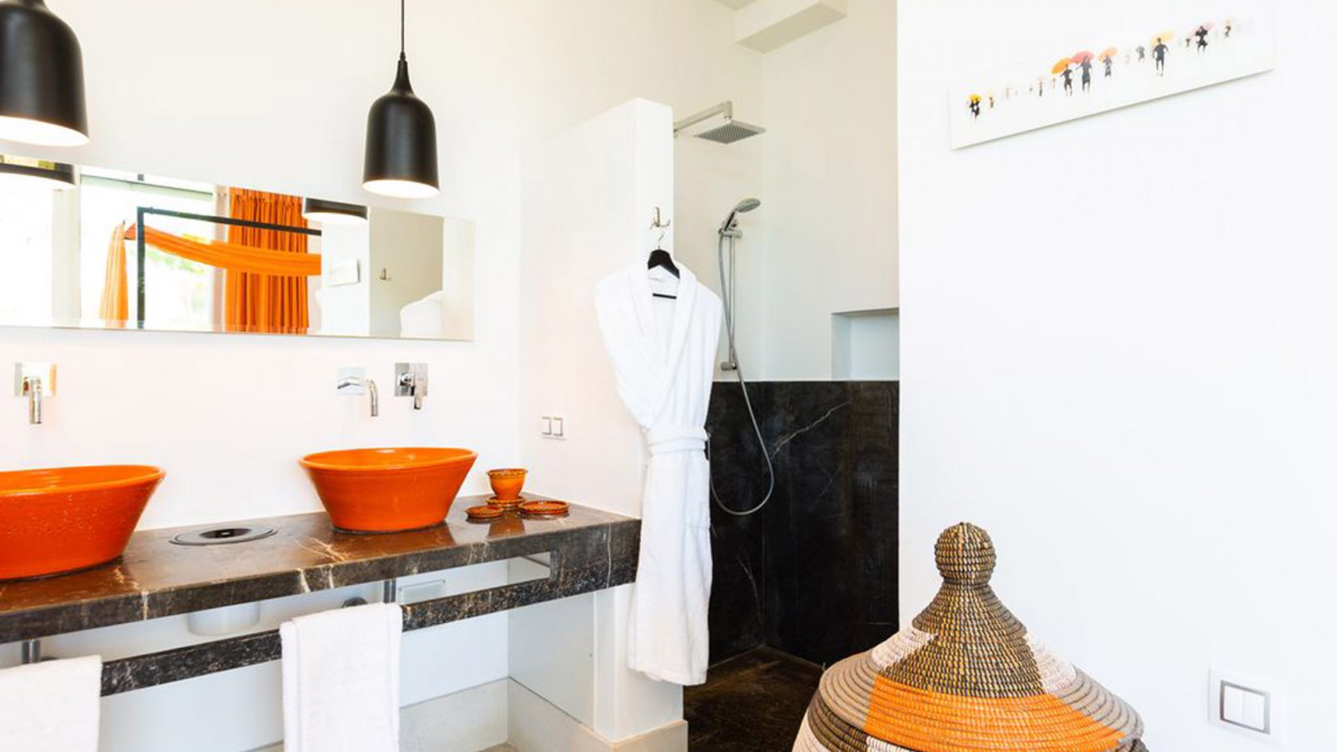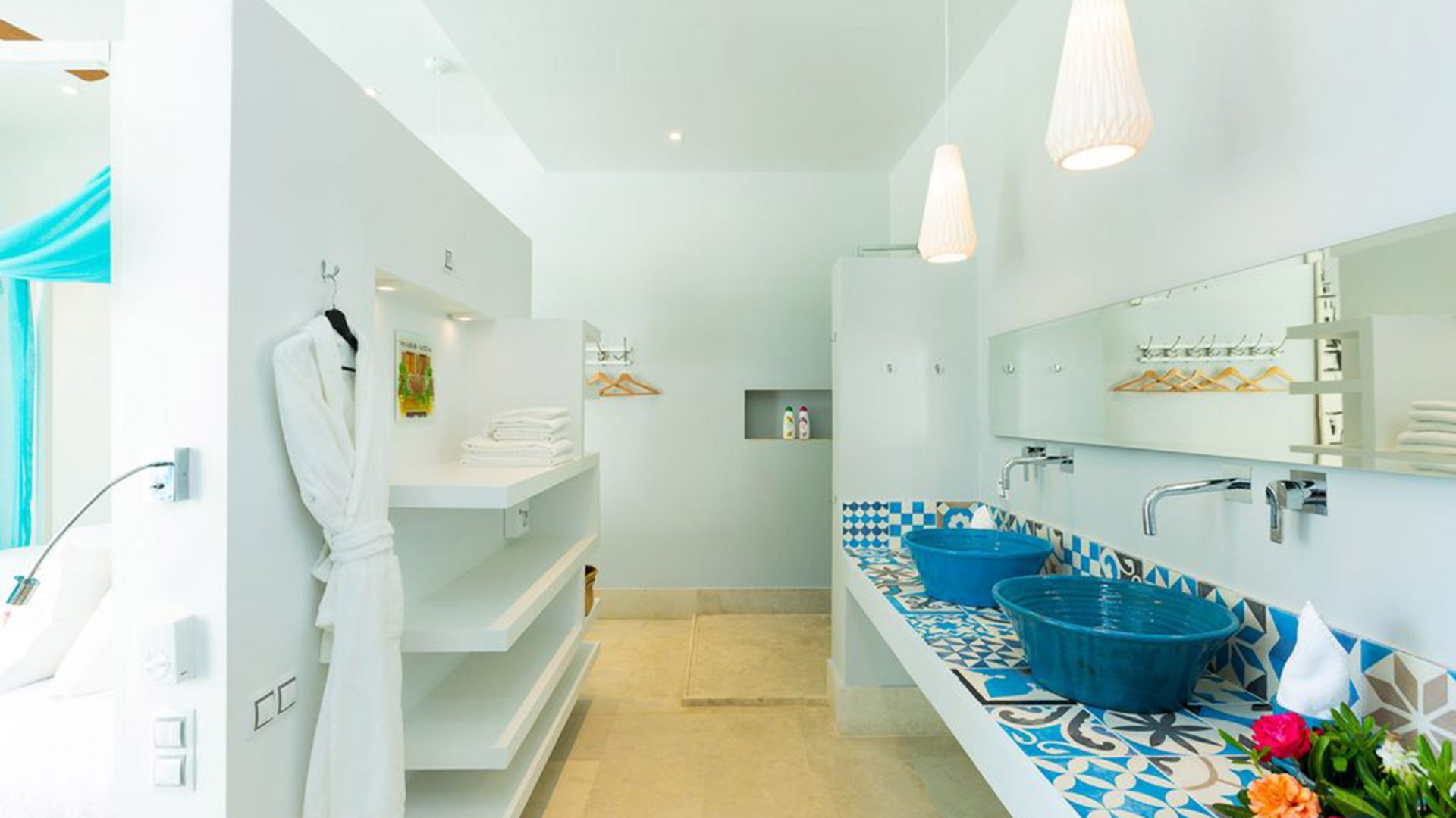 A staircase next to the main entrance leads you up to the first floor where you will find a master bedroom with a king size double bed and en-suite bathroom with a shower. It also contains a closet room, a small refrigerator, a 30” HDTV, an office space with a printer and an exit to a private veranda with an outdoor shower and gazebo bed where excellent views can be enjoyed.