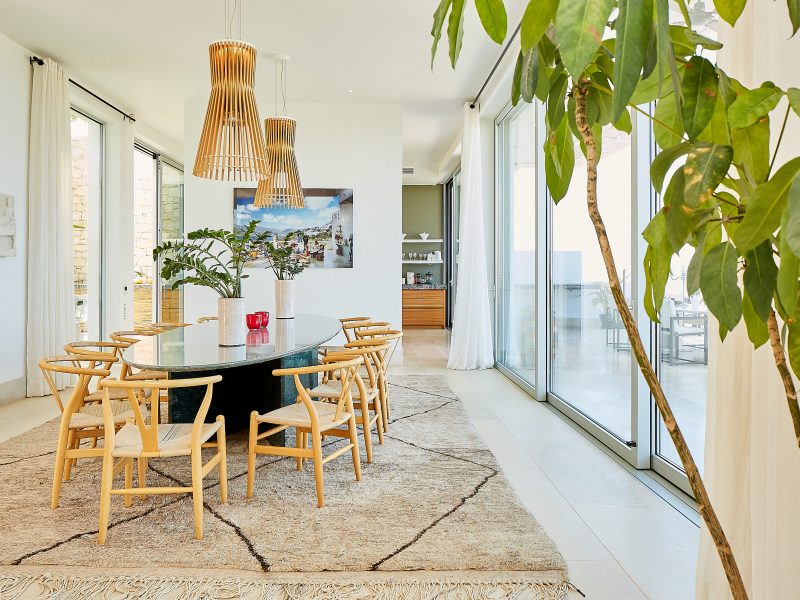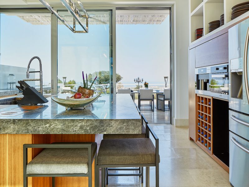 Entering the villa on the ground floor there is a spacious open plan area consisting of the living room, dining area and kitchen which are strategically placed to take advantage of the splendid view.