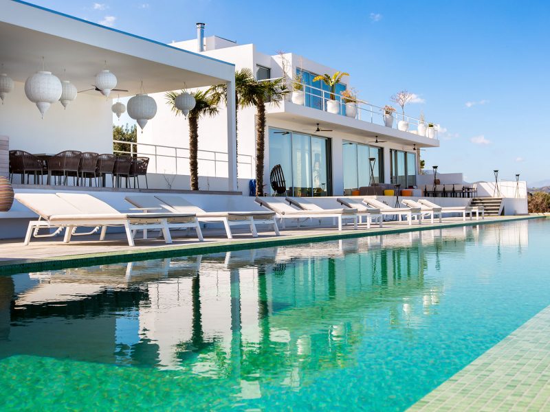 The sizable home spreads its many individual bedrooms across three levels, all located above ground. The majority of the day is spent on the middle level, where the main living, dining, and kitchen areas open directly onto a veranda which houses the 25 meters long ecological pool.