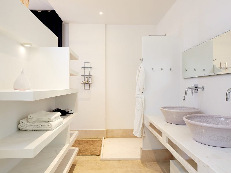 A staircase next to the main entrance leads you up to the first floor where you will find a master bedroom with a king size double bed and en-suite bathroom with a shower. It also contains a closet room, a small refrigerator, a 30” HDTV, an office space with a printer and an exit to a private veranda with an outdoor shower and gazebo bed where excellent views can be enjoyed.