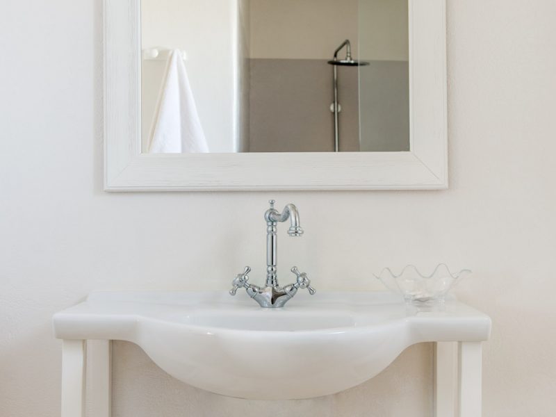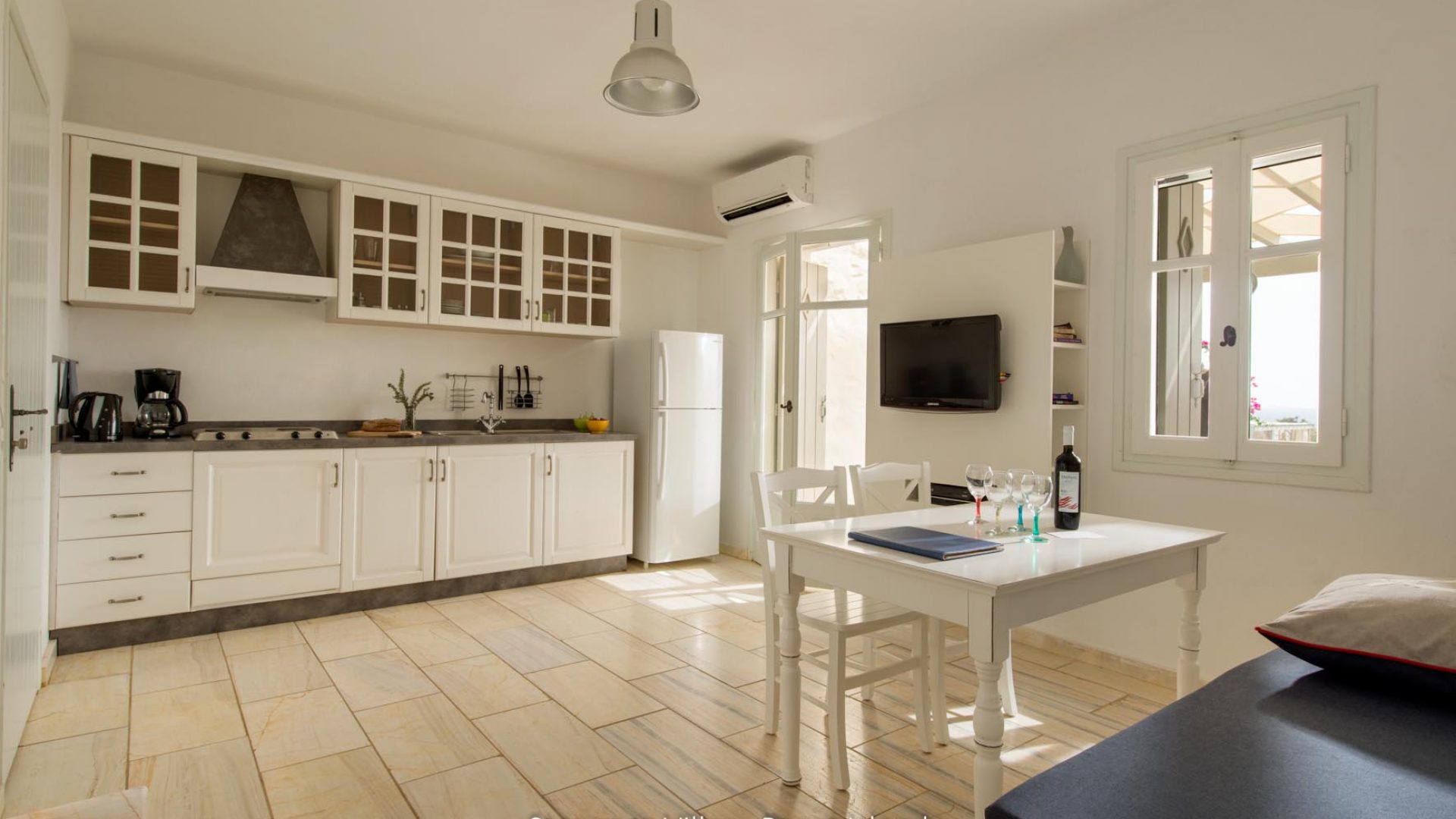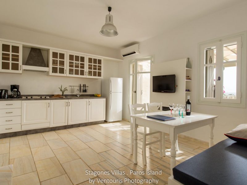 Modern living room area with fluffy furniture, flat TV screen and a separate dining wooden table with a full equipped italian style kitchen. Veranda made for the greatest summer nights across our wonderful and fragrant gardens. Arelia Villa includes central air-conditioning system and fans.
