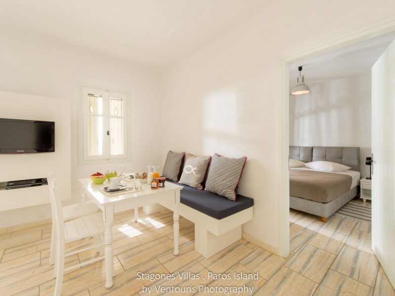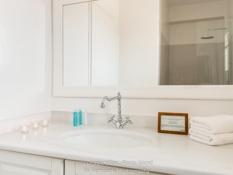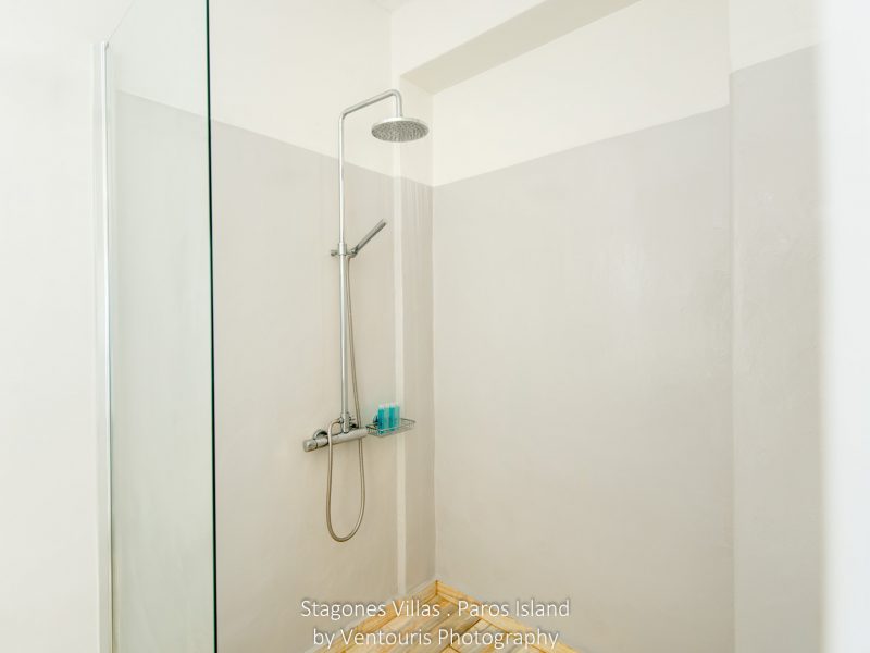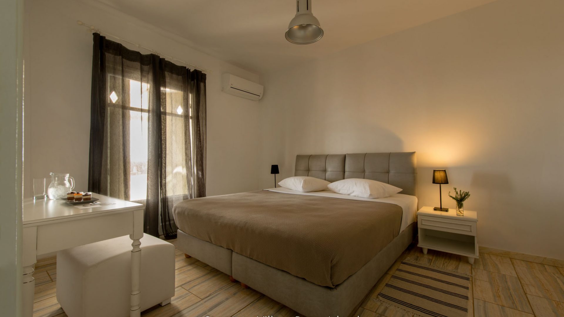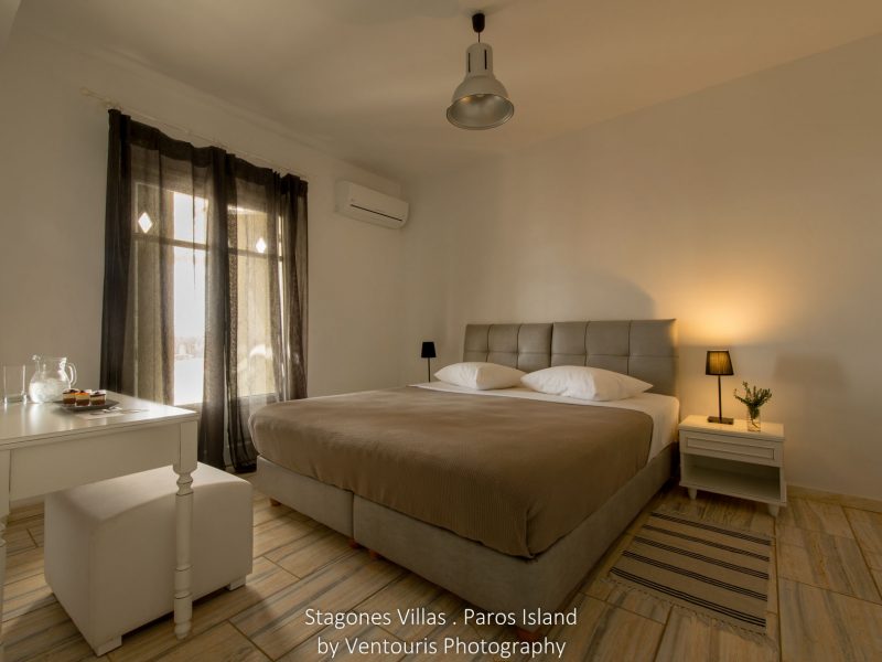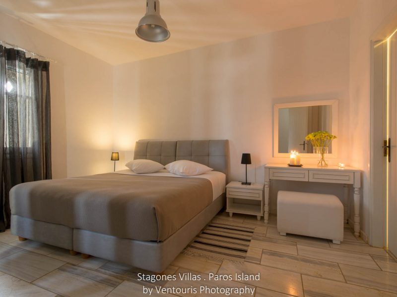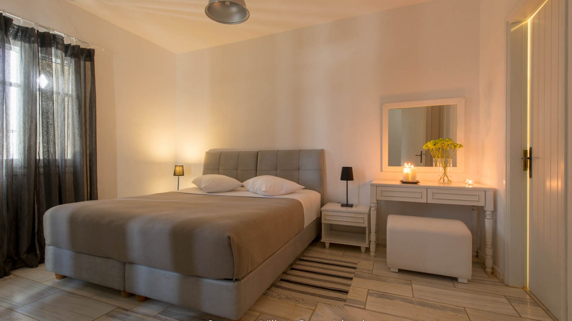 The spectacular 81 sq. meters Aperia villa with 180 degree views to the sea. The particular is consisting of a totally separate master bedroom on the second floor with silicon king size bed and veranda access. On the same floor there is an en-suite white local marbled bathroom with shower cabin and white depositary furniture. The main floor has another spacious bedroom with two queen size beds.