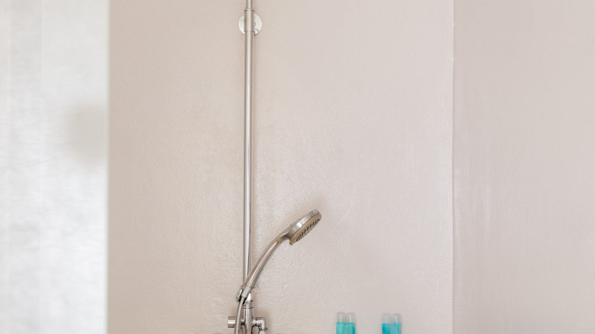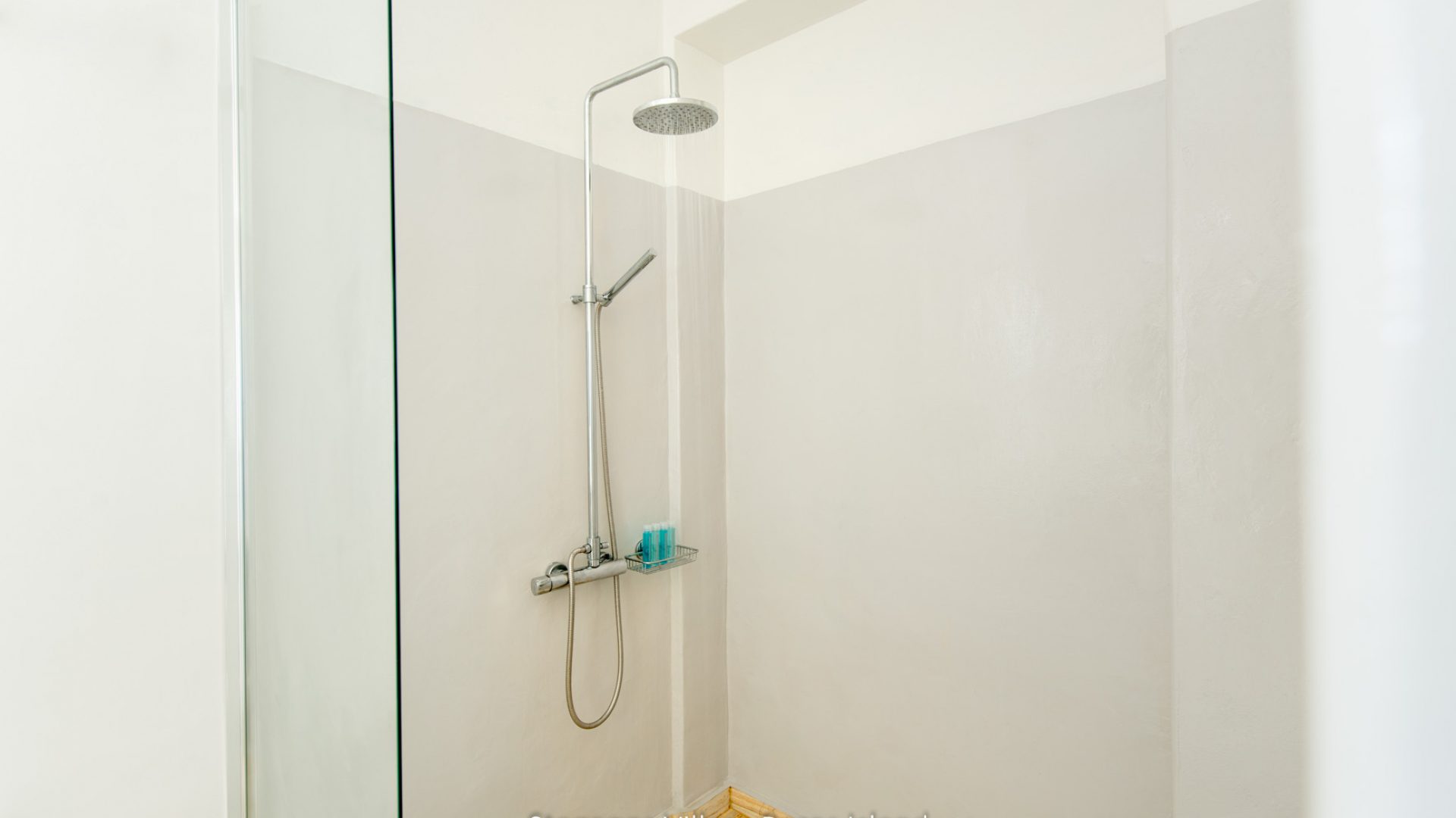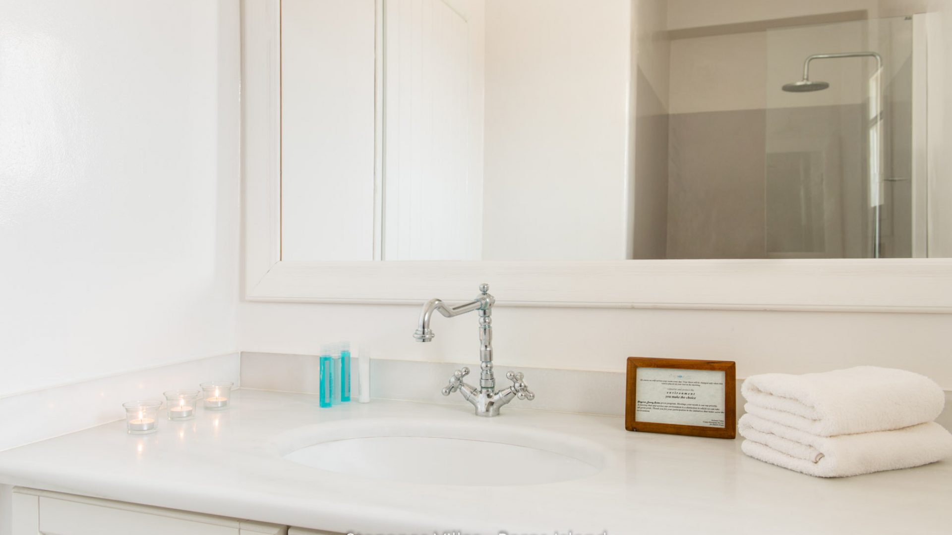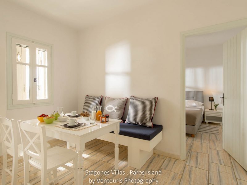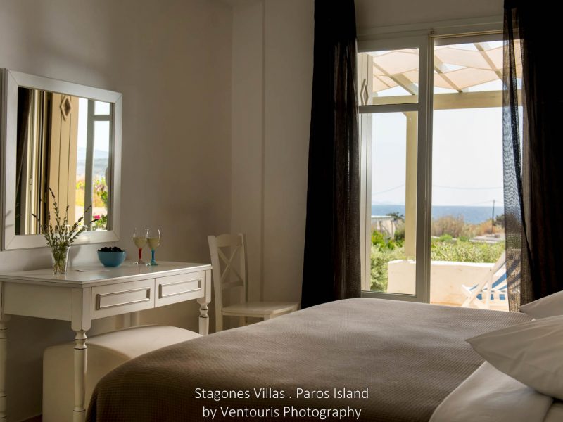 The spectacular 81 sq. meters Aperia villa with 180 degree views to the sea. The particular is consisting of a totally separate master bedroom on the second floor with silicon king size bed and veranda access. On the same floor there is an en-suite white local marbled bathroom with shower cabin and white depositary furniture. The main floor has another spacious bedroom with two queen size beds.