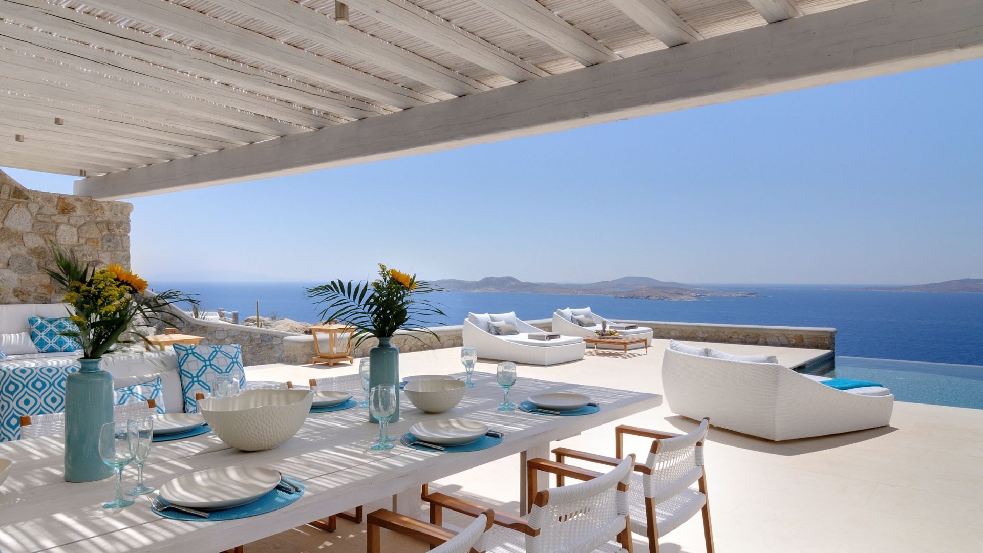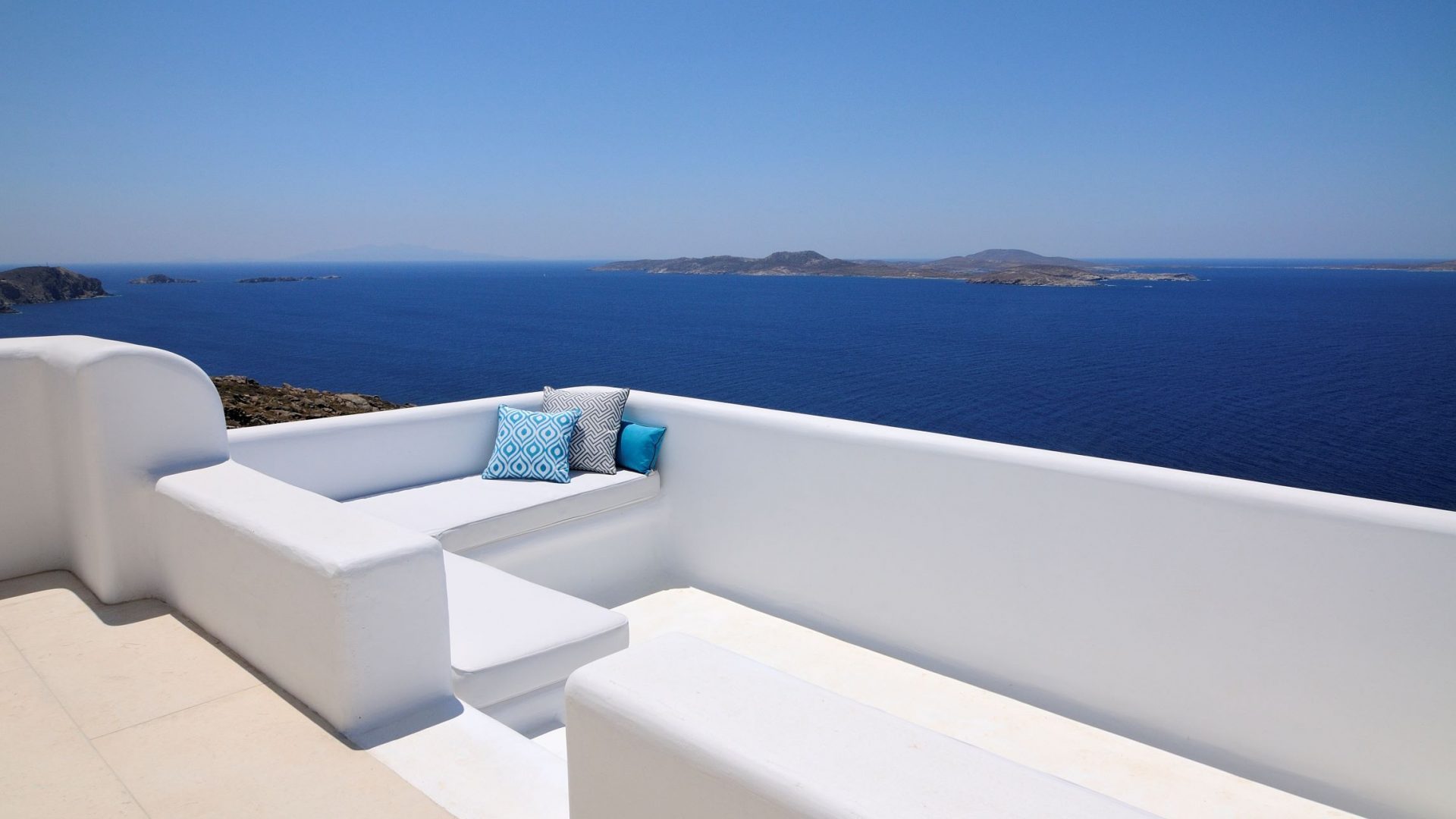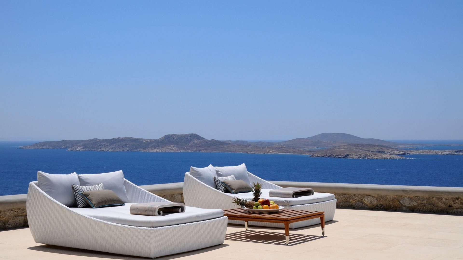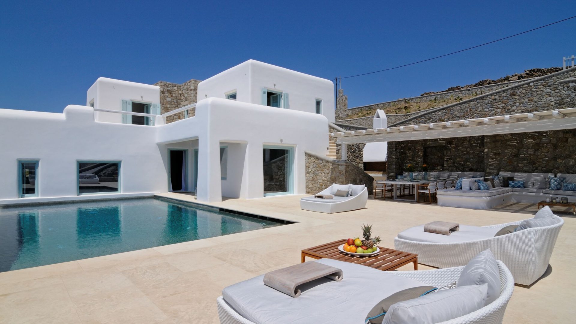 Marvelous views of picturesque Delos and Rhenia islands and enviable island living harmoniously merge into a stunning home that embraces its residents. The stunning views of Delos and Rhenia are perfectly matched by whitewashed architectural elements and natural stone walls.