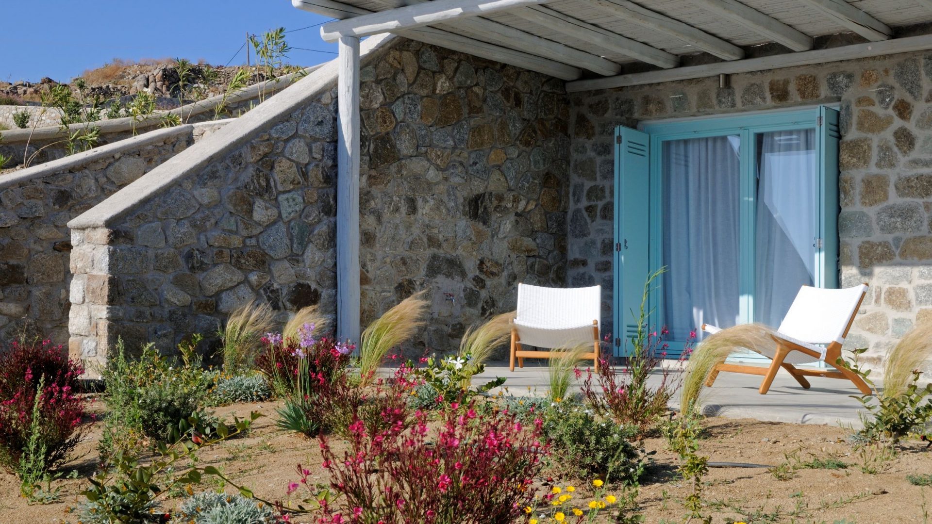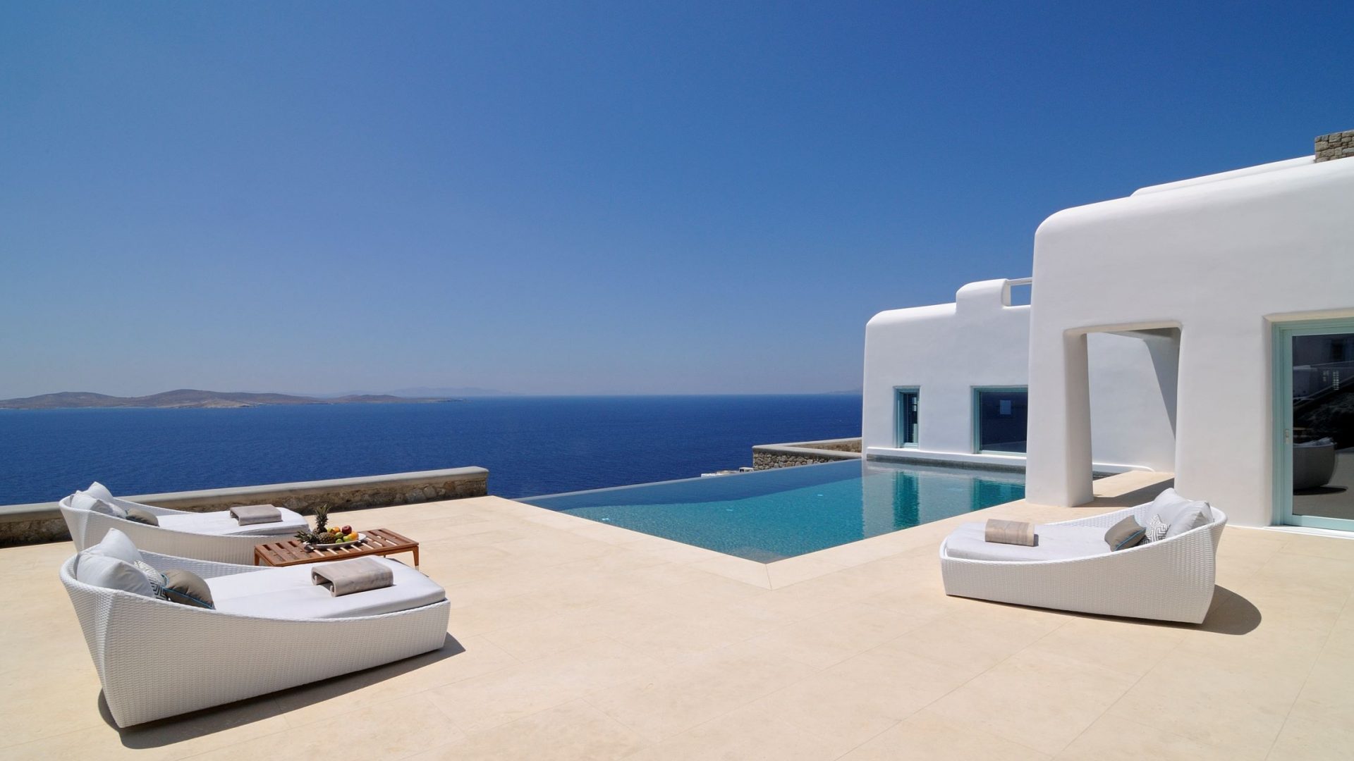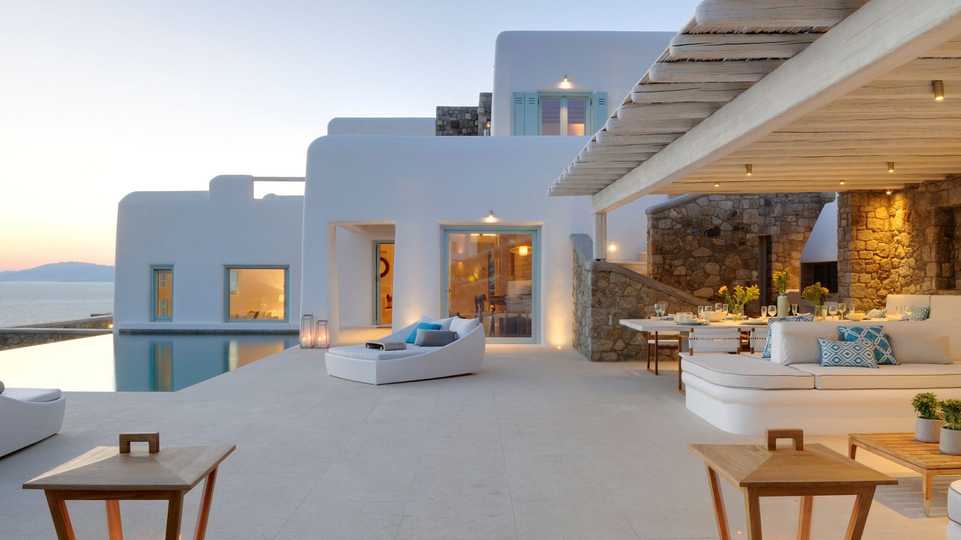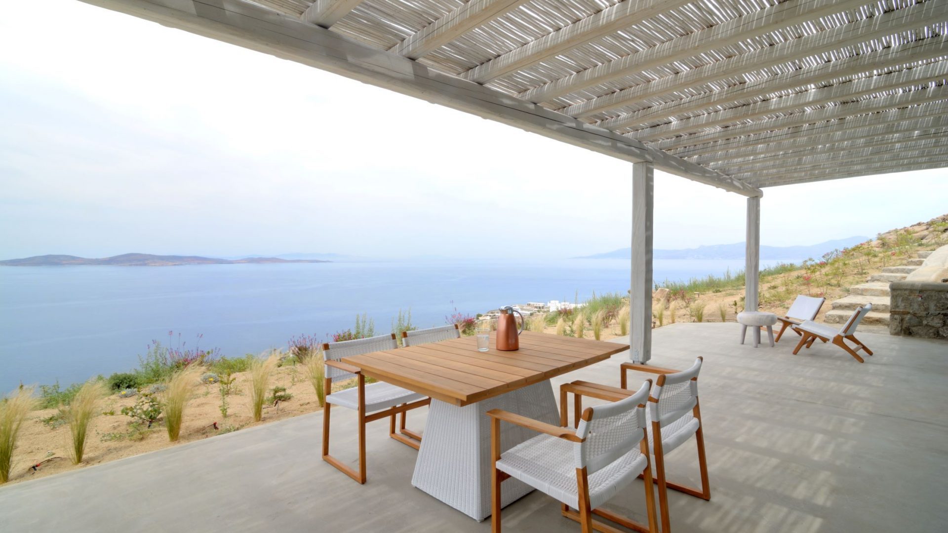 Marvelous views of picturesque Delos and Rhenia islands and enviable island living harmoniously merge into a stunning home that embraces its residents. The stunning views of Delos and Rhenia are perfectly matched by whitewashed architectural elements and natural stone walls.