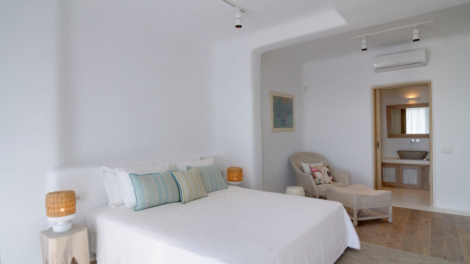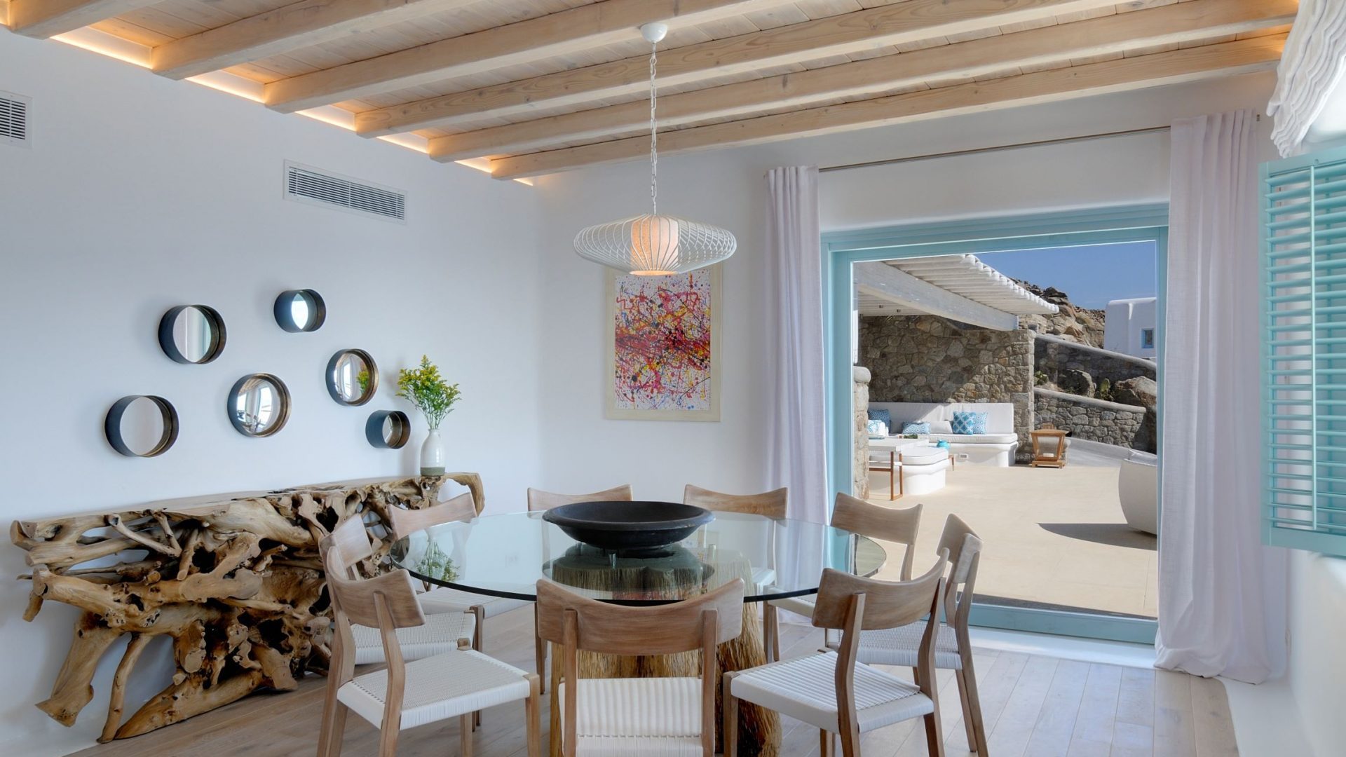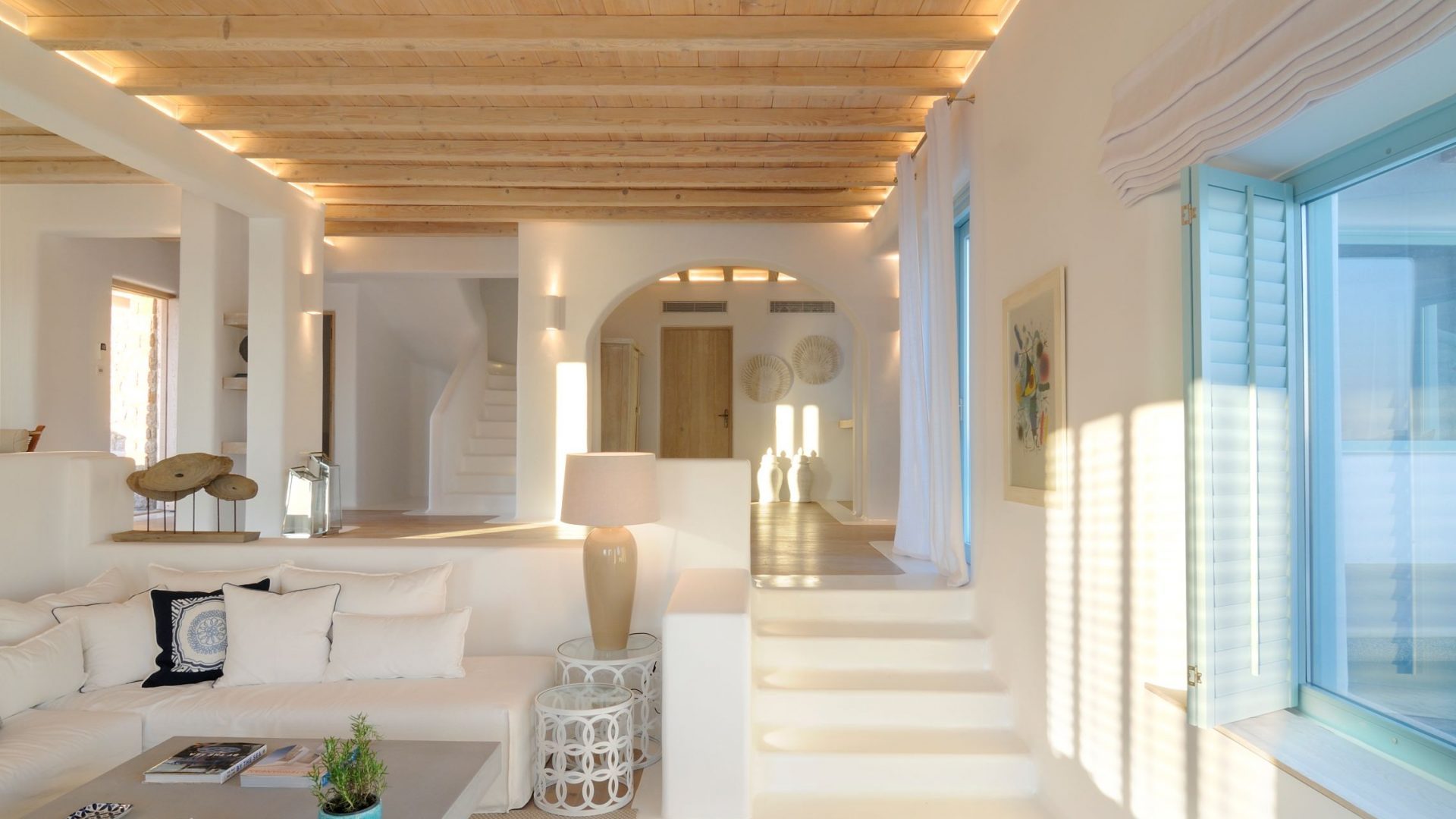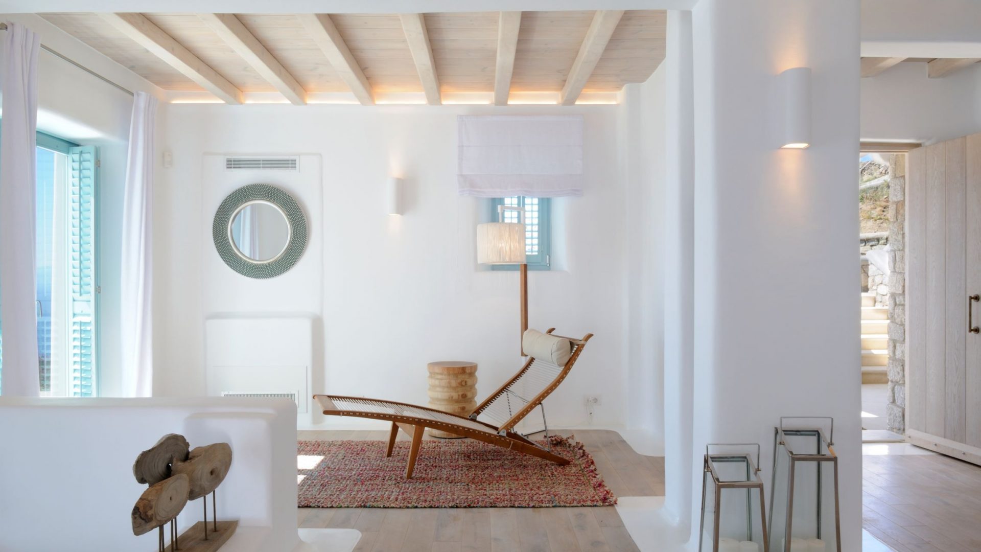 The home’s whitewashed multiple levels sweetly unite with light wood elements and meticulously curated design items. The downstairs bedrooms boast impressive pool windows while all rooms upstairs are highlighted by jaw-dropping sea views which include the picturesque islands of Delos and Rhenia.