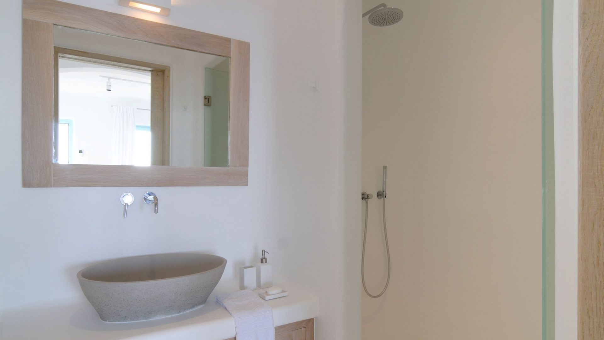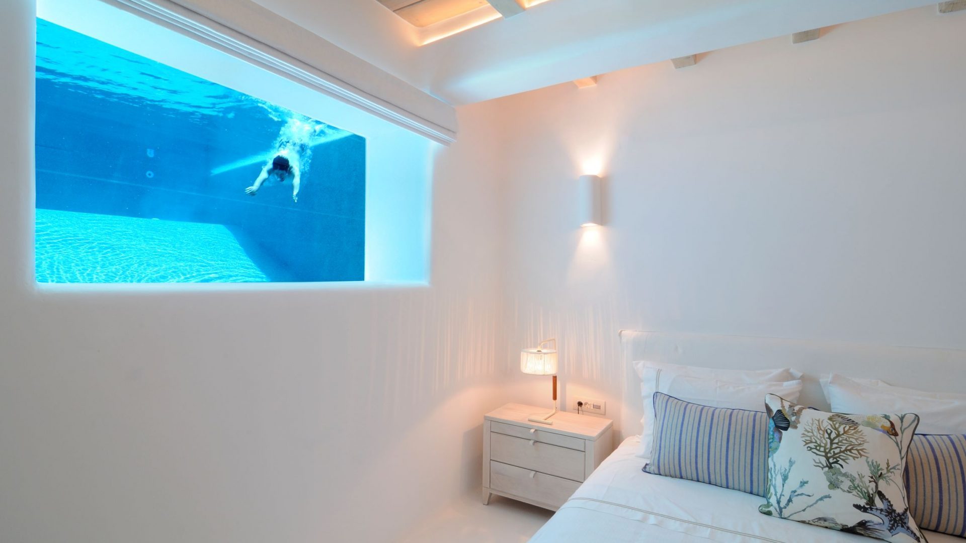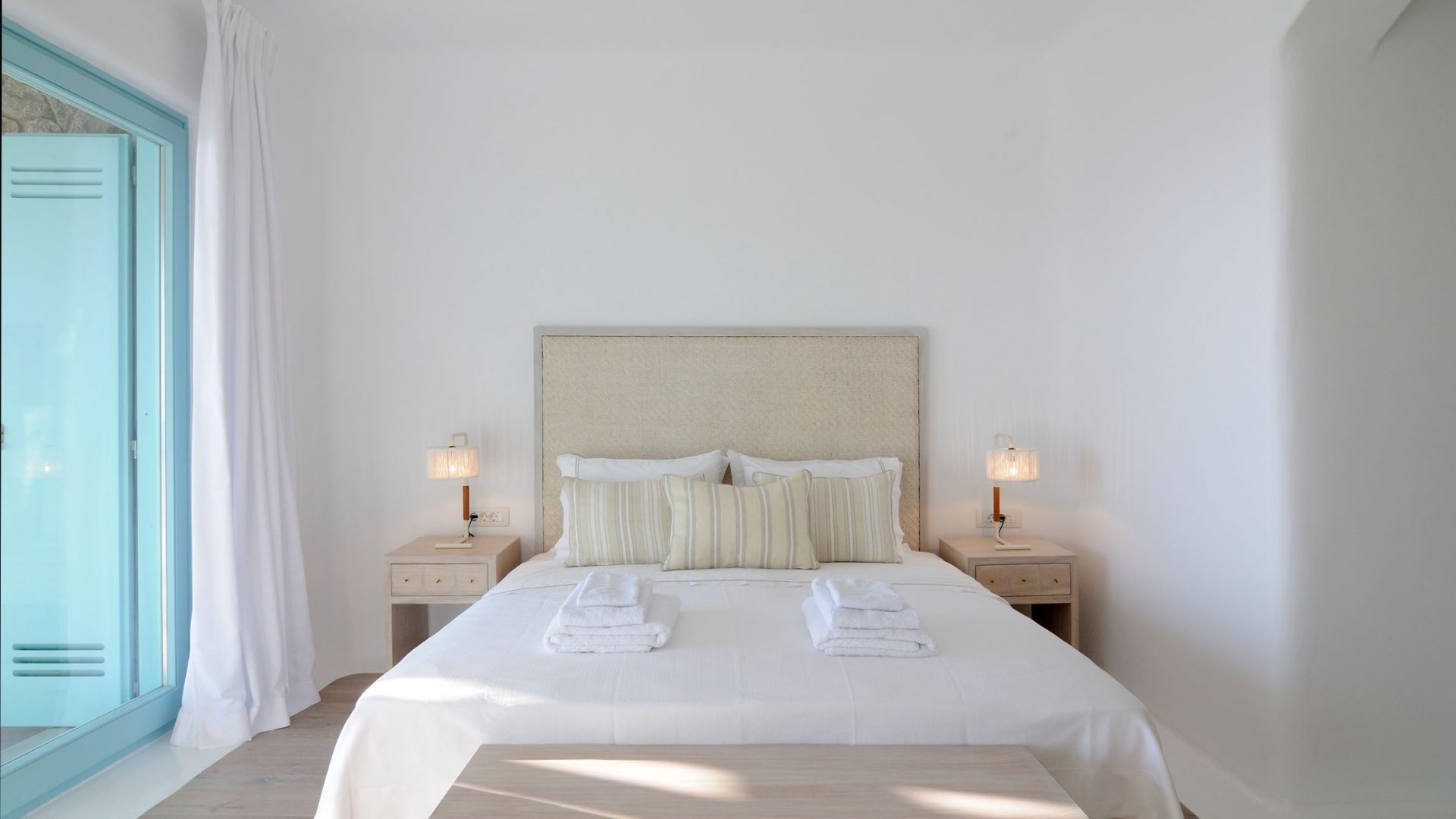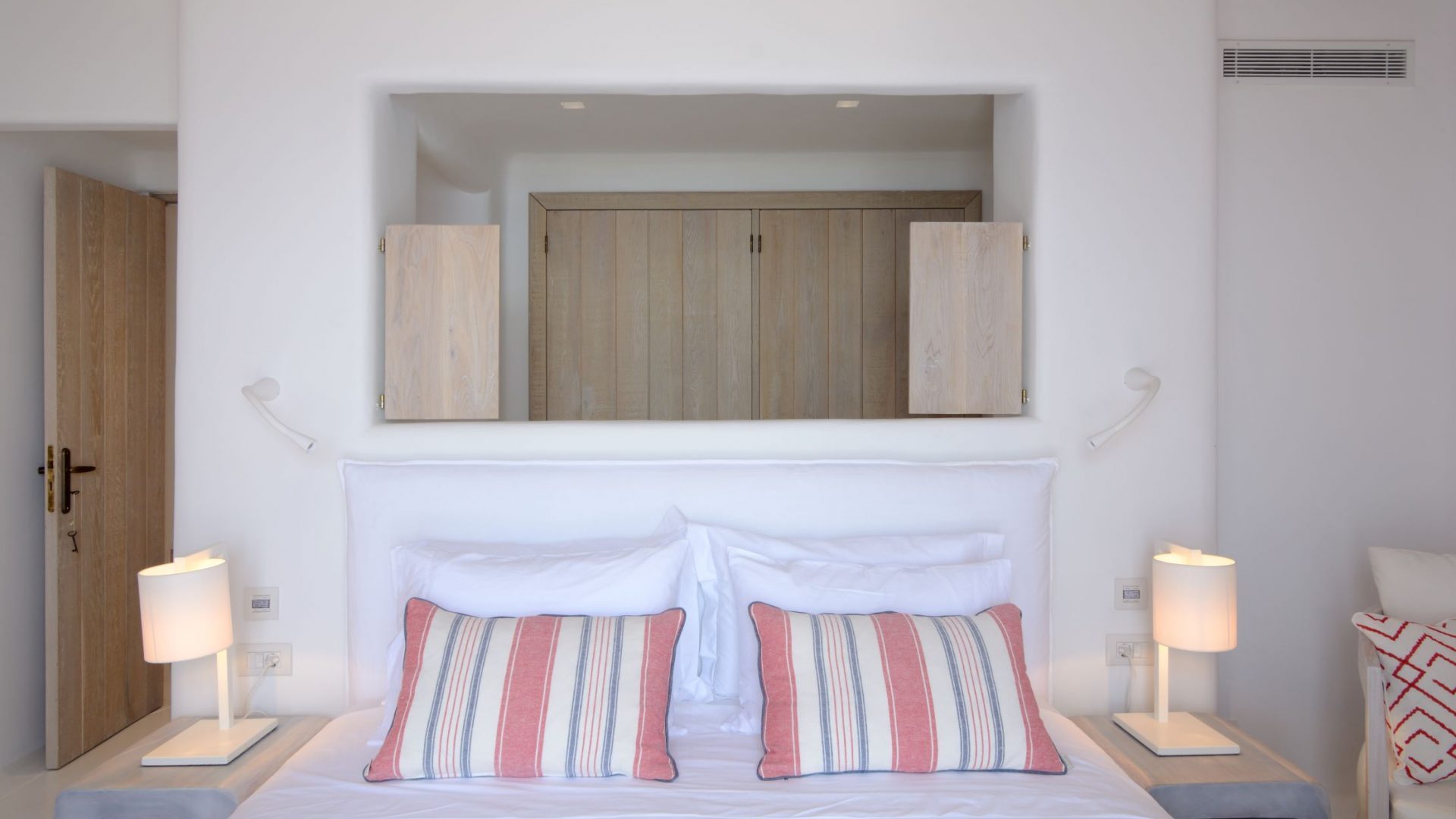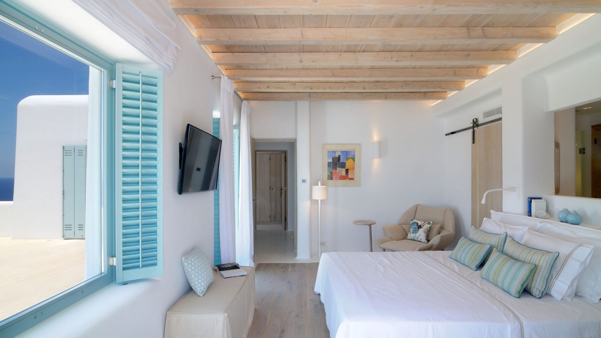The home’s whitewashed multiple levels sweetly unite with light wood elements and meticulously curated design items. The downstairs bedrooms boast impressive pool windows while all rooms upstairs are highlighted by jaw-dropping sea views which include the picturesque islands of Delos and Rhenia.