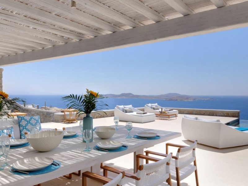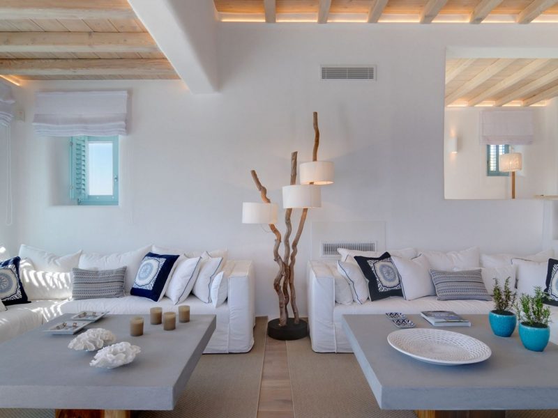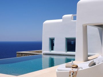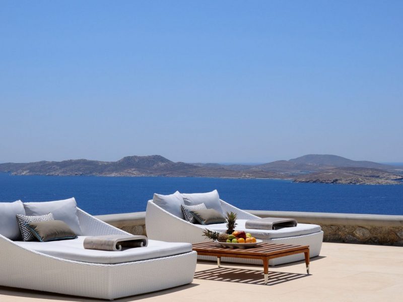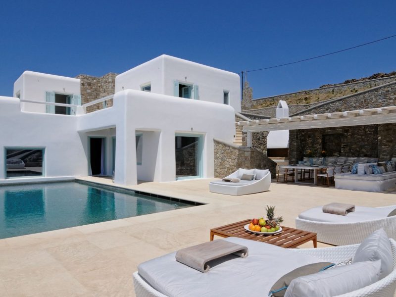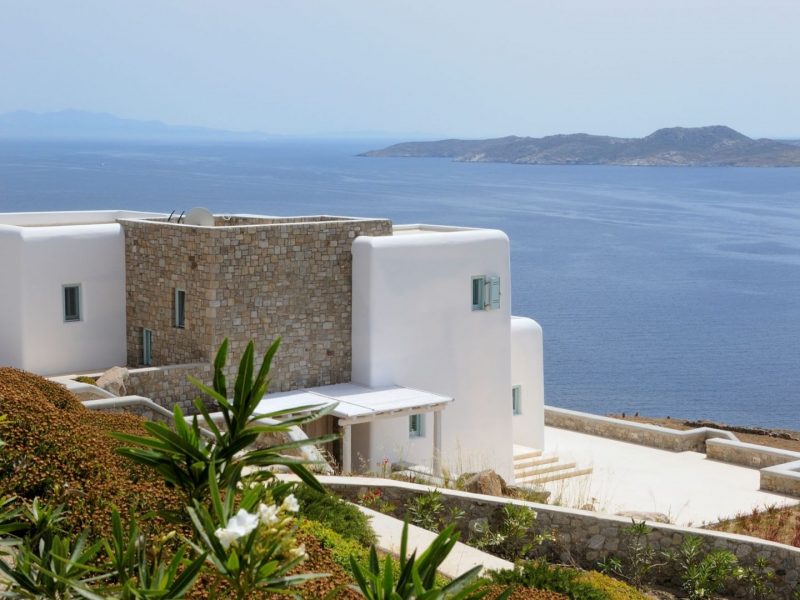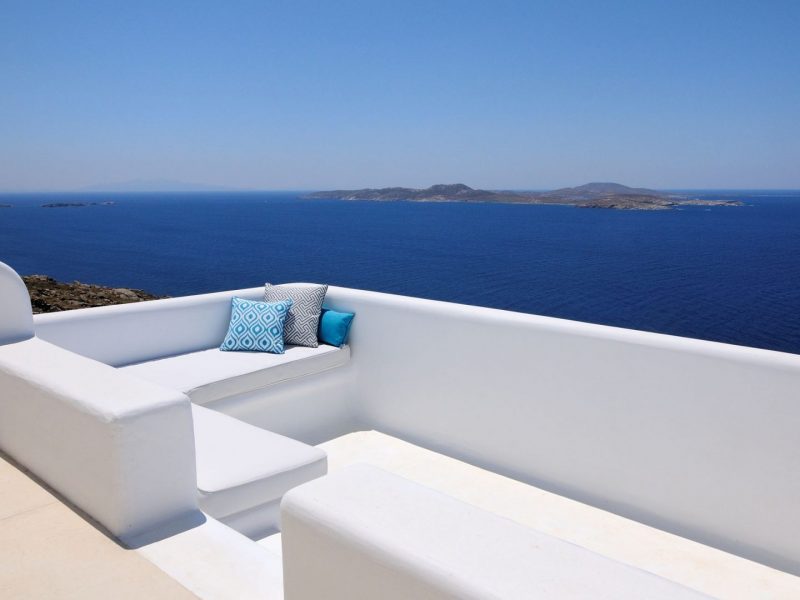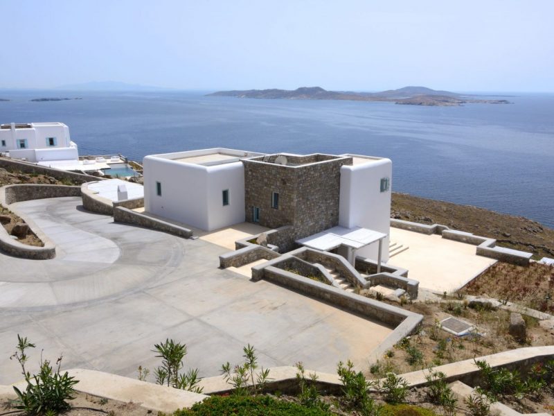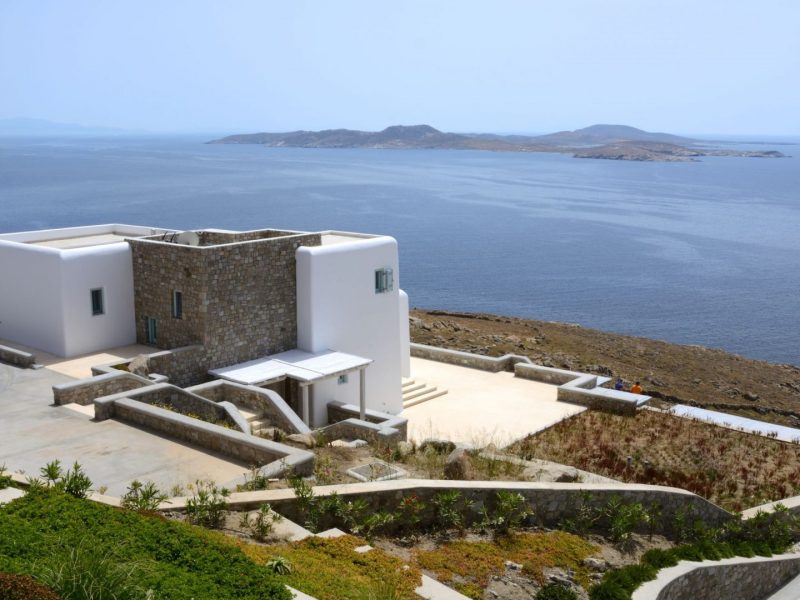 Marvelous views of picturesque Delos and Rhenia islands and enviable island living harmoniously merge into a stunning home that embraces its residents. The stunning views of Delos and Rhenia are perfectly matched by whitewashed architectural elements and natural stone walls.