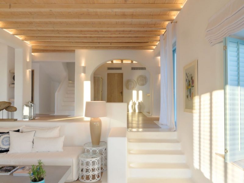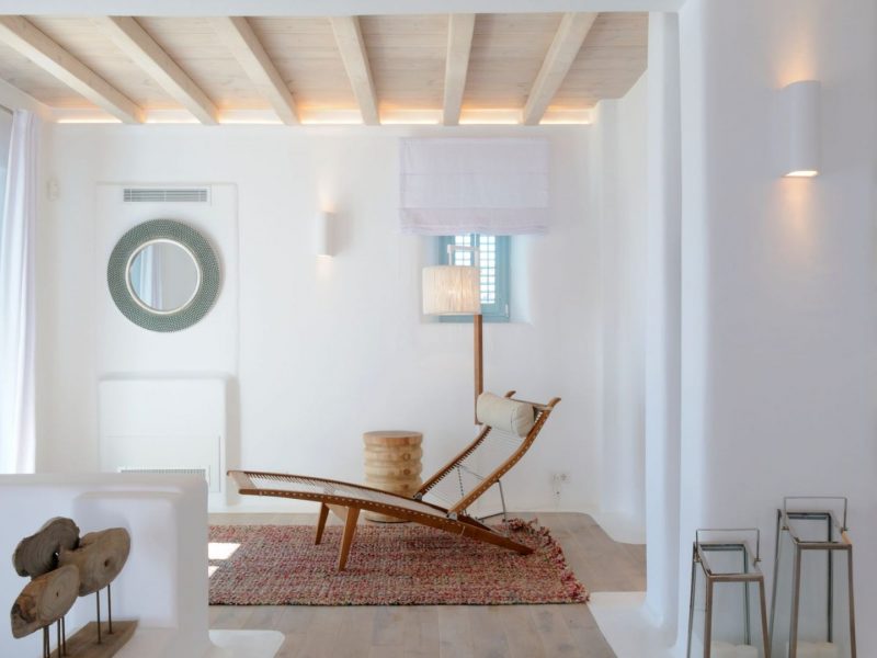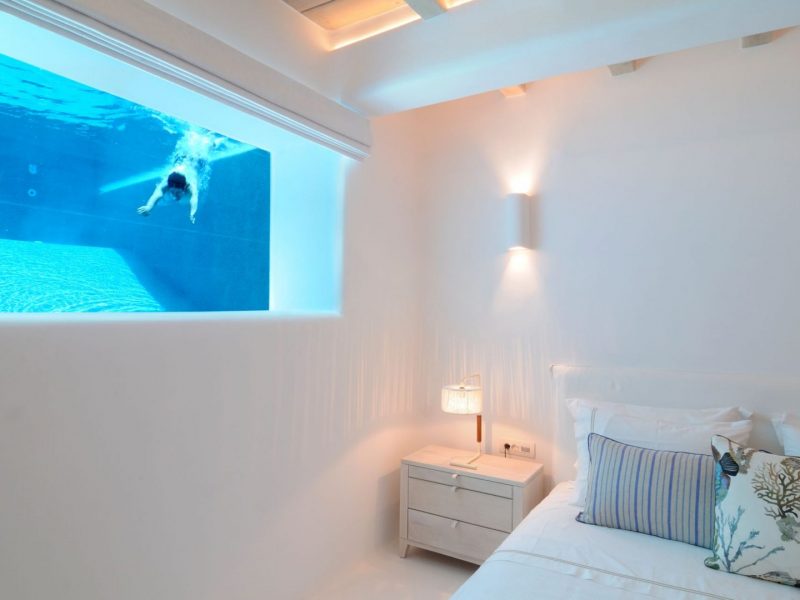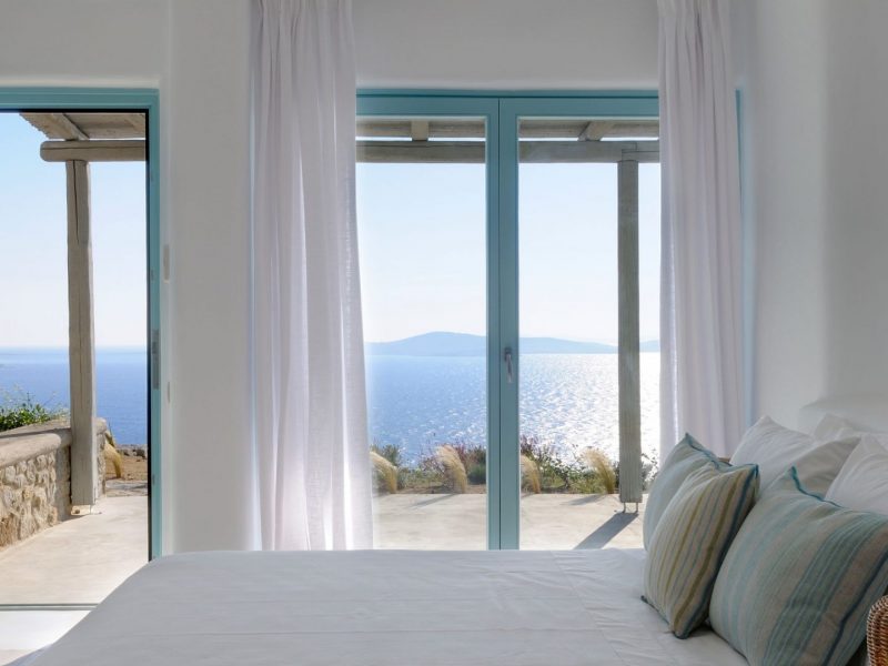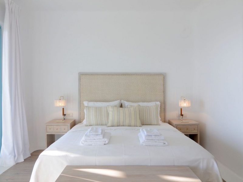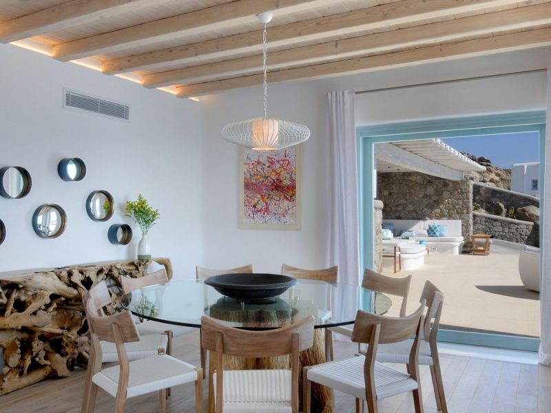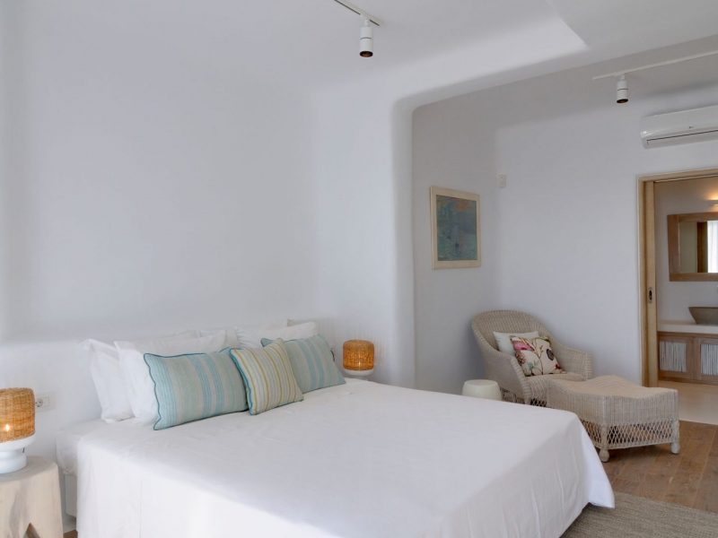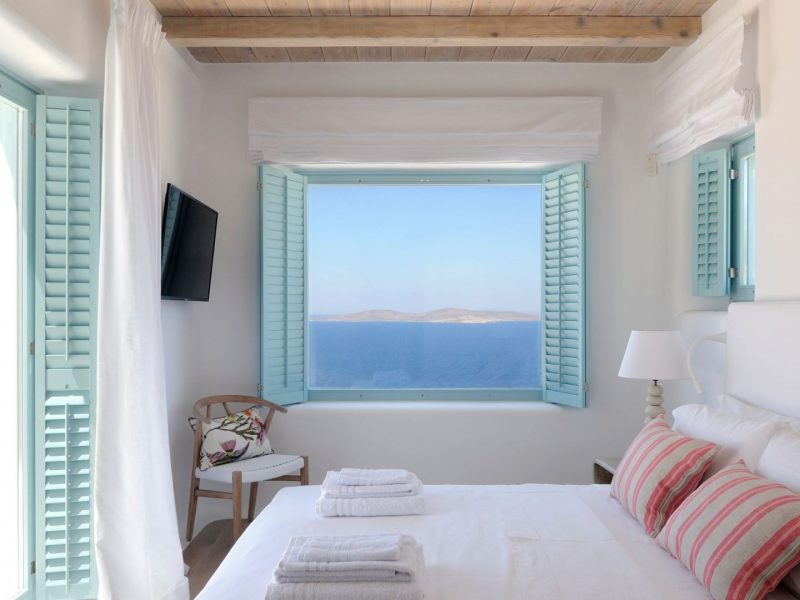 The home’s whitewashed multiple levels sweetly unite with light wood elements and meticulously curated design items. The downstairs bedrooms boast impressive pool windows while all rooms upstairs are highlighted by jaw-dropping sea views which include the picturesque islands of Delos and Rhenia.
