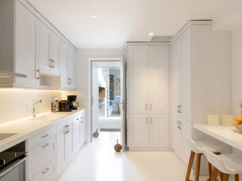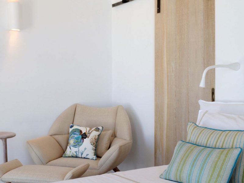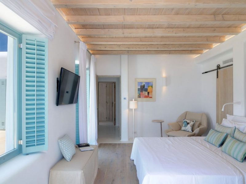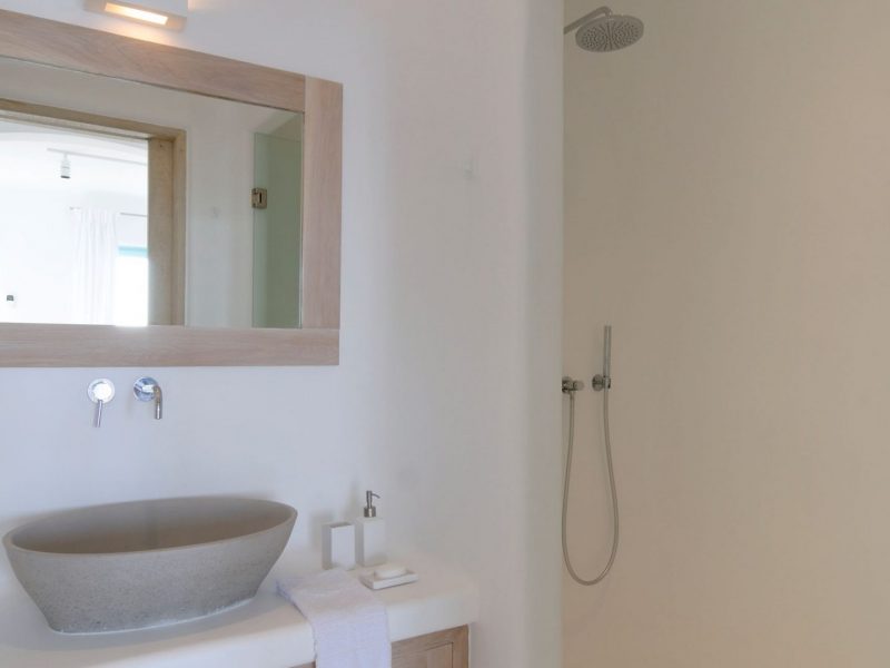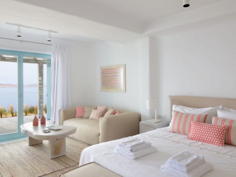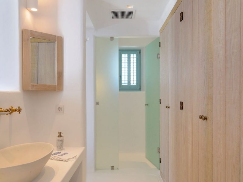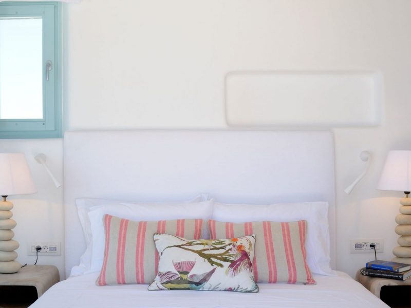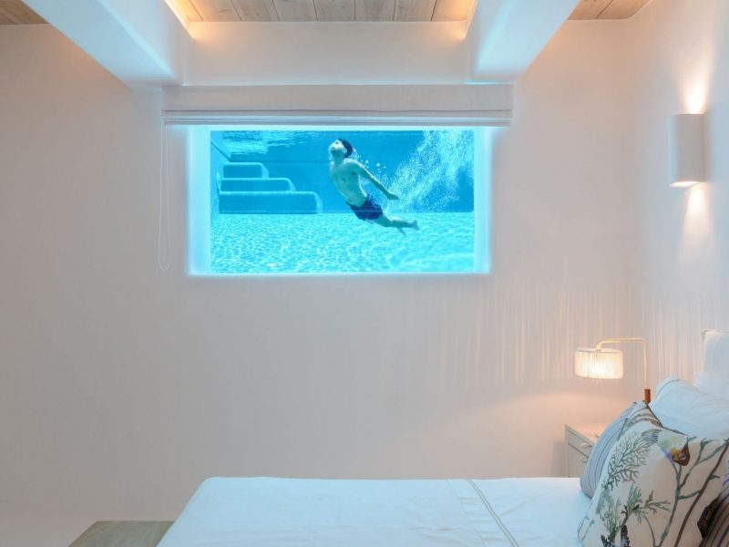 The home’s whitewashed multiple levels sweetly unite with light wood elements and meticulously curated design items. The downstairs bedrooms boast impressive pool windows while all rooms upstairs are highlighted by jaw-dropping sea views which include the picturesque islands of Delos and Rhenia.