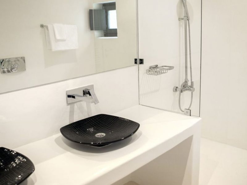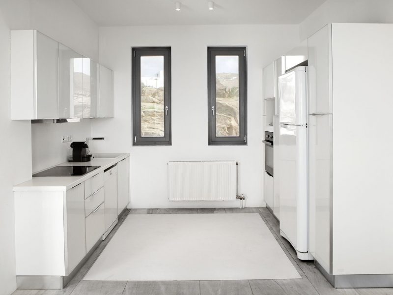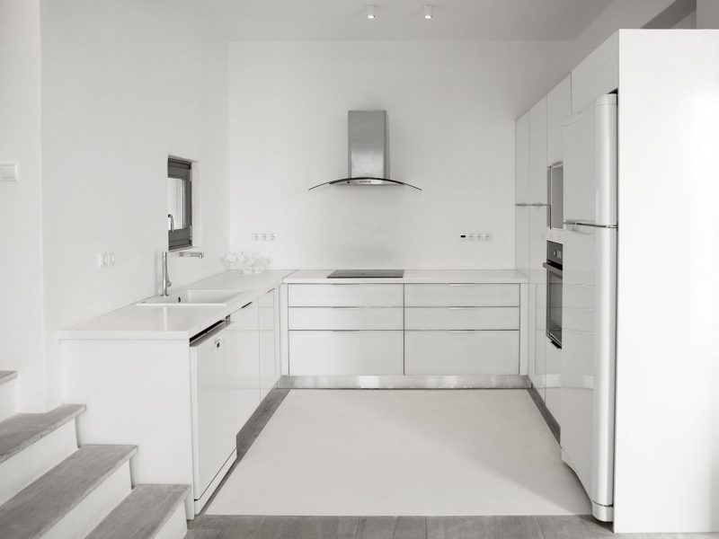 The villa is an excellent example of modern architecture. It is spacious with an all-white contemporary décor that gives a touch of luxurious purity. There is a modern open kitchen, with a cozy, charming dining area and a bright living room with direct access to the pool terrace.