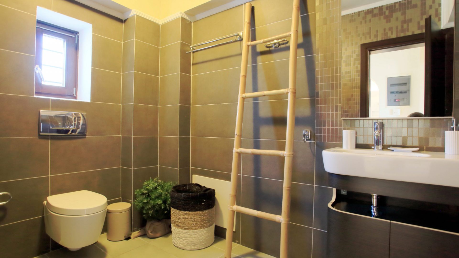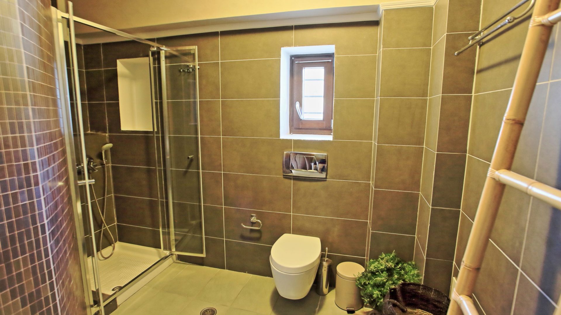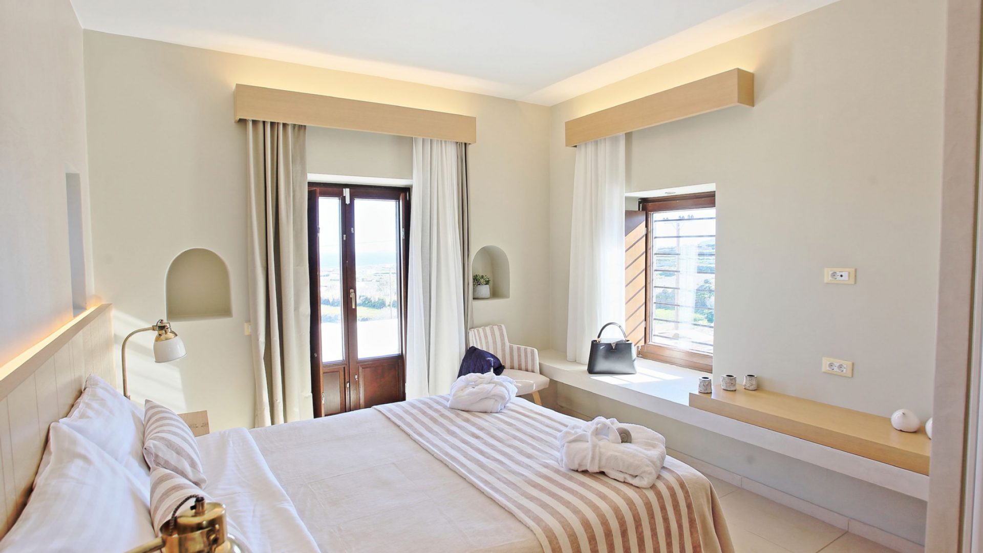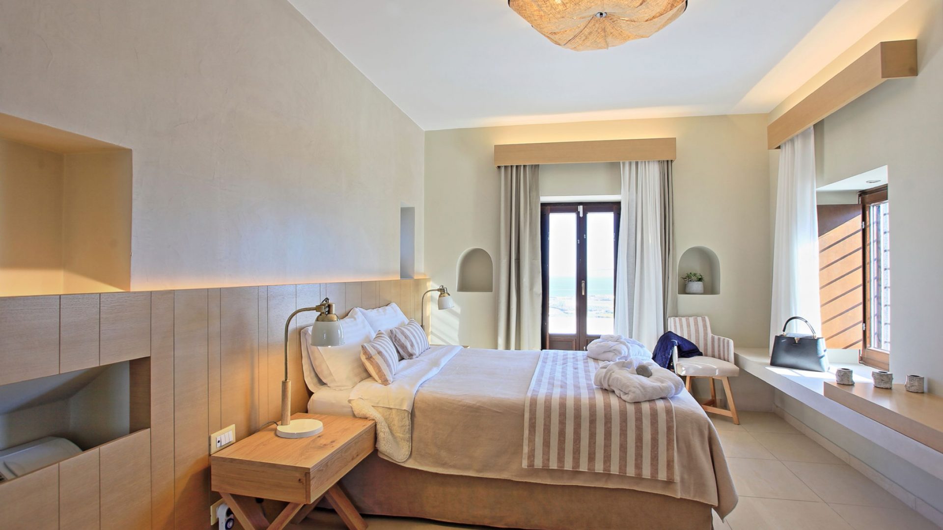 The main building on the ground floor features a spacious living room, a modern dining area, and a full equipped simplistic designed kitchen. This floor also features two ample elegantly decorated bedrooms with two bathrooms. All rooms offer amazing sea views.