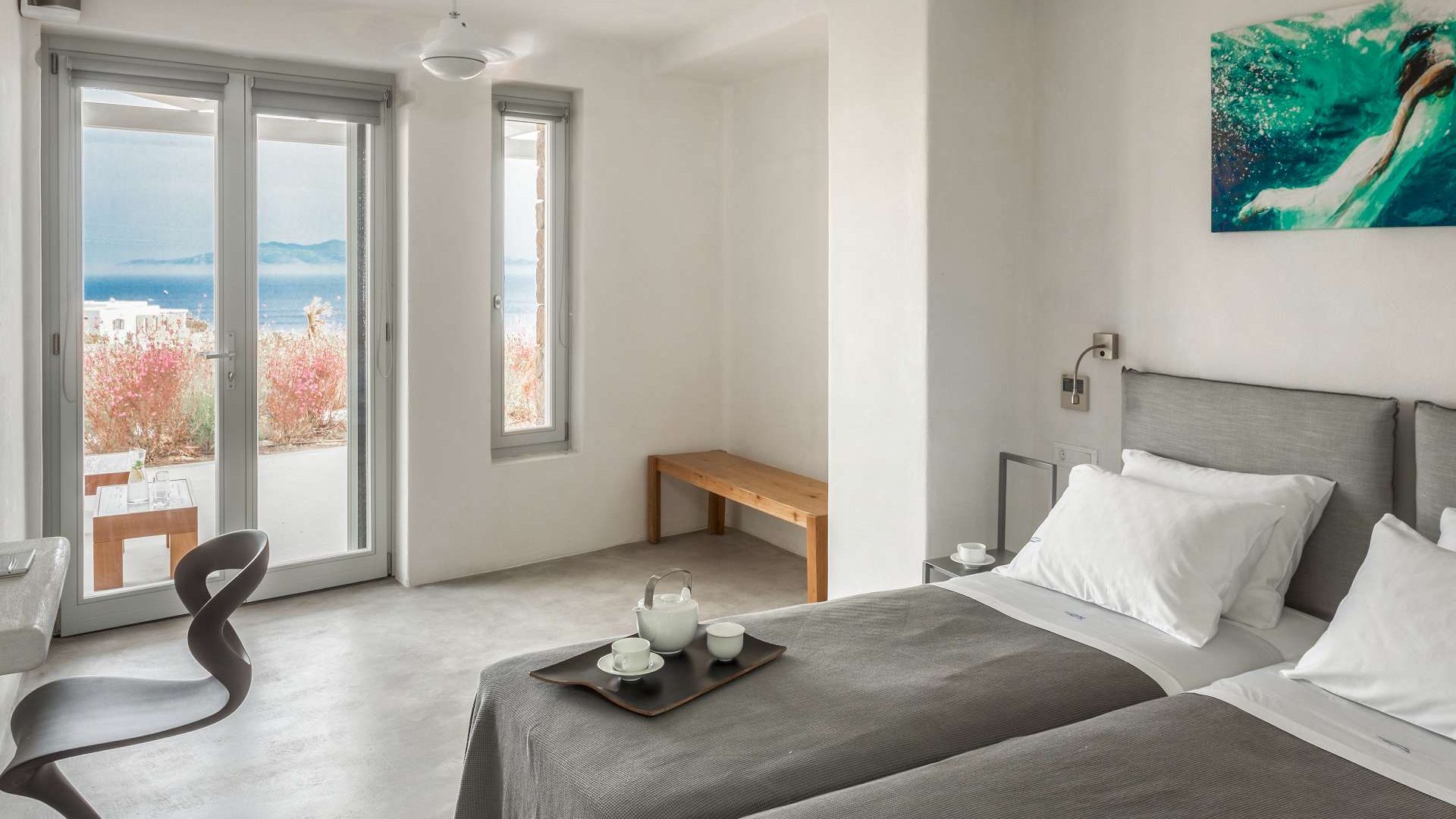 Lie back, relax and take in the spectacular view over Elia beach and the infinite Aegean sea.
