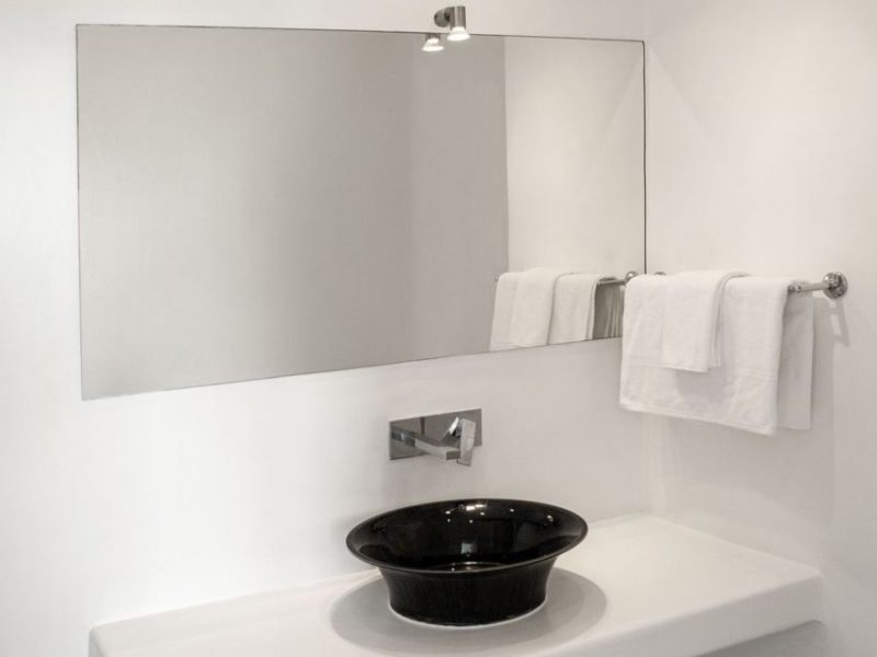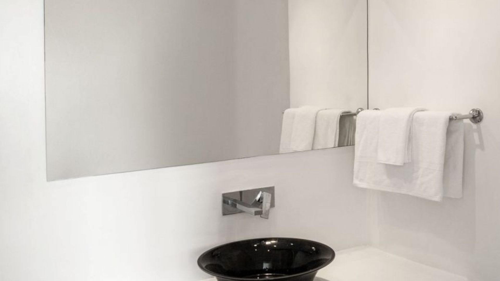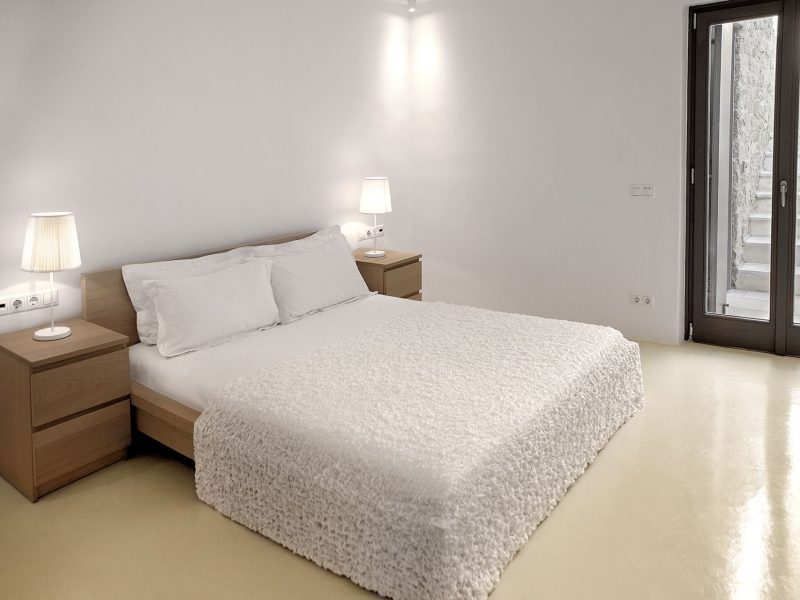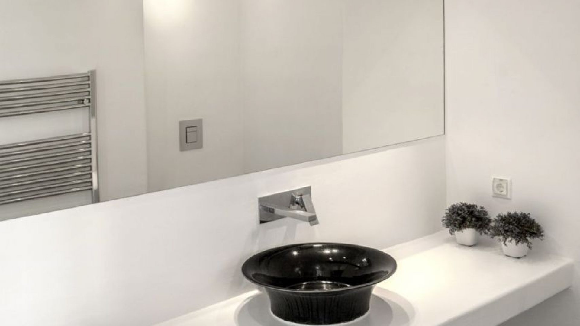 The interior is an all-white minimal modern décor. There is a bright, cozy living and dining room perfect for relaxing and spending time in. Also, there is a modern open kitchen that completes the guest’s needs.