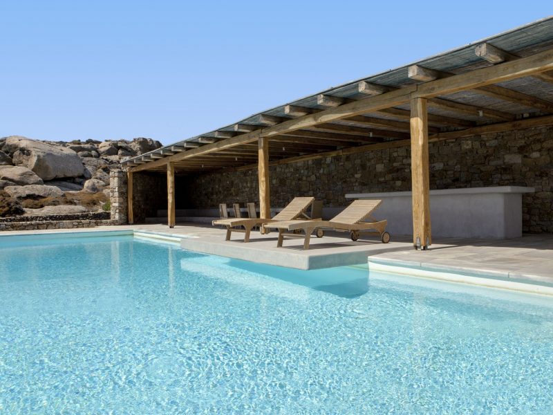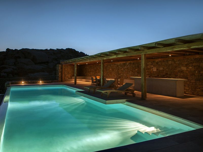 The front terrace again has a great infinity pool with a relaxing shaded pergola. There is a generous outdoor dining and lounge area with a luxurious summer bar looking at the magical Aegean Sea views that offer guests just the perfect holidays.