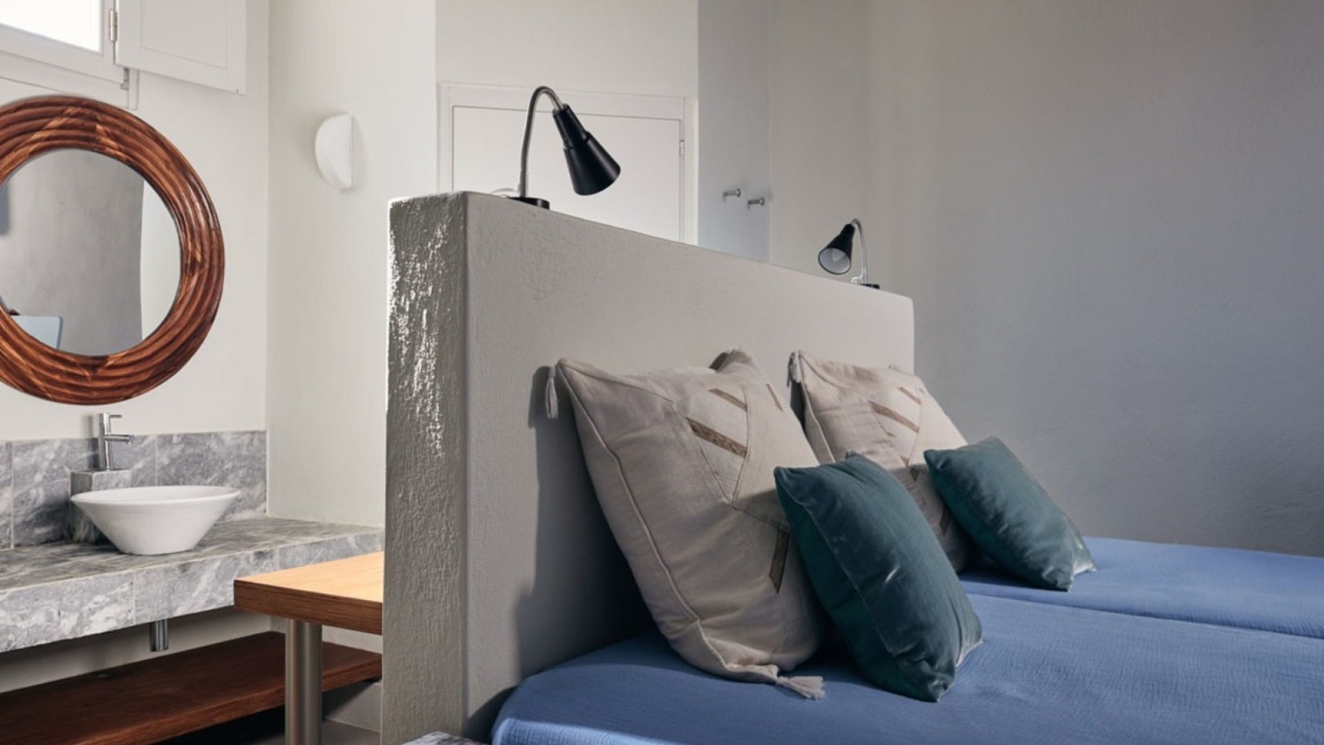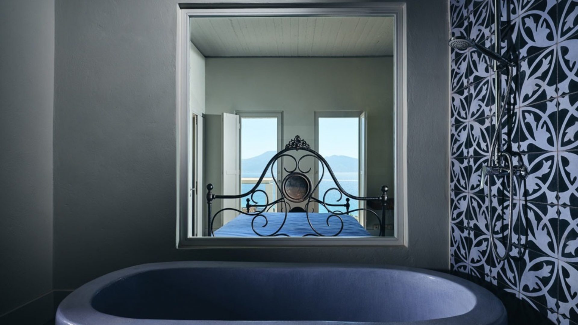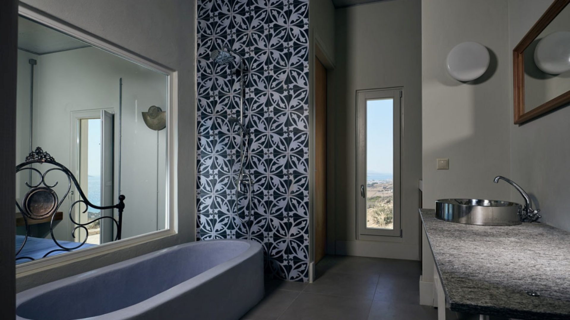The master bedroom has a built-in bathtub, a big window overlooking the beach and a bathroom with handmade cement colored tiles.