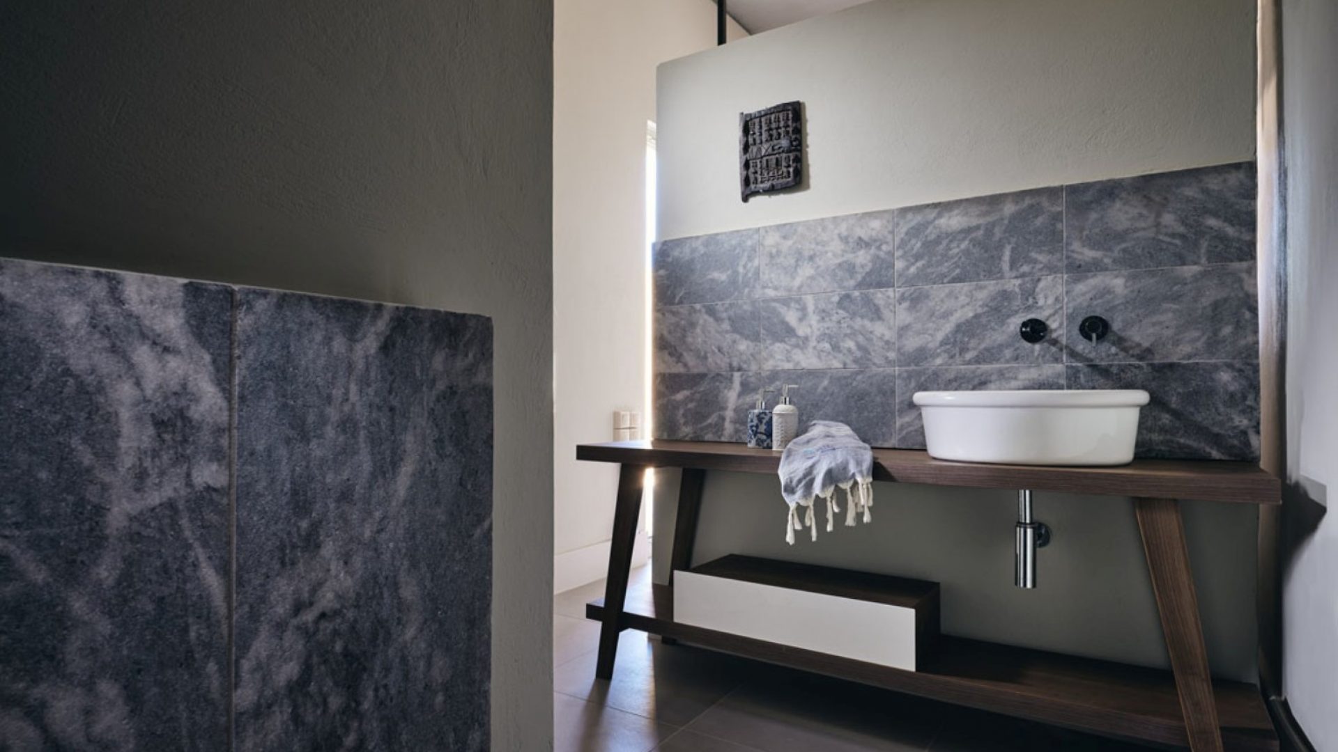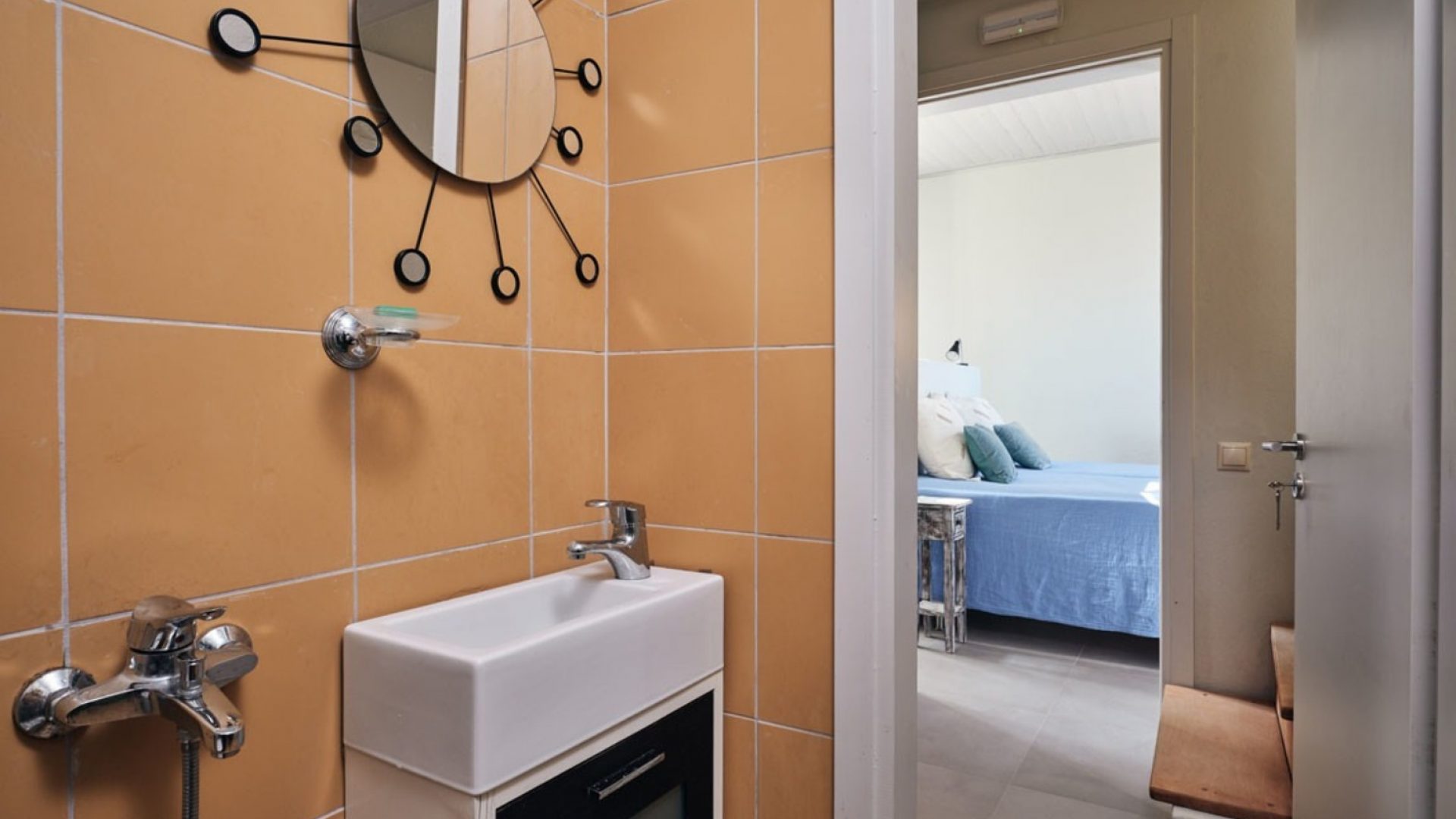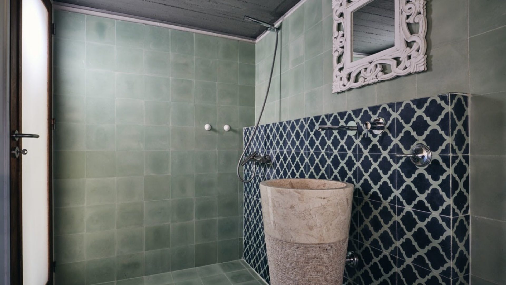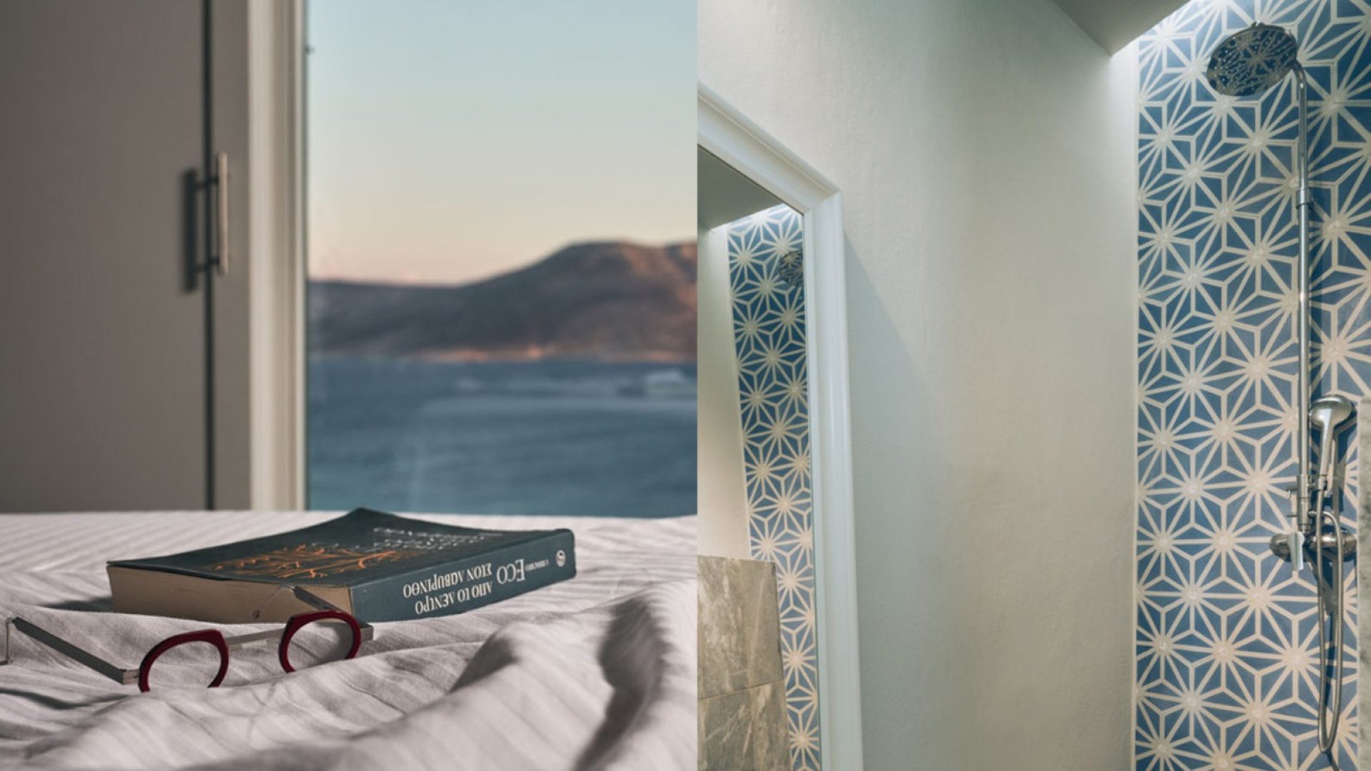 The master bedroom has a built-in bathtub, a big window overlooking the beach and a bathroom with handmade cement colored tiles.