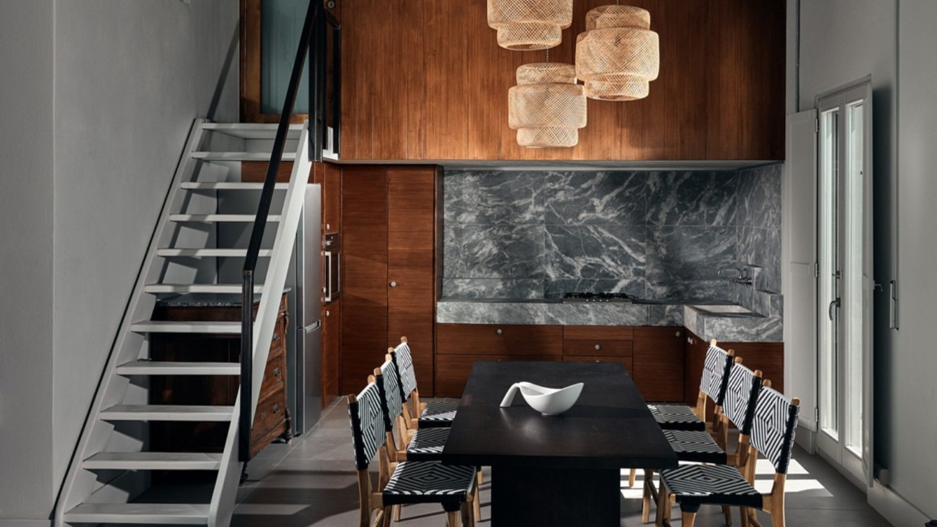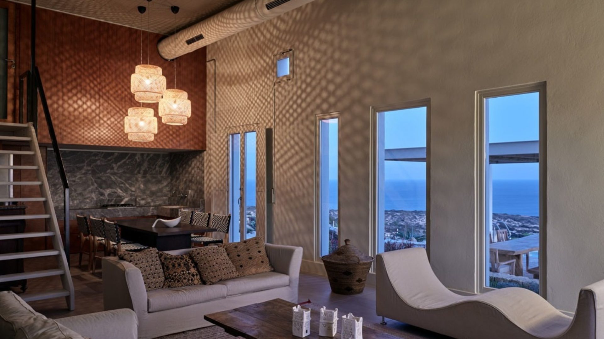 Big windows let the landscape flow onto the interior which features a joyful blend of contemporary design and modern furniture. The living/dining room building has a double height with a marble top kitchen and a fireplace.