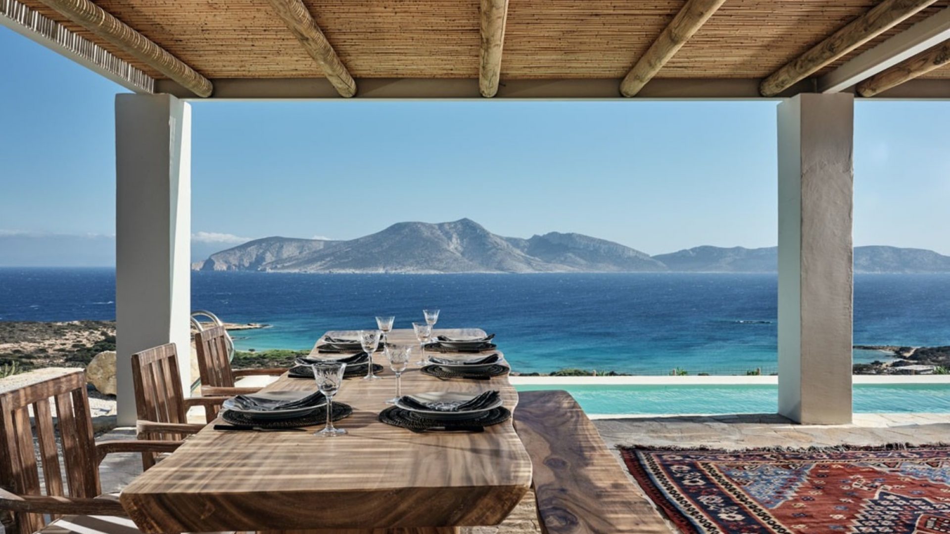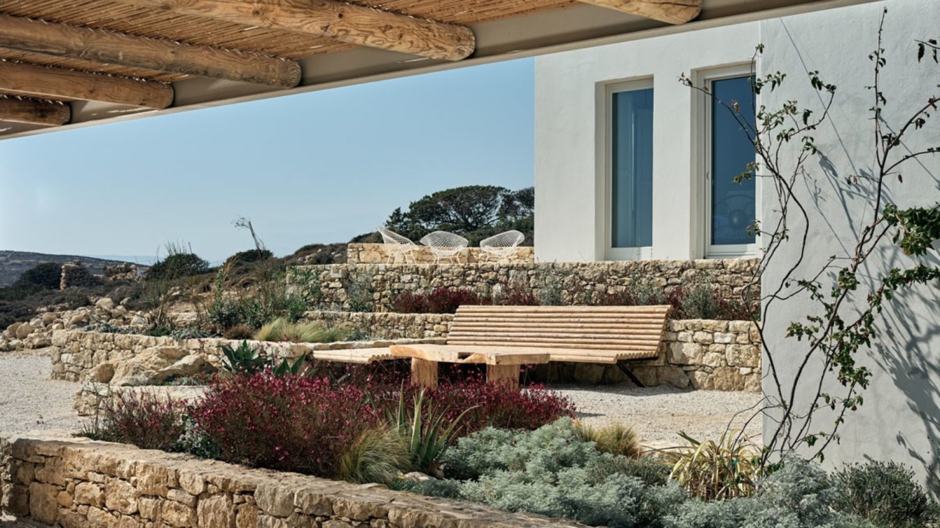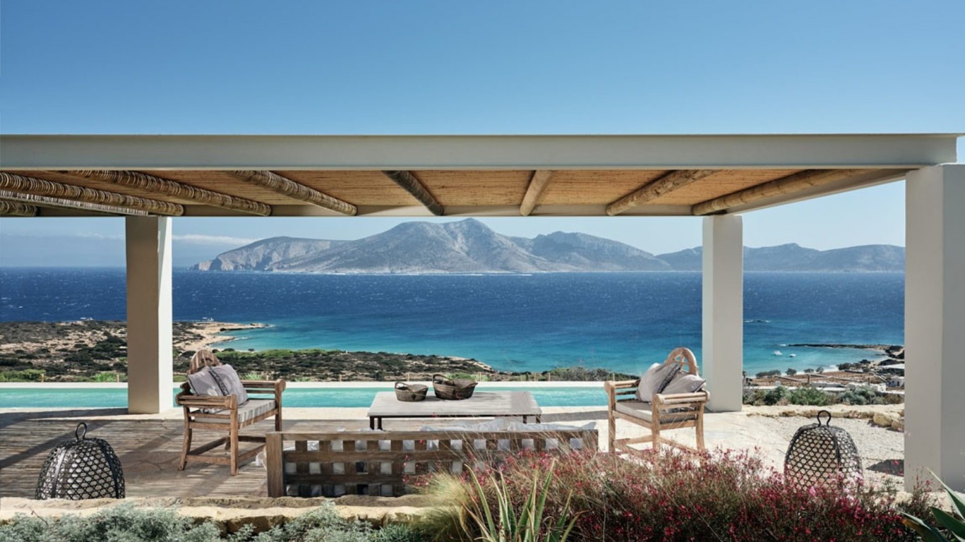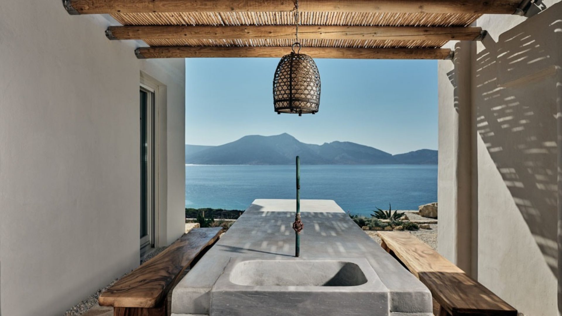 The outdoor areas and garden invite guests to cool down from the summer heat and enjoy the magnificent view of the sea and Keros island.