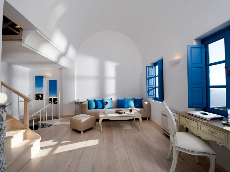 The Executive 3 Bedroom Villa is a Santorinian luxury house where the elements of rock, wood, white and blue colors dominate in its decoration. Simple yet chic, luxurious with a sense of space, style and colorful ambiance. The Executive Three Bedroom Villa has Lights colors, ambient atmosphere, intimate details and plenty of space and can accommodate up to seven persons. The living area has flat screen TV, working space with WIFI internet access and a kitchen with dining area and facilities, as well as two bathrooms (one with Jacuzzi tub), wooden deck veranda equipped with wooden furniture and sun loungers, and private swimming pool, with a unique view to the volcano and the Caldera.