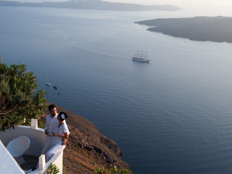 The setting of this former convent (built around 1720) and the garden with mature trees (another unique sight along the Caldera) shelter from curious eyes and create an atmosphere of serenity. The view, stretching across the entire crater from world famous Oia in the North to Akrotiri in the South, changes colour throughout the day creating a mesmerizing scenery for unforgettable family reunions or parties for large groups of friends.