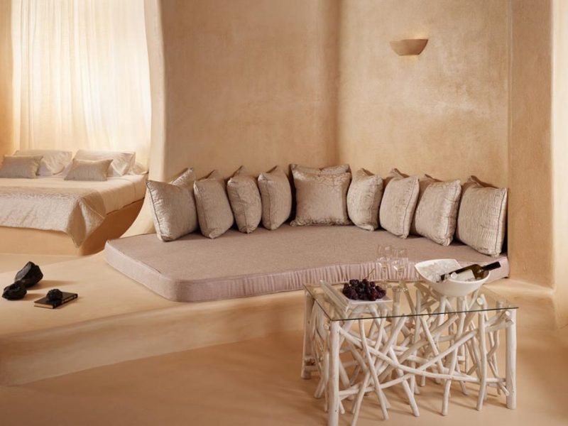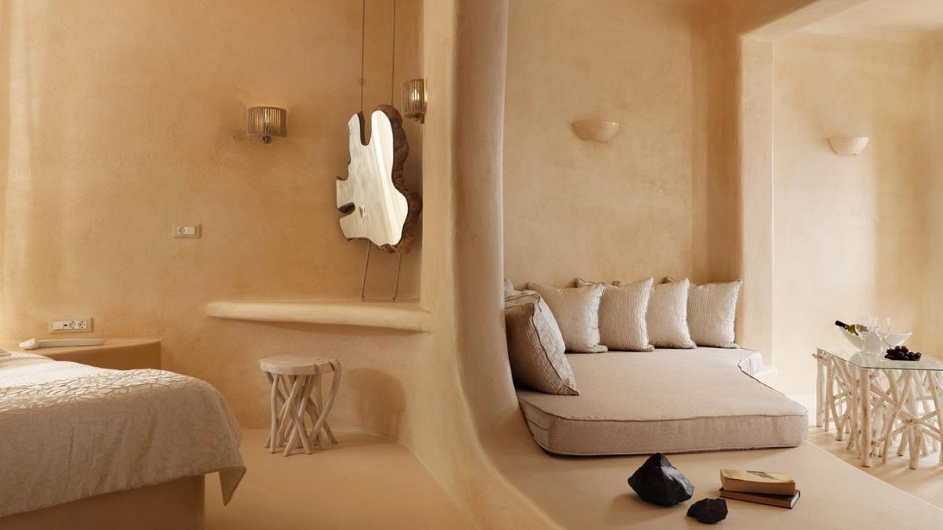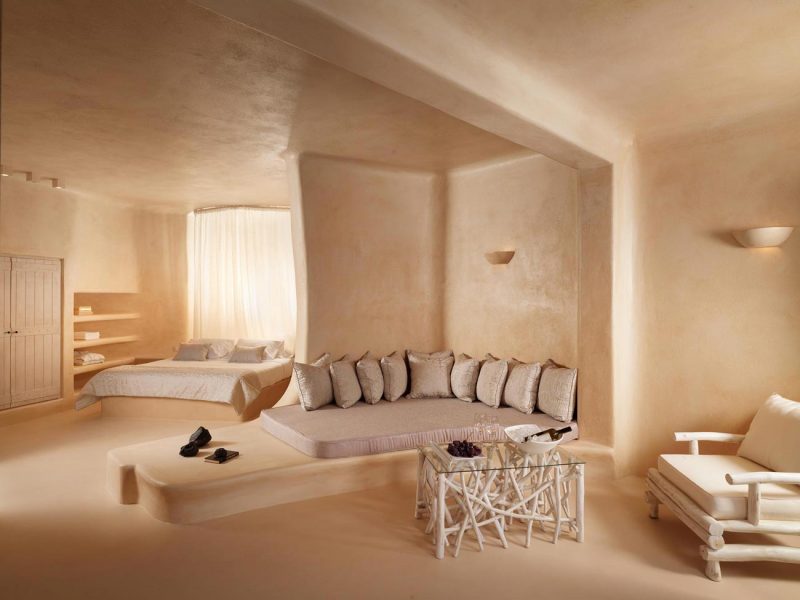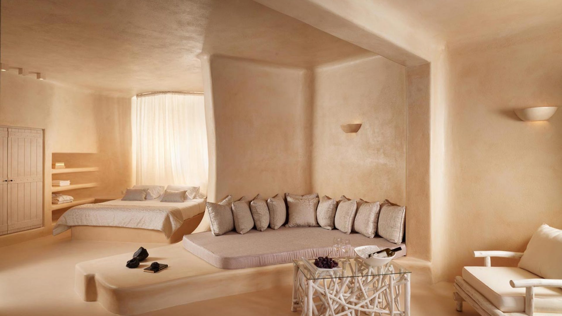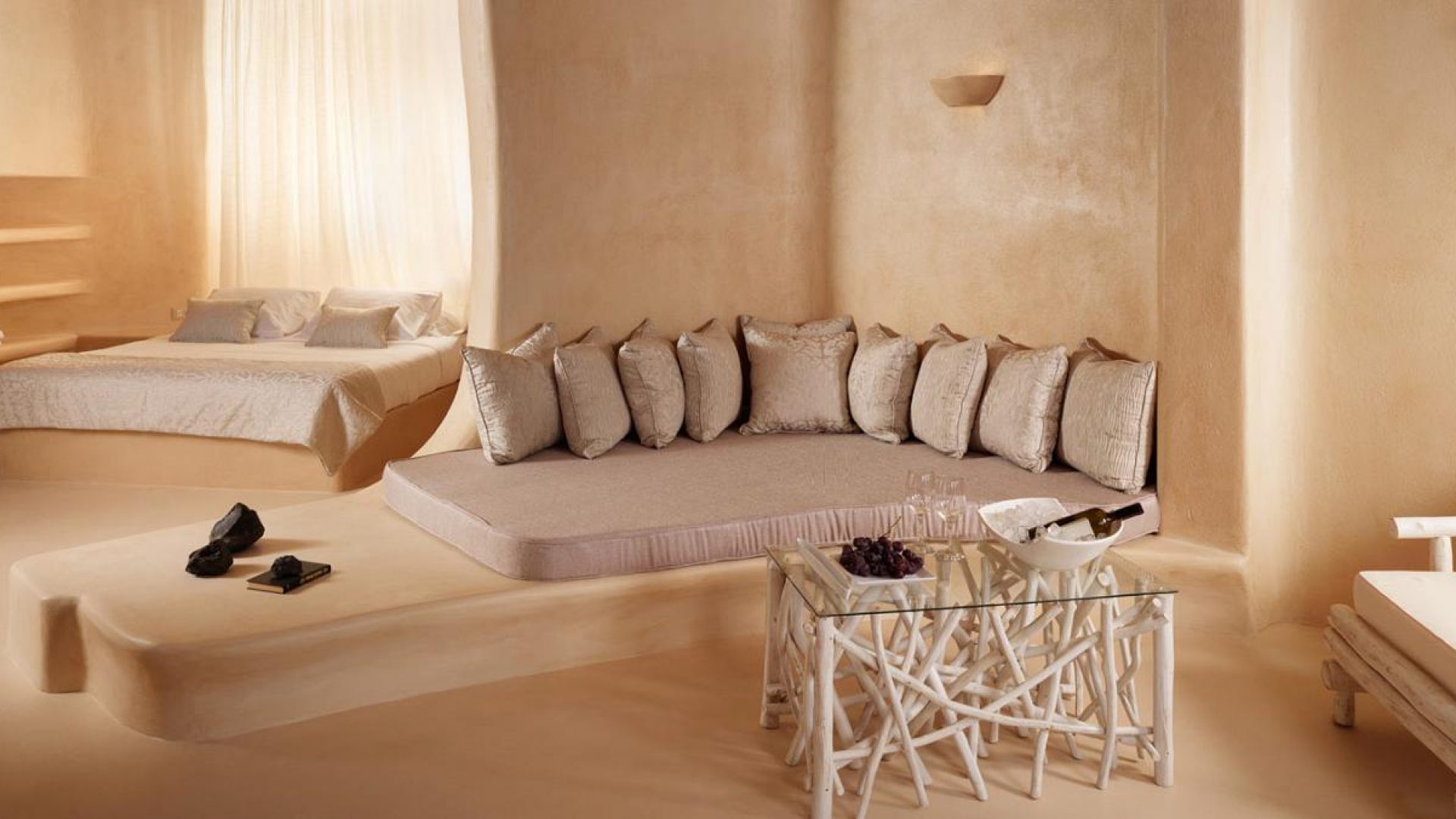 The exquisite living room opens out to the private veranda where the newlyweds can relax and be swept away by the aura of the scenery and the breathtaking panoramic views of the Aegean.