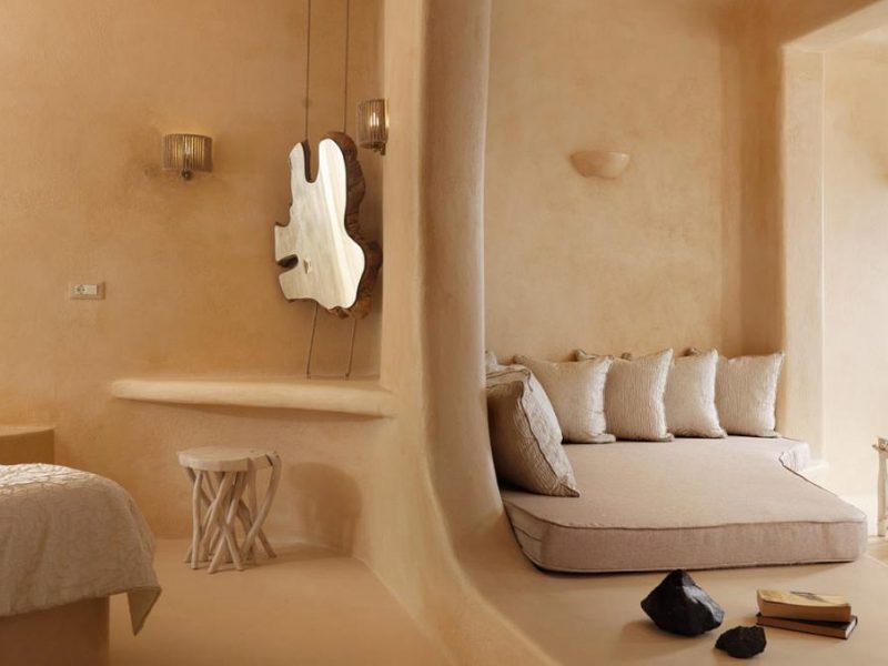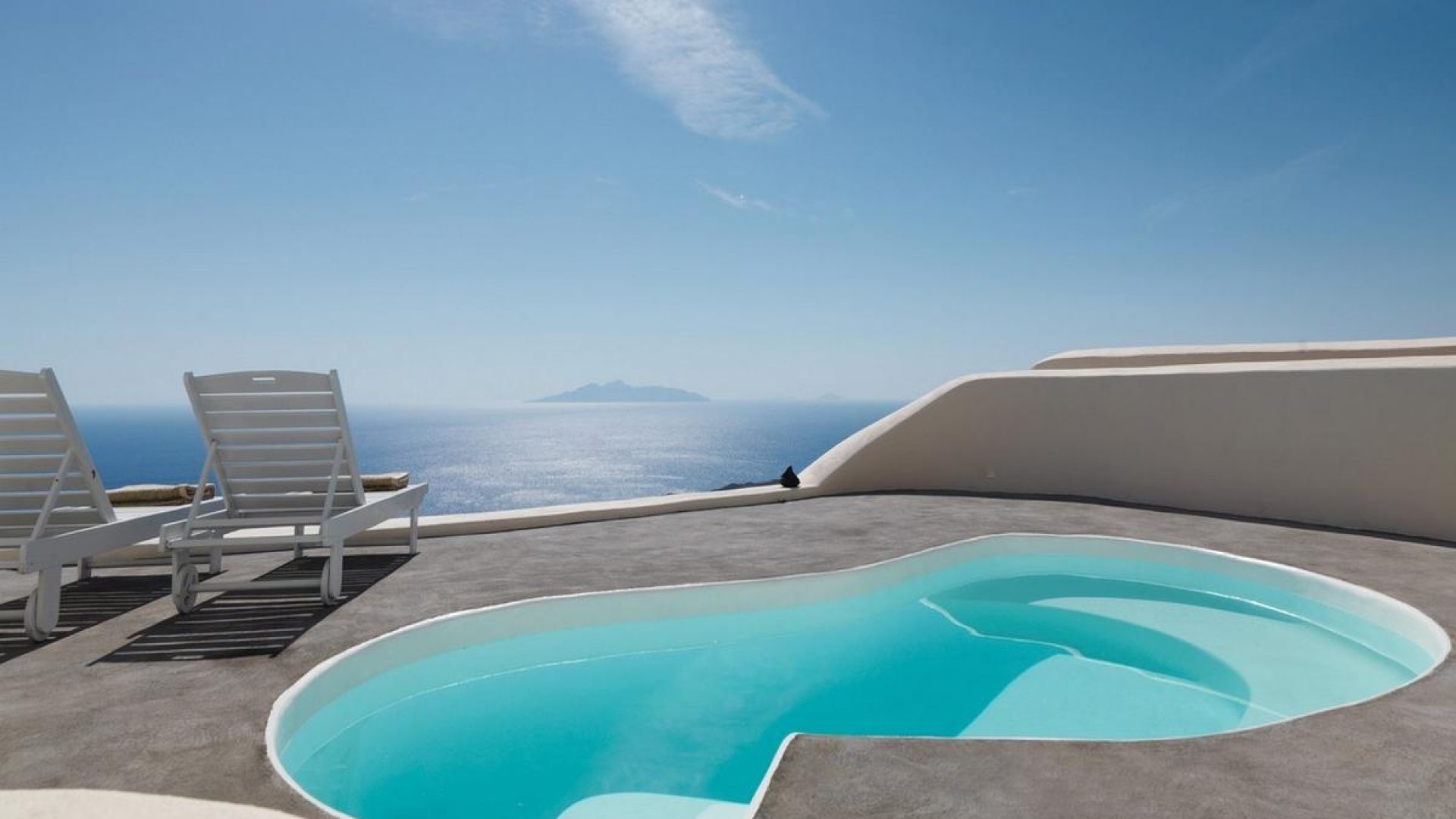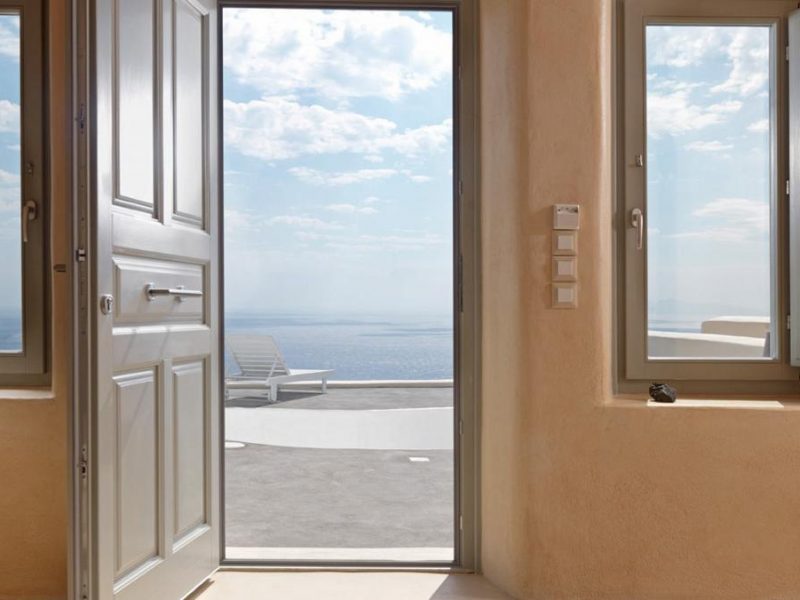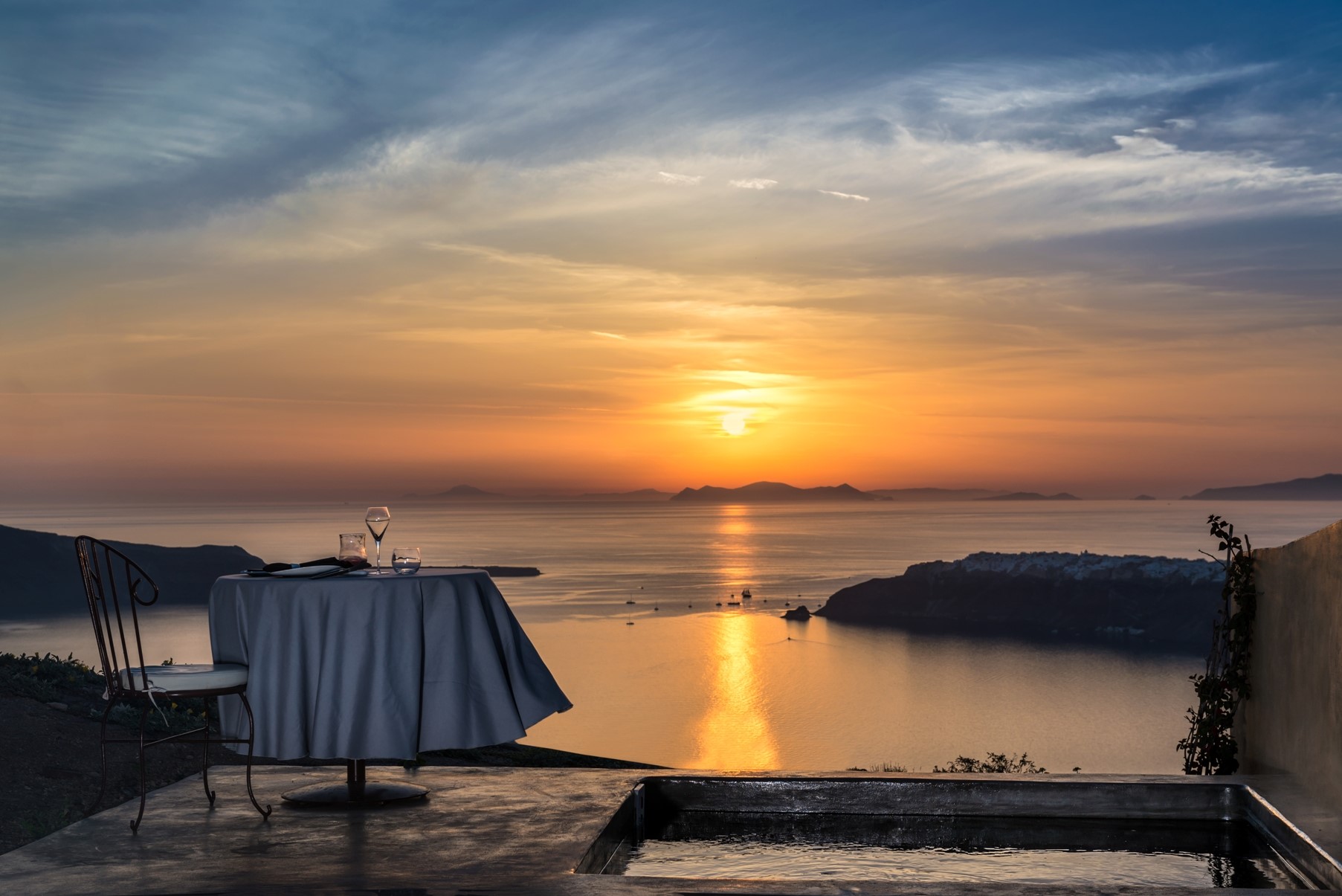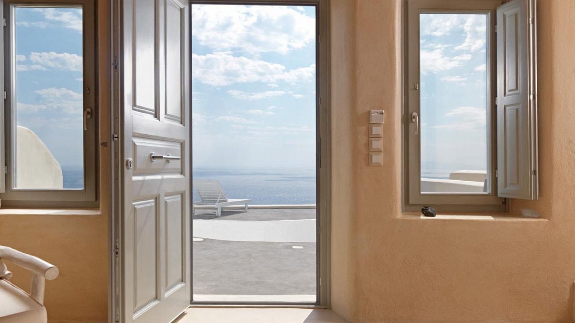 The exquisite living room opens out to the private veranda where the newlyweds can relax and be swept away by the aura of the scenery and the breathtaking panoramic views of the Aegean.