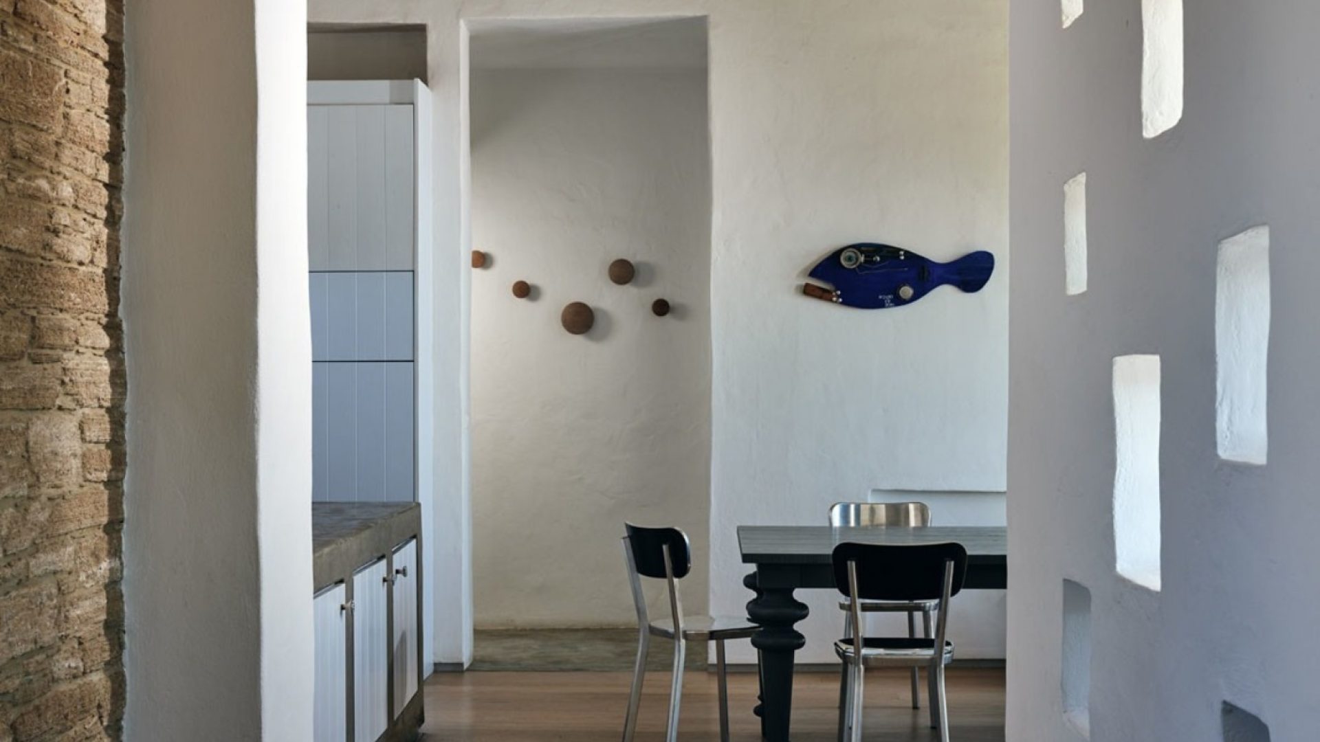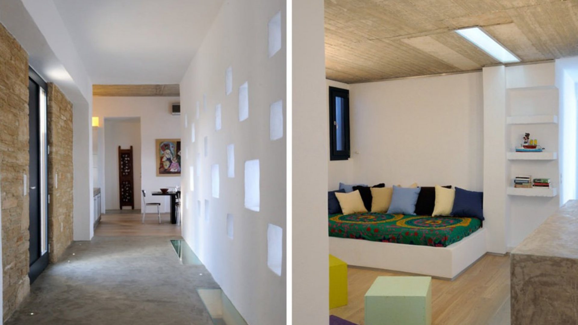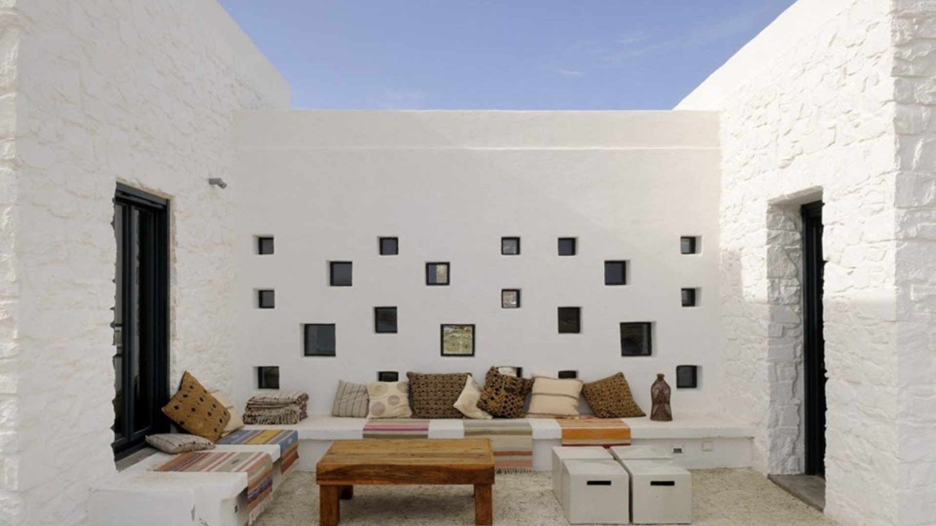 An interesting patio with a comfortable set of built-in sofas with colorful cushions highlights the arty white-washed wall with its several small windows.