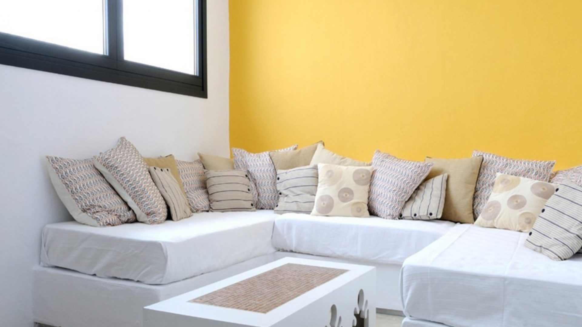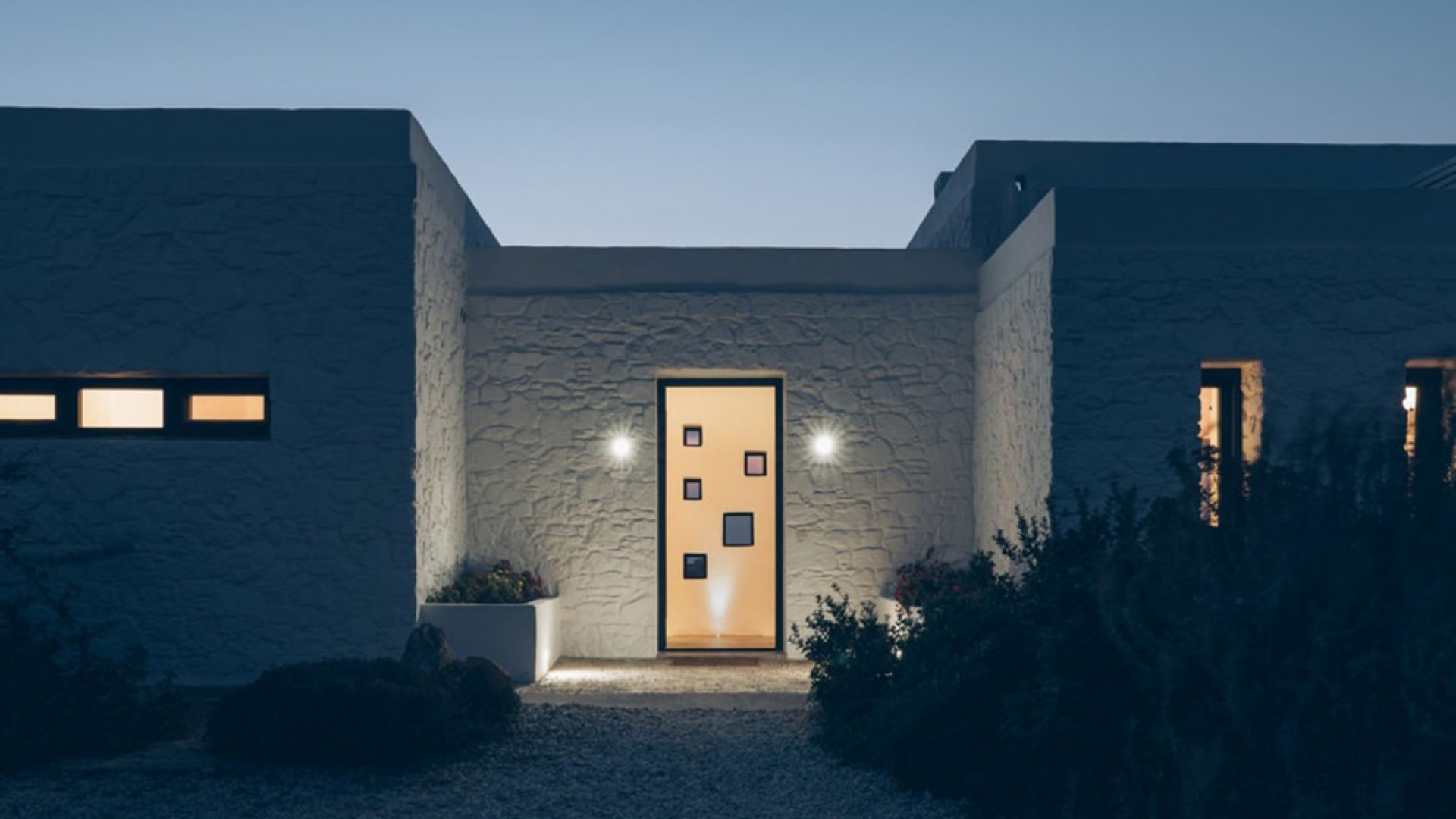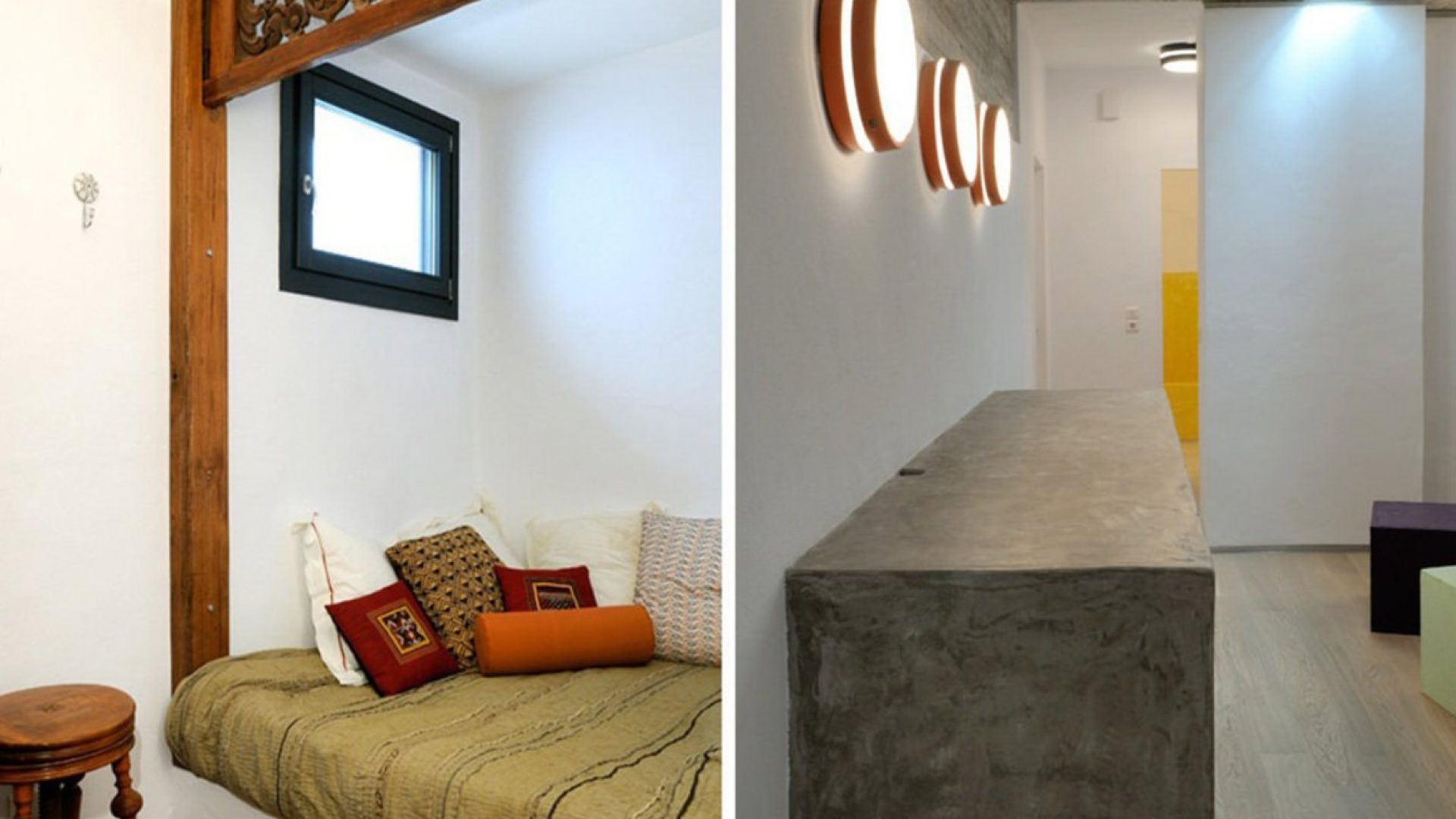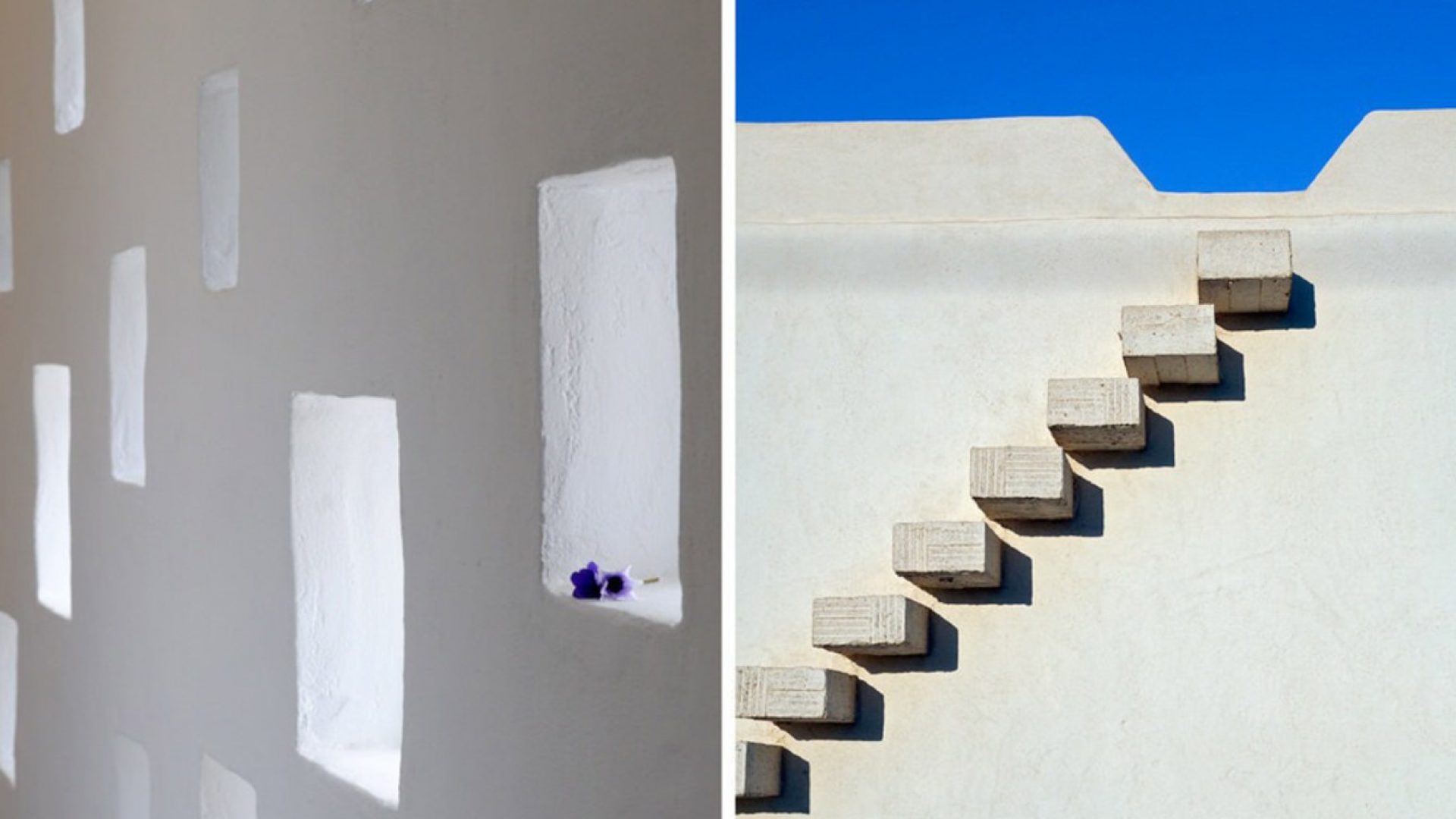 An interesting patio with a comfortable set of built-in sofas with colorful cushions highlights the arty white-washed wall with its several small windows.