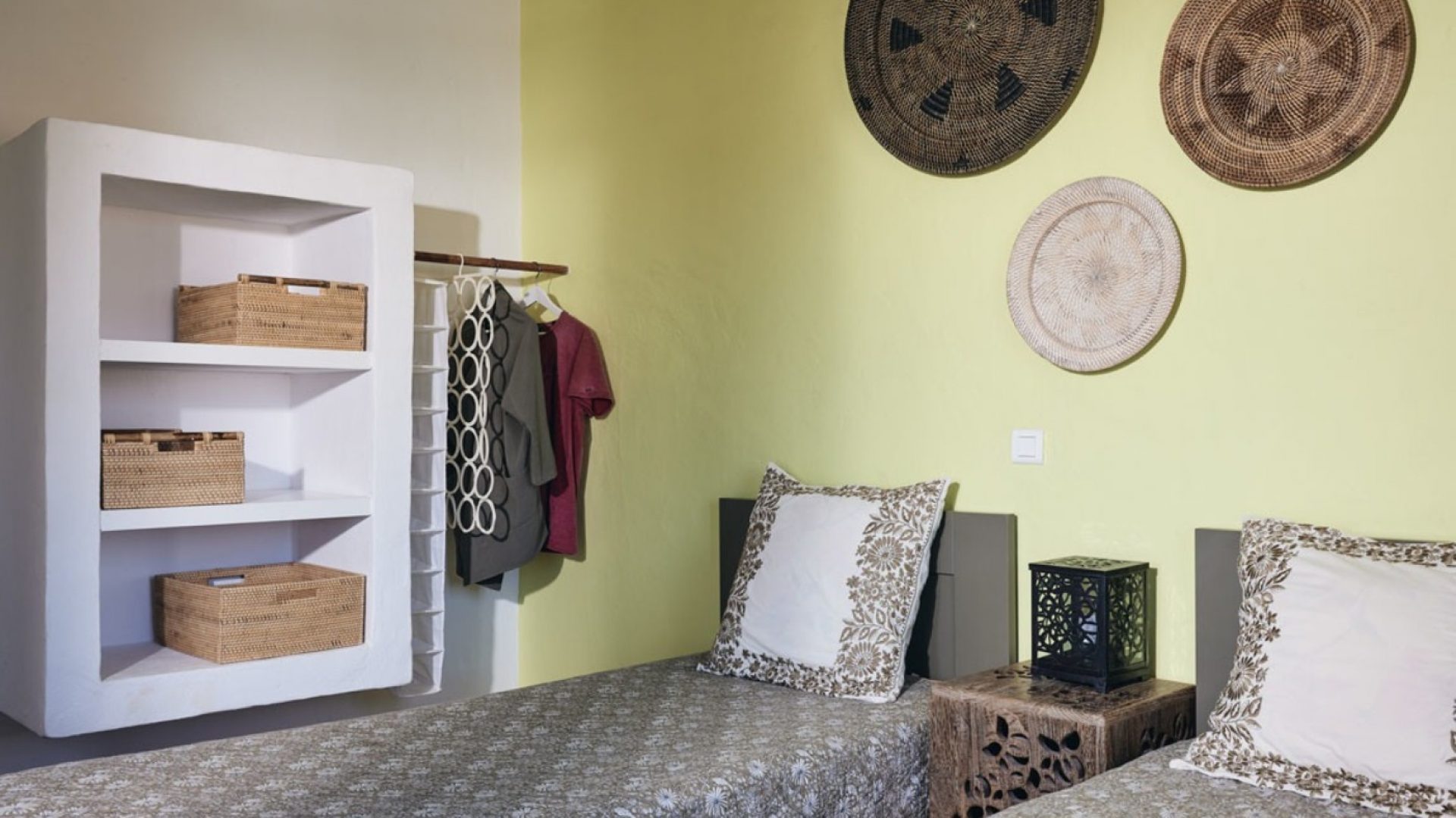The living room with the fireplace is bright and airy, featuring a sophisticated blend of traditional island style and modern touches. The bedrooms are comfortable and cozy, with colorful, funky accessories that add a personal touch.