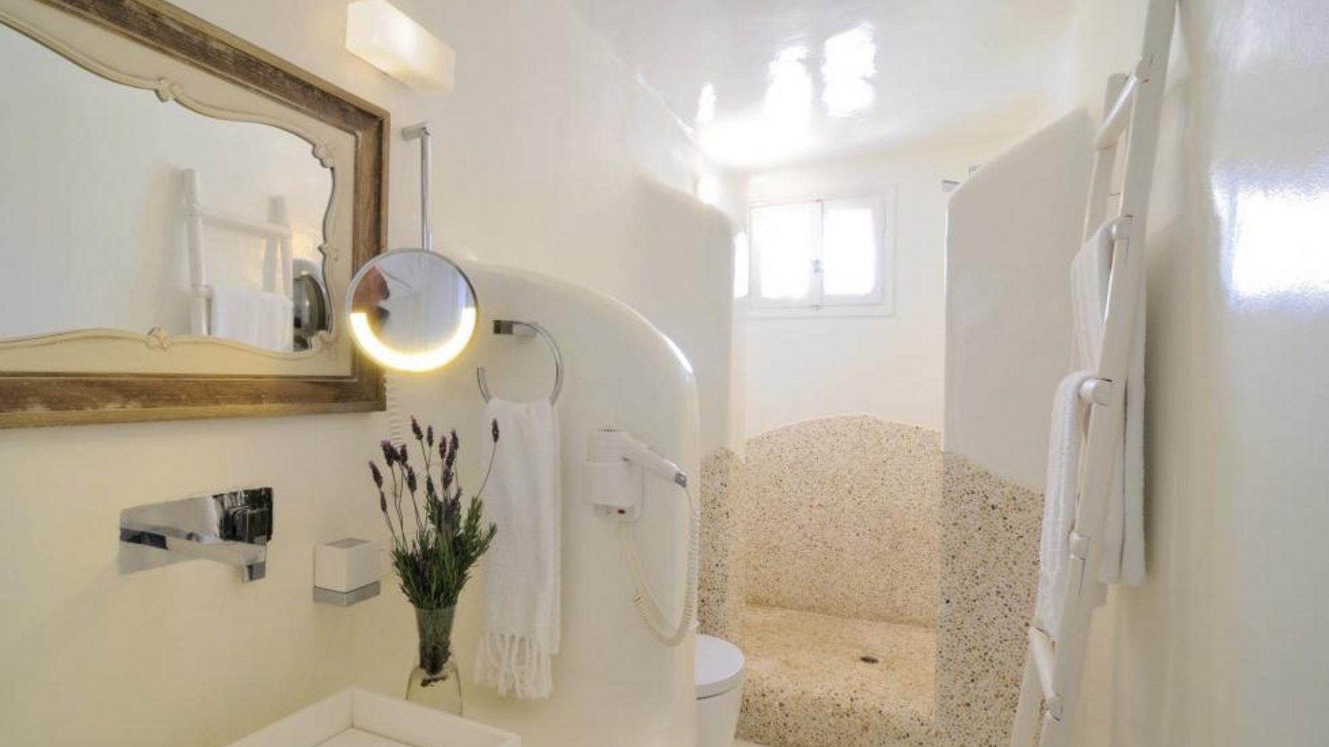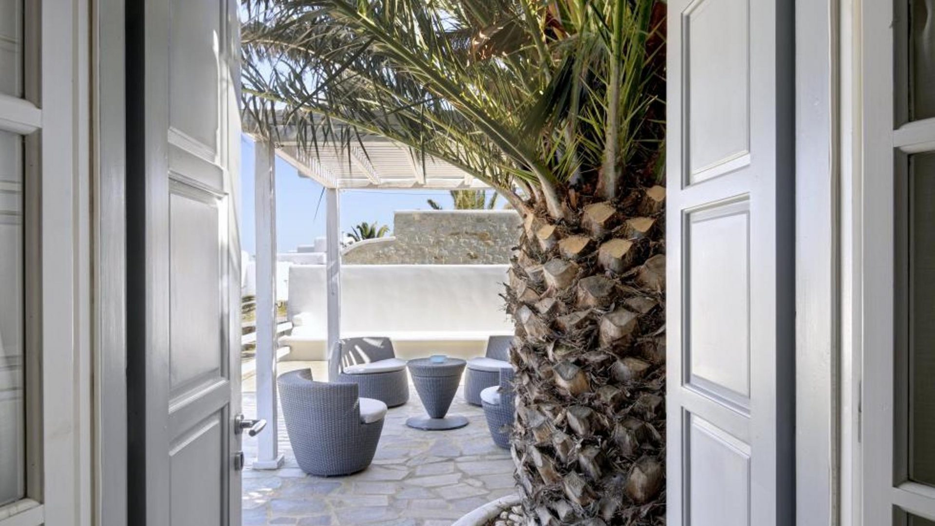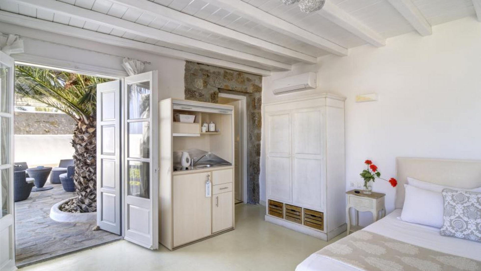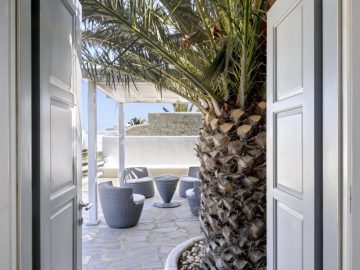 Located 200 m from the beach, this 40 sqm suite, airy and light with large windows and glazed double doors opening onto covered and uncovered terraces all independent, giving a combination of privacy and accessibility. Cool colored walls and floors add to this, and the contemporary furnishings blend beautifully, as do the contemporary mixture of dreamy Mediterranean colors.