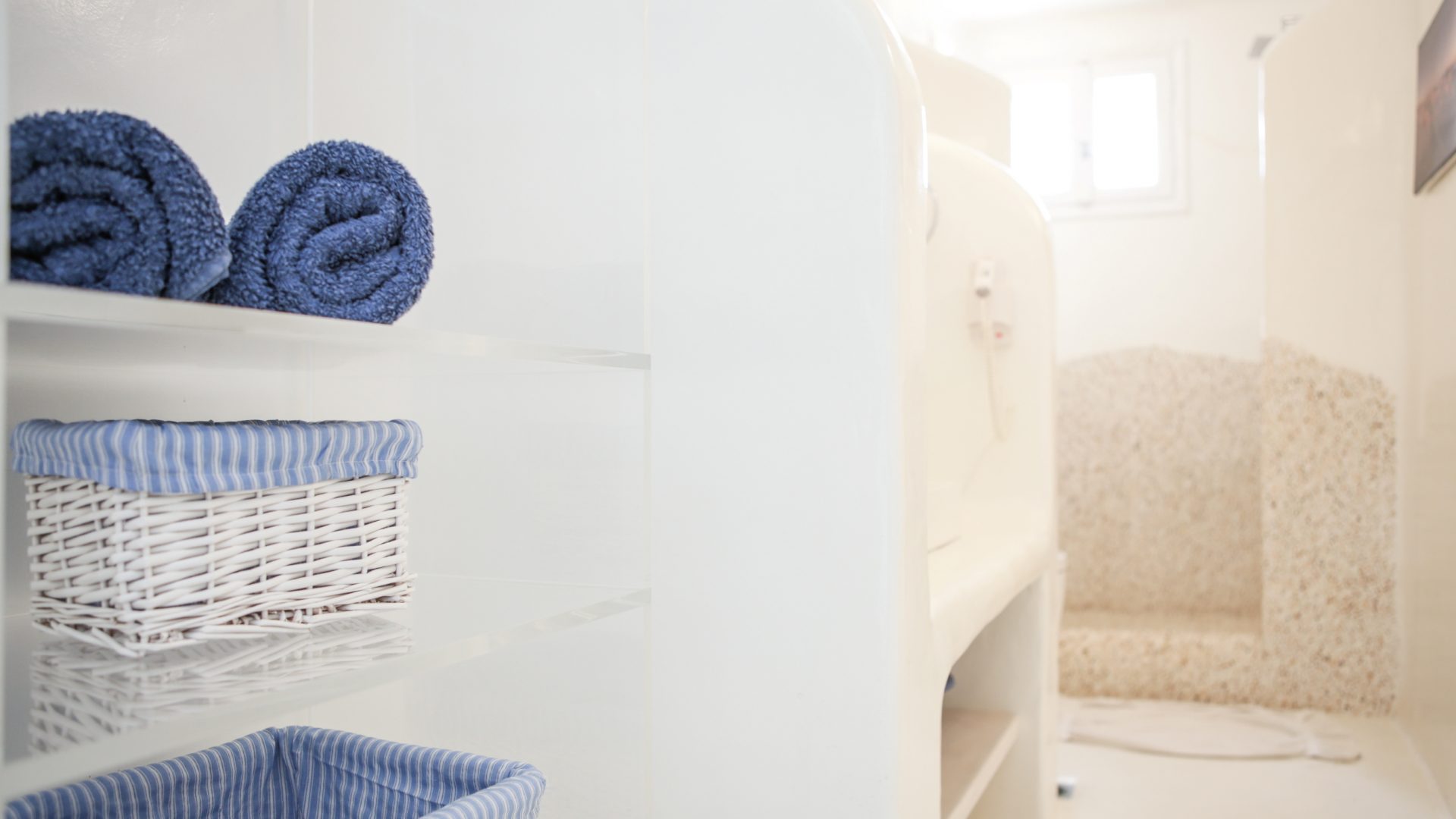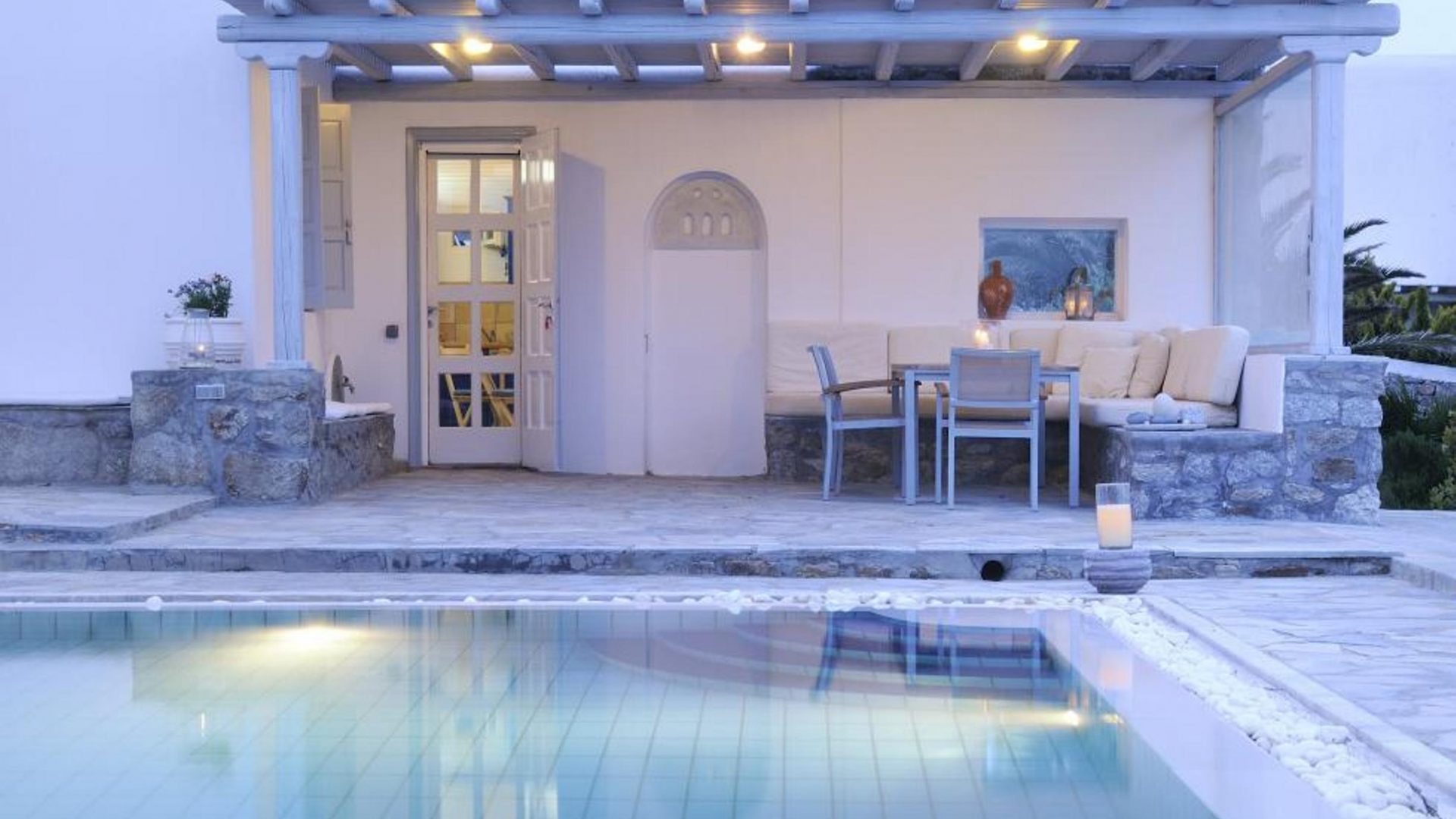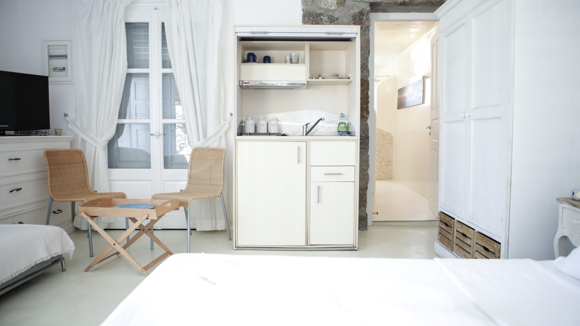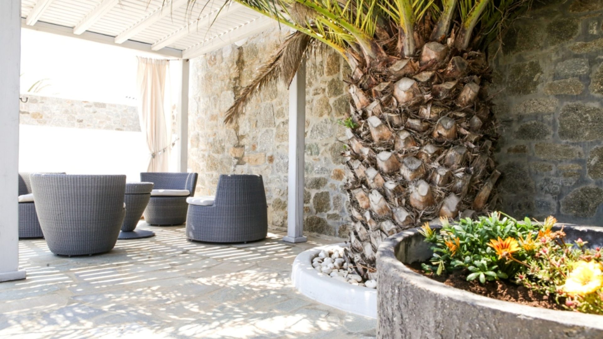 Located 200 m from the beach, this 40 sqm suite, airy and light with large windows and glazed double doors opening onto covered and uncovered terraces all independent, giving a combination of privacy and accessibility. Cool colored walls and floors add to this, and the contemporary furnishings blend beautifully, as do the contemporary mixture of dreamy Mediterranean colors.