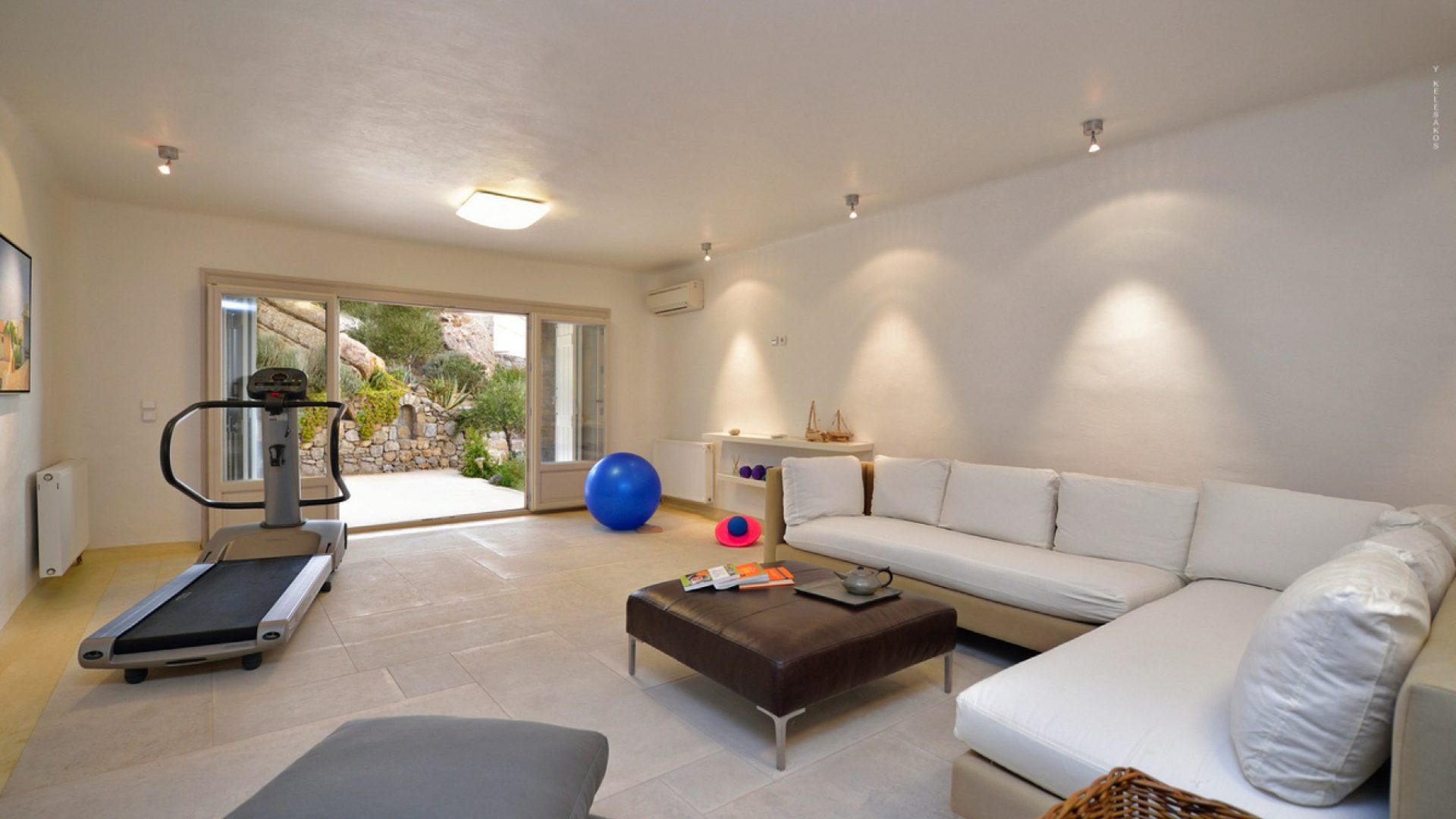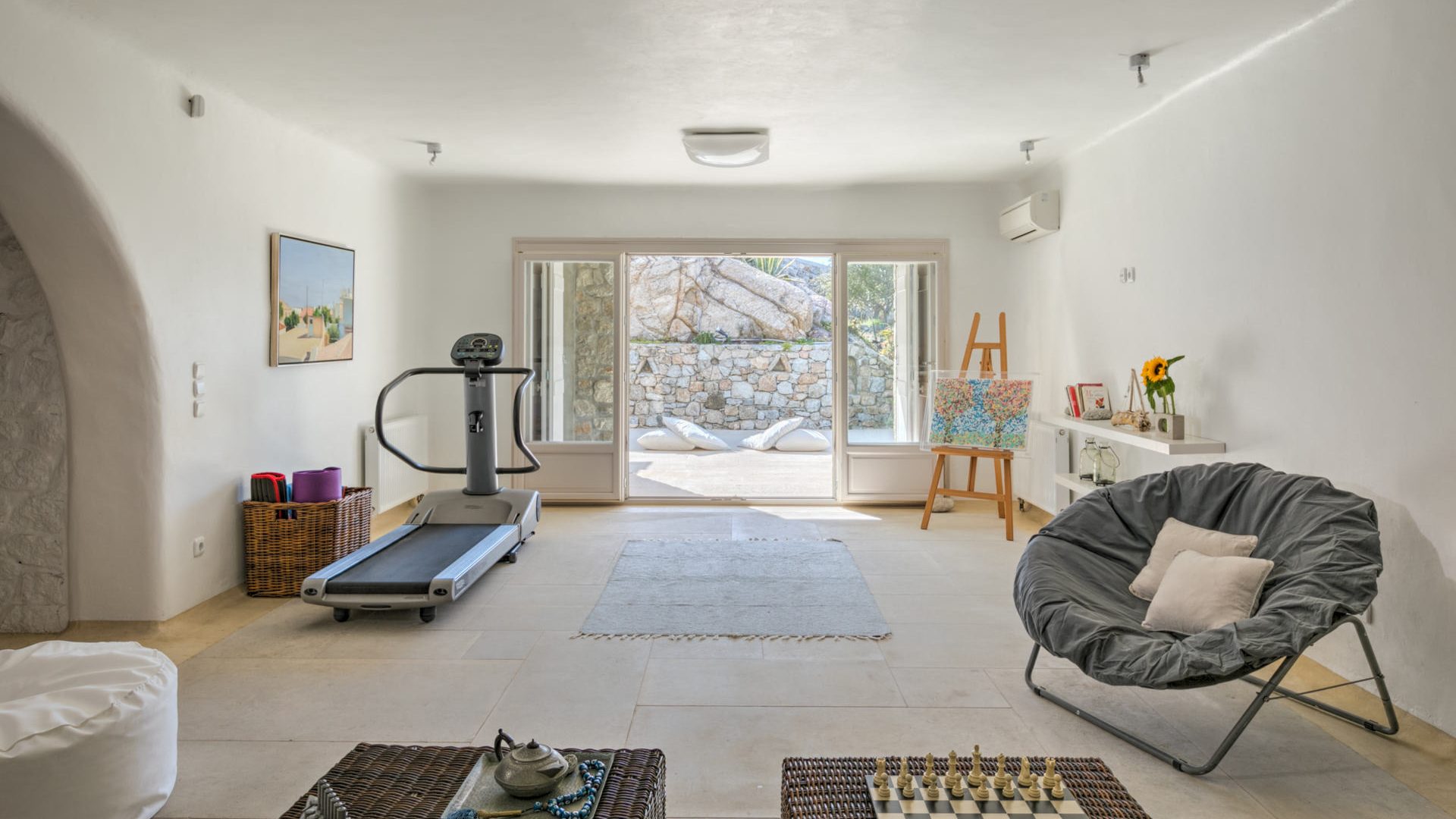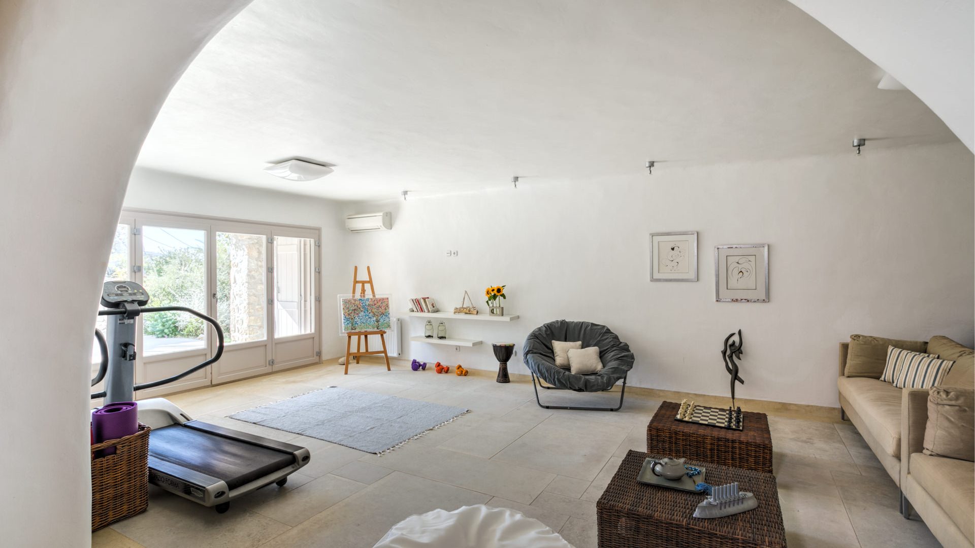 Fitness room with Treadmill and Elliptical machine by Technogym and free weights