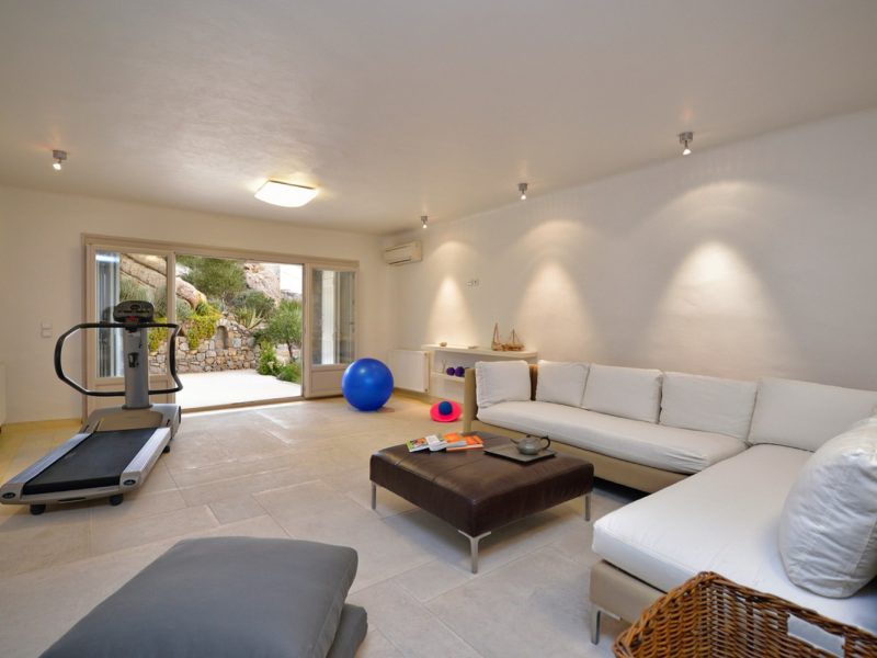 Fitness room with Treadmill and Elliptical machine by Technogym and free weights