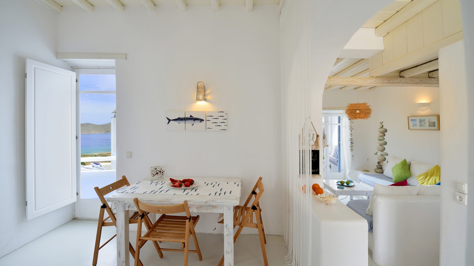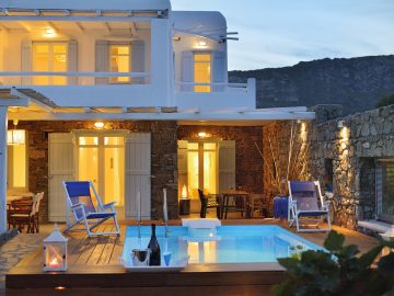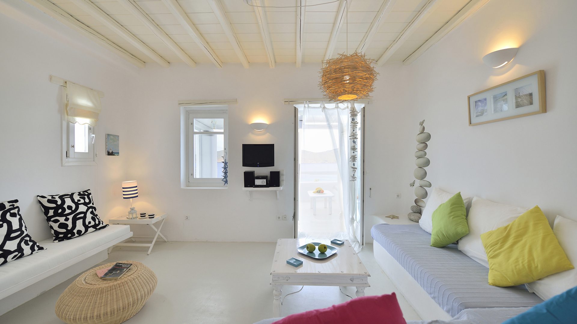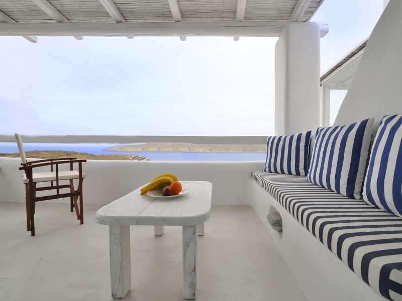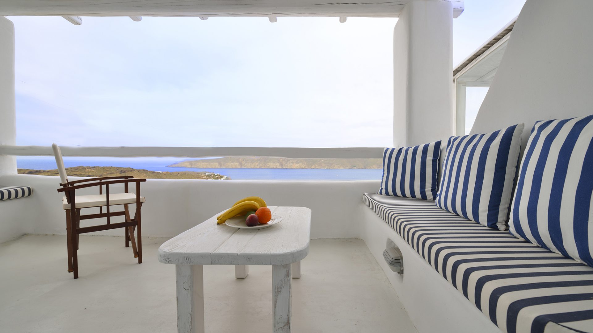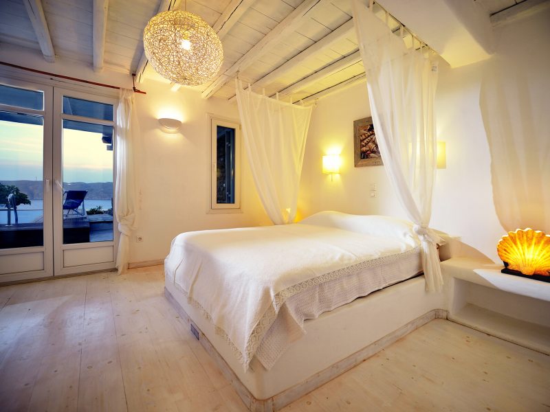 A private complex located in Panormos, with exceptional Myconian architecture, combining tradition and modern design, offers a panoramic view of the Aegean Sea, is a perfect place to relax and enjoy a wonderful staying in Mykonos. The view is unhindered and gazes at one of the best beaches of Mykonos, Panormos, where you can have a good time until late, at the three beautiful Bars and Restaurants, and enjoy the music of the DJ.